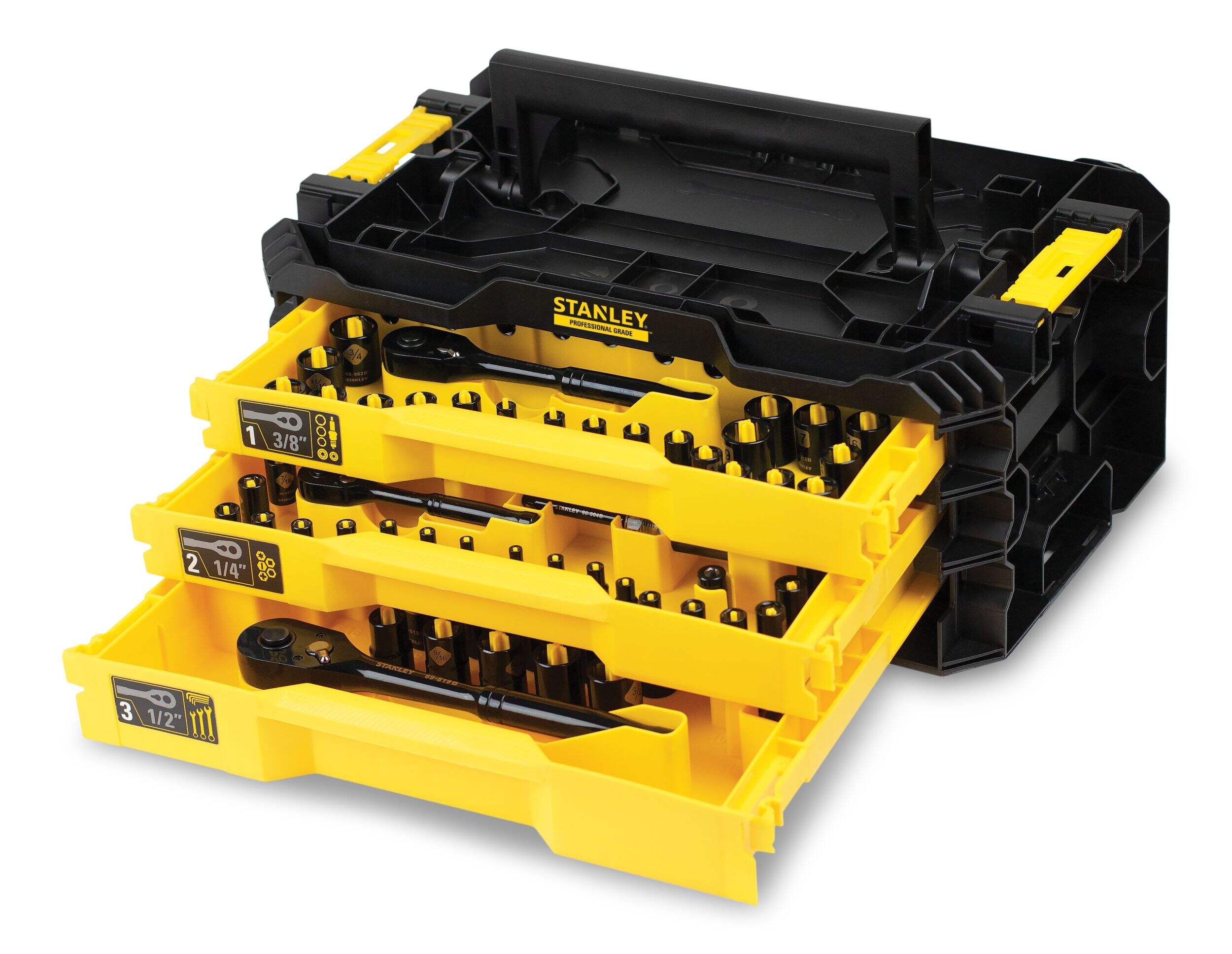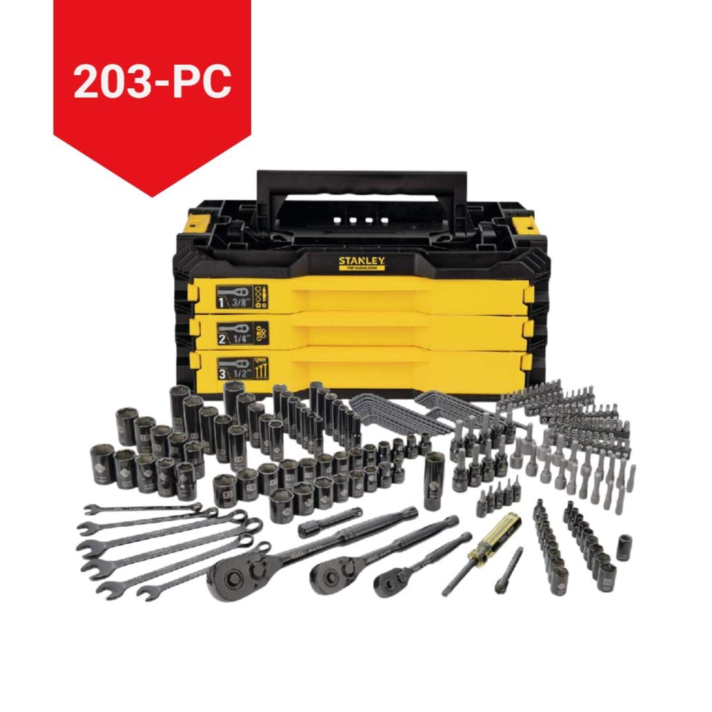 The Stanley Professional Grade Black Chrome Socket Set delivers the quality and versatility needed for various professional repairs. This set includes ergonomic ratchets, hex keys, extensions, and more in both SAE and Metric sizes. Each piece is laser-etched with high-contrast markings to simplify identification. Equipped with a lifetime exchange warranty, this set is crafted for long-term reliability and performance.
