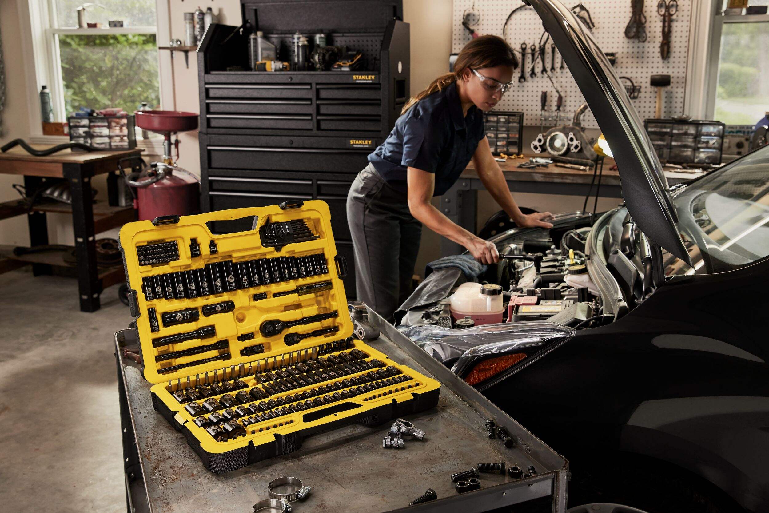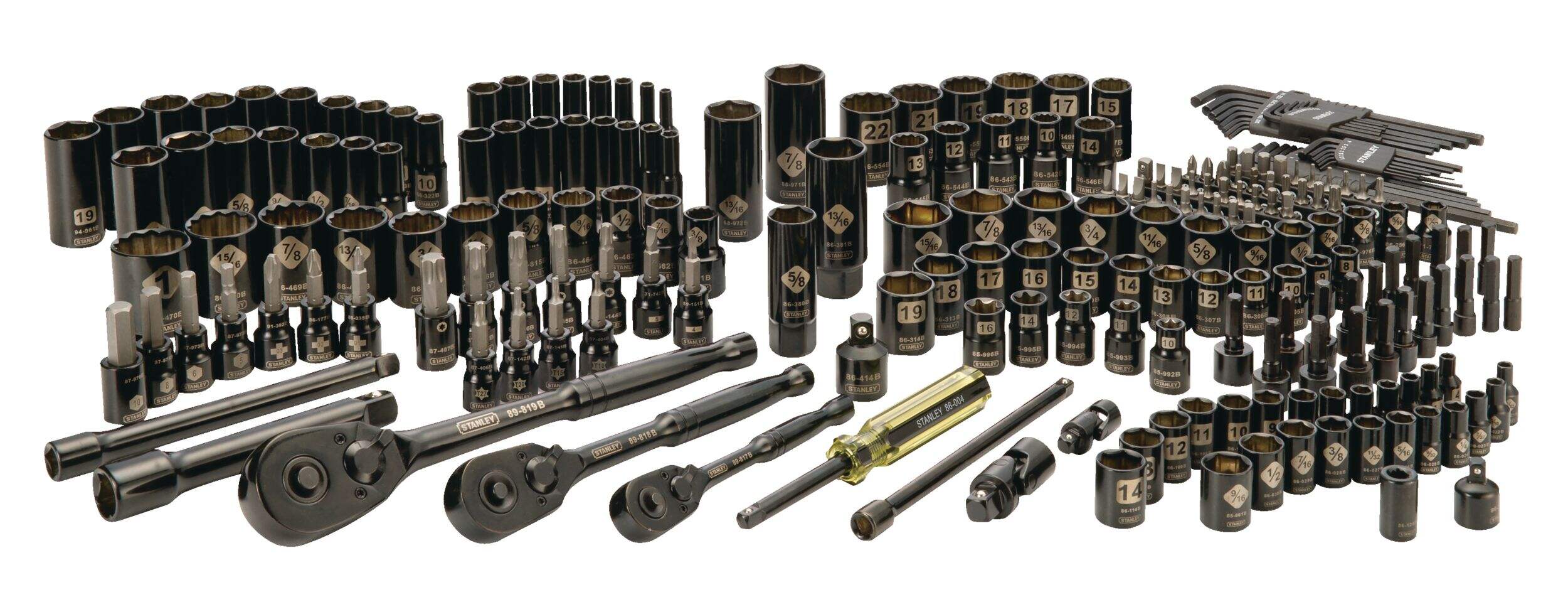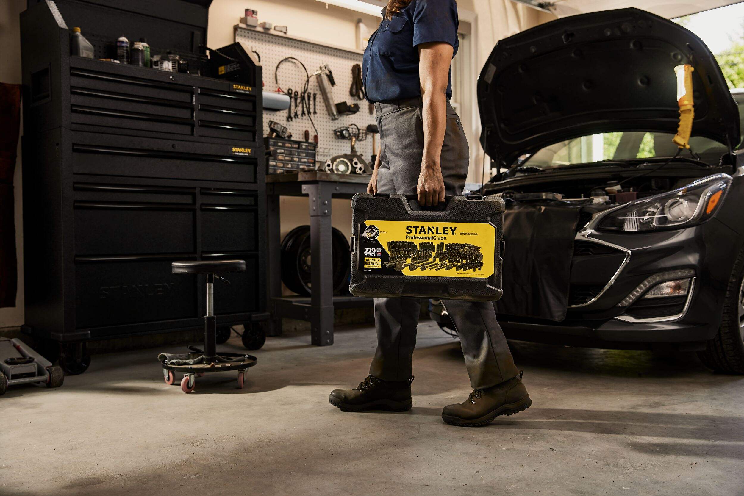 The Stanley Professional Grade Black Chrome Socket Set is a comprehensive, durable set perfect for automotive and household repairs. Equipped with laser-etched markings for easy identification, this set includes 1/4", 3/8", and 1/2" ratchets. With a range of sizes in SAE/Metric, it’s built for versatility and efficiency. Stay organized and work faster with Stanley’s quality assurance and lifetime exchange warranty.