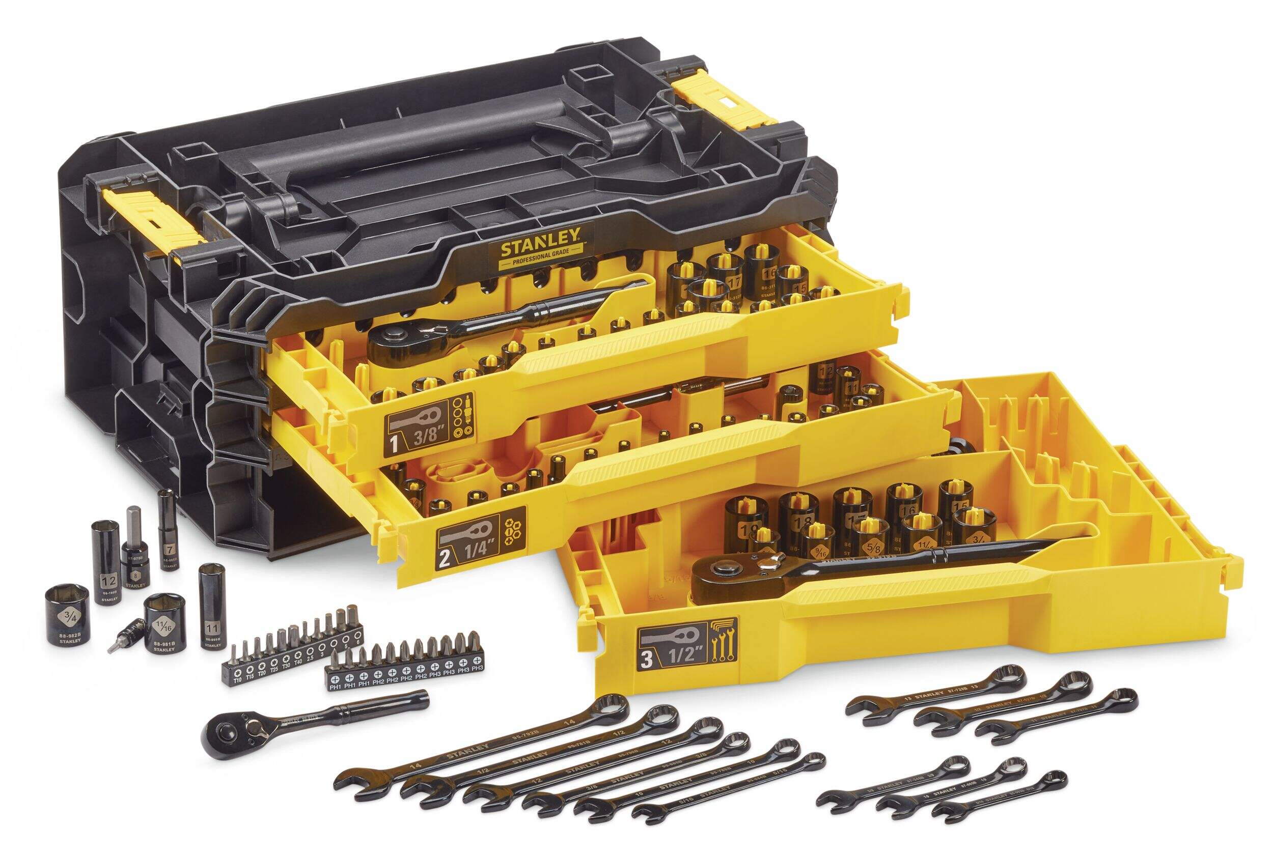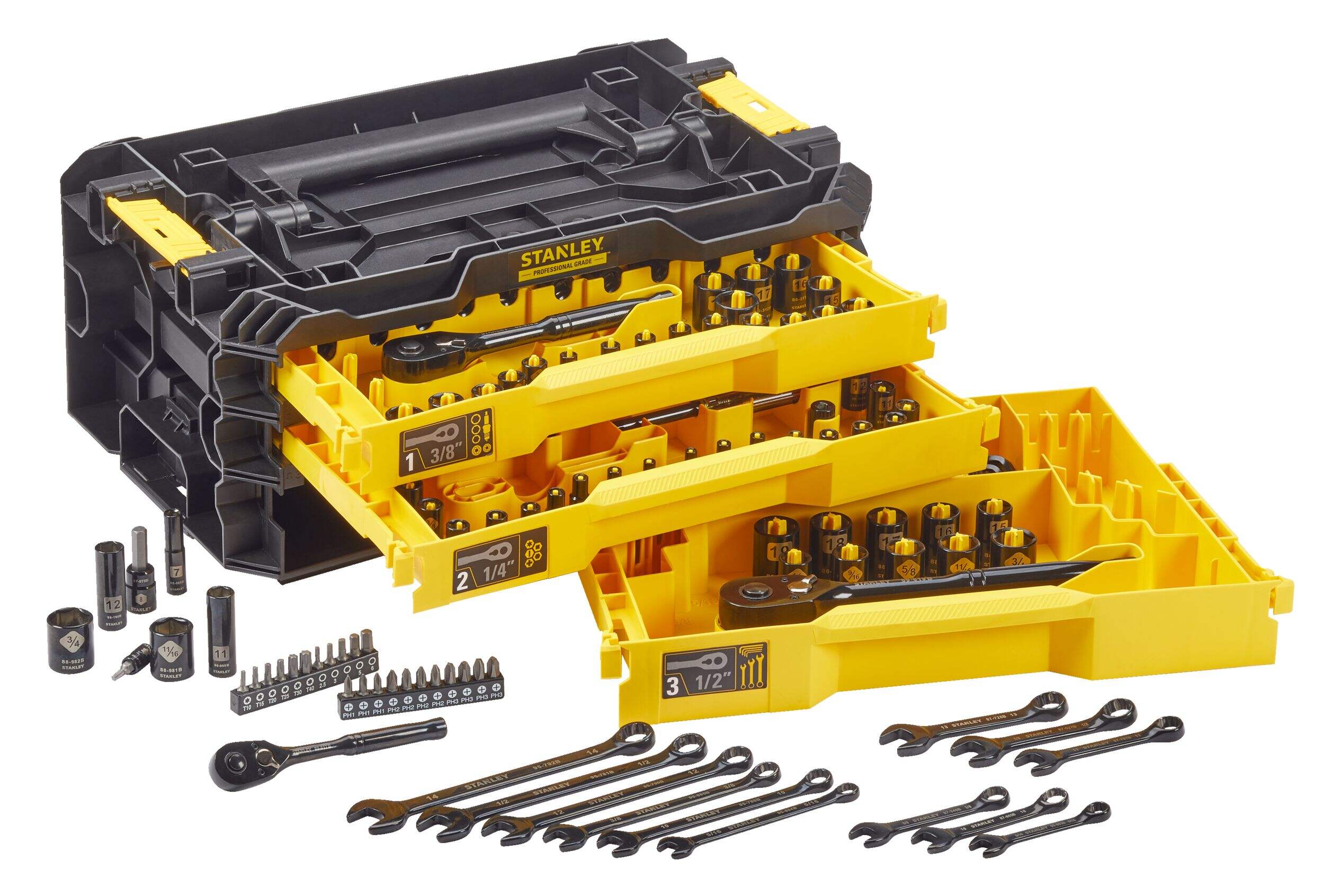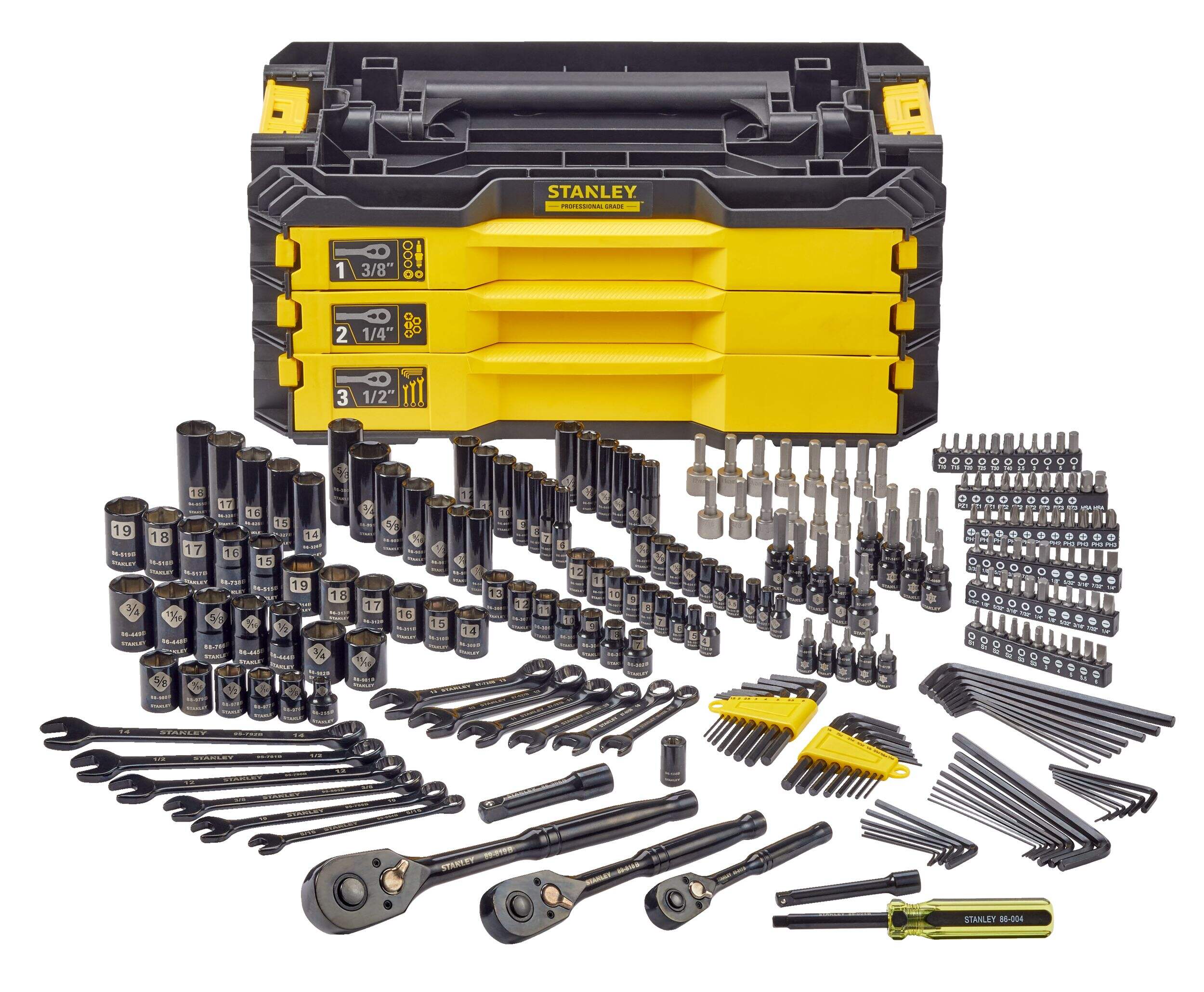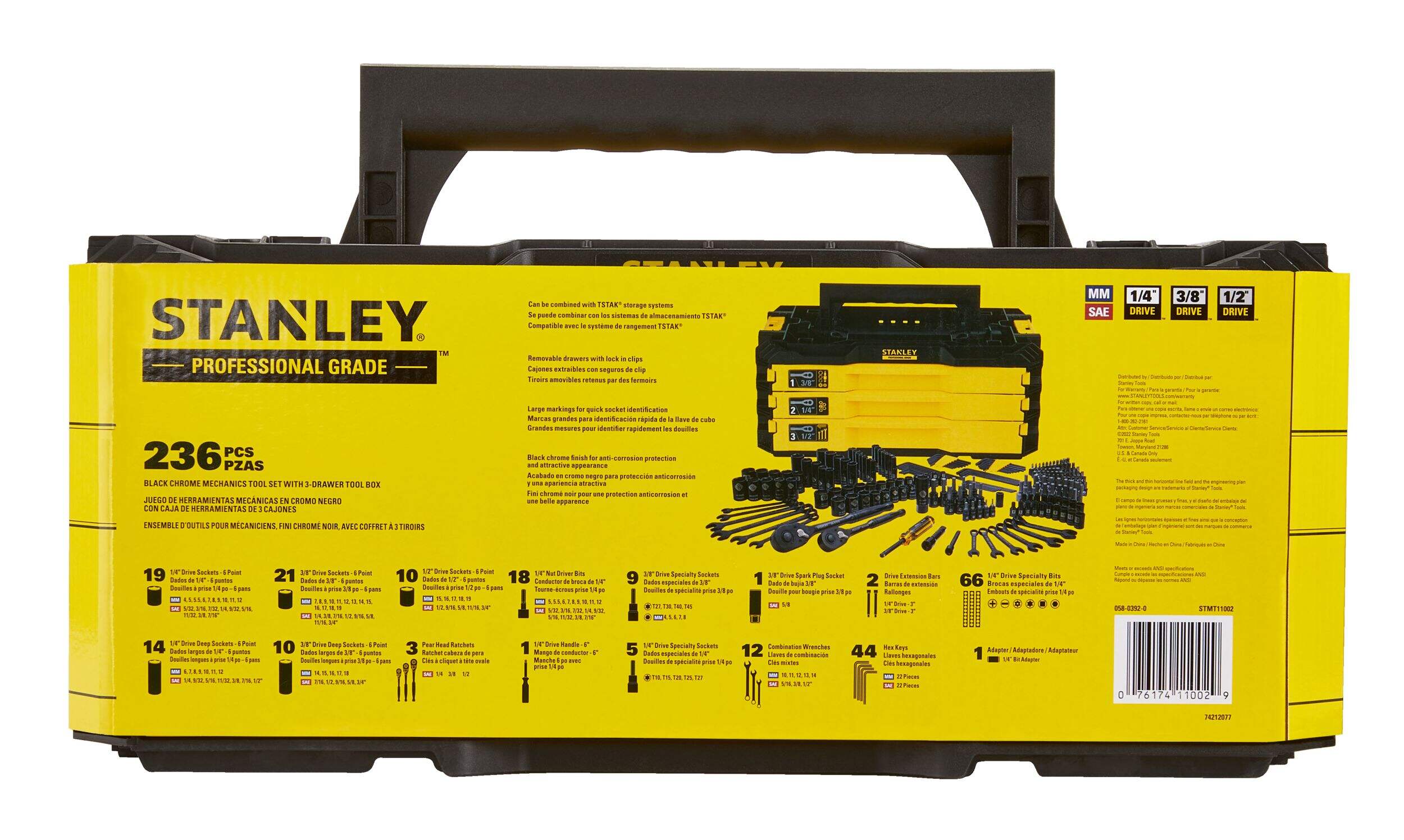 Master any nut or bolt with the Stanley Professional Grade Chrome Socket Set, SAE/Metric. This quality tool set helps you complete almost any residential fix or auto repair job. The versatile socket set allows you to work with a variety of sizes, and the pieces feature high-contrast markings for quick and accurate identification. This durable set resists rust and comes in a plastic case to keep it all organized. A practical addition to any garage or workshop, this comprehensive set contains 236 pieces.