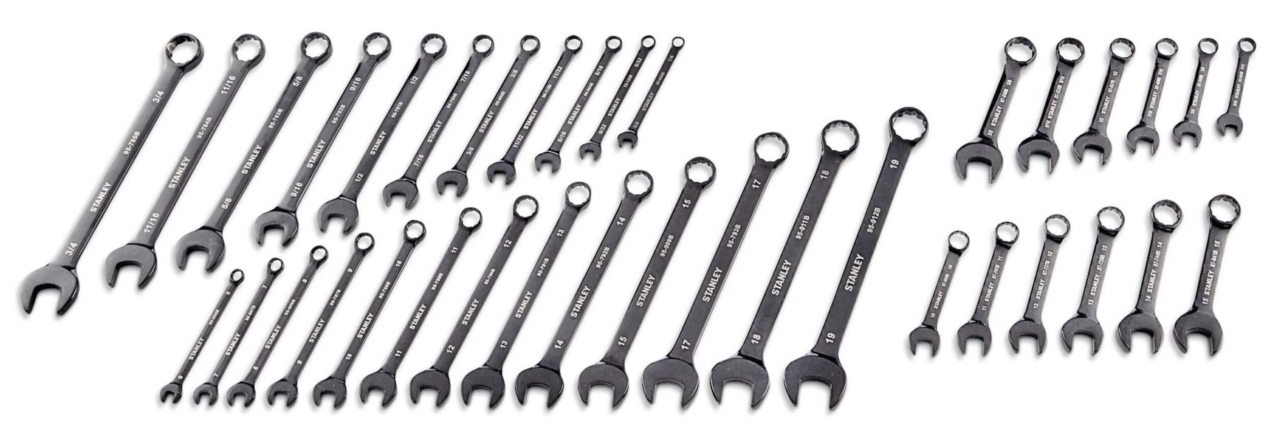 Includes stubby wrench sizes in 5/16", 3/8", 7/16", 1/2", 9/16", 5/8" and 10, 11, 12, 13, 14, 15 mm