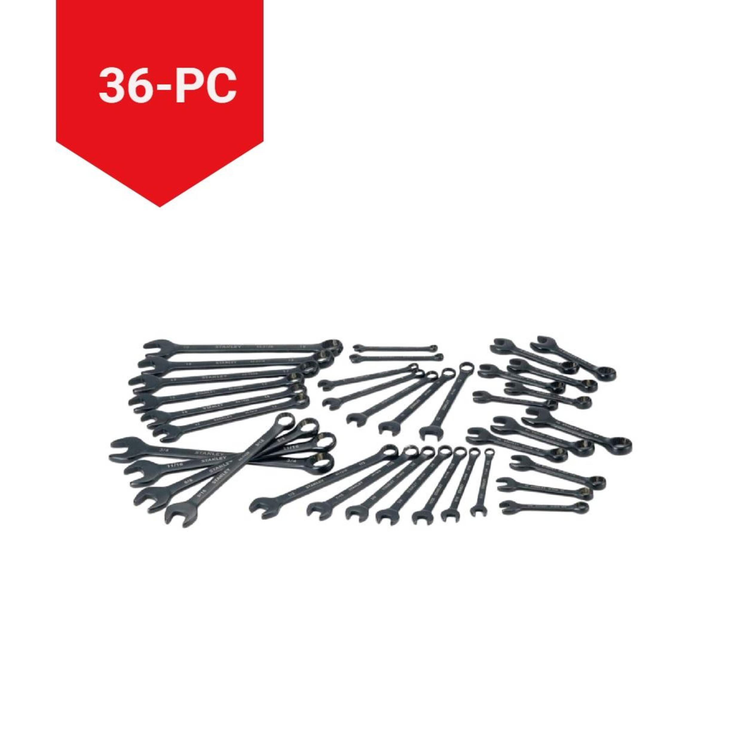 The Stanley Professional Grade Combination Wrench Set features a design that minimizes slippage for efficient fastening. The black chrome finish not only gives it a classic look but also enhances durability and prevents corrosion, extending the tool's lifespan. Ideal for both professional and DIY use, the wrench set offers reliable performance and durability during tough jobs.