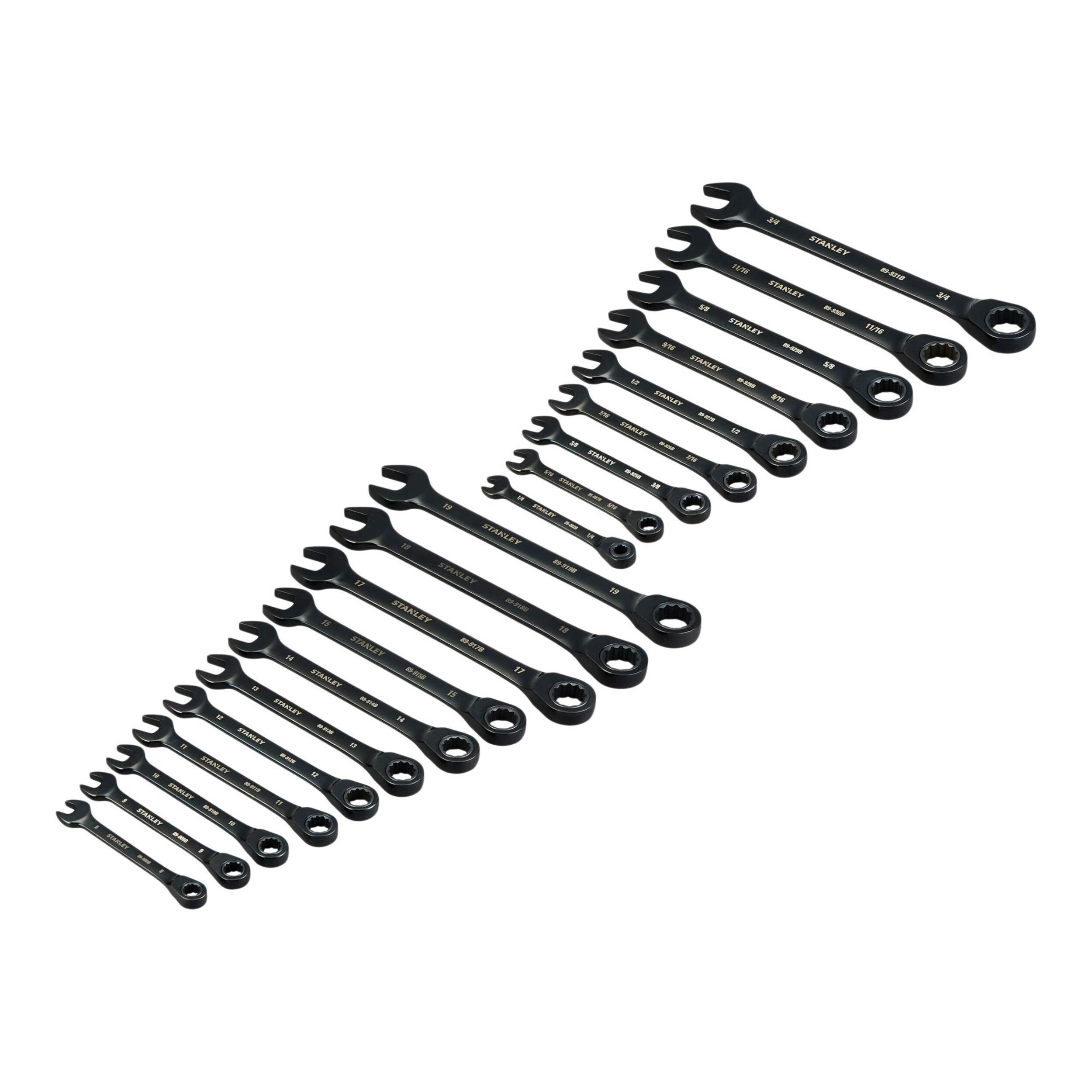 Containing a mixture of metric and SAE wrenches, the Stanley Ratcheting Wrench Set makes an essential addition to any toolkit. Designed for precision and durability, this 20-piece set ensures you have the right tool for any job. The black chrome finish of the wrenches and ratchets inside not only looks sleek, but also provides excellent protection against rust and corrosion.
