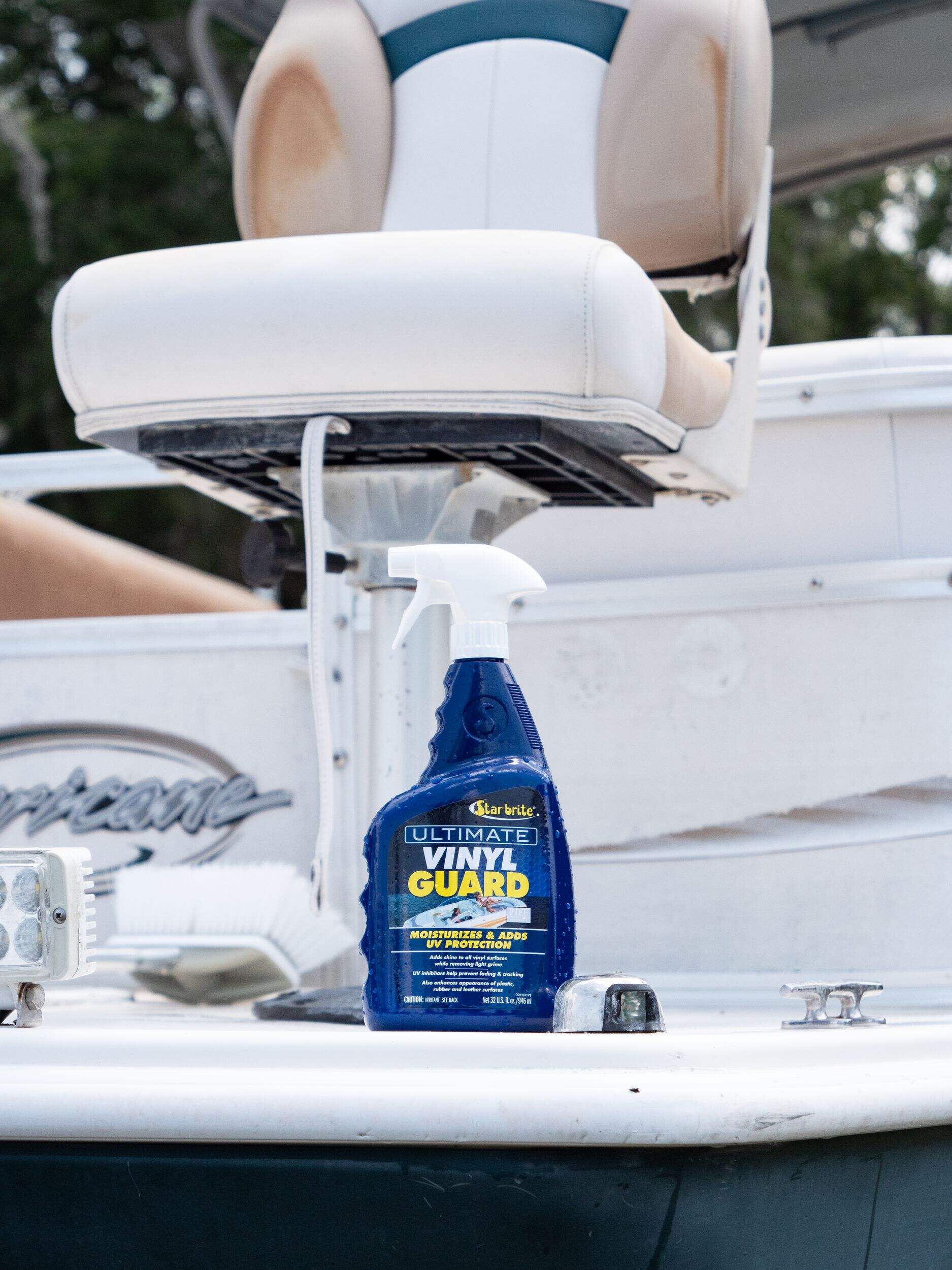 Starbrite Ultimate Vinyl Guard provides exceptional shine and UV protection for vinyl, plastic, rubber and leather surfaces. With simple spray-on, wipe-off application, it keeps new vinyl looking fresh and restores moisture and lustre to older surfaces. The formula offers maximum UV protection, making it perfect for outdoor use. Easily apply with a cloth or spray directly, then wipe off excess to remove dust, dirt, and grime while enhancing the surface's appearance.