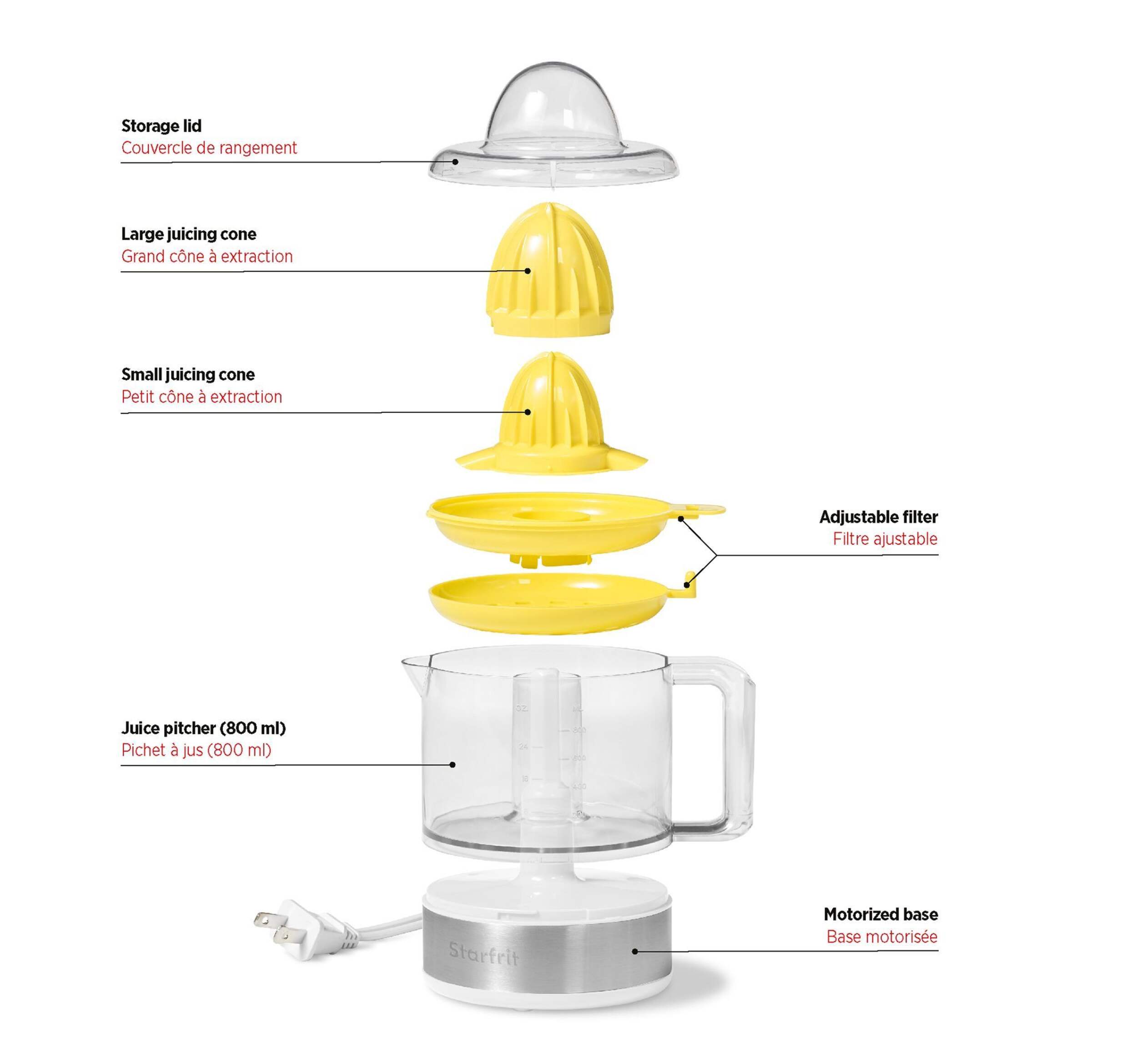 For freshly squeezed juice, the Starfrit New Easy Juicer simplifies your life. To collect juice, simply cut fruit in half and press it onto the unit to extract juice. The juicer also separates pulp and seeds for a smooth result. All parts are removable and dishwasher safe, making cleanup a breeze.