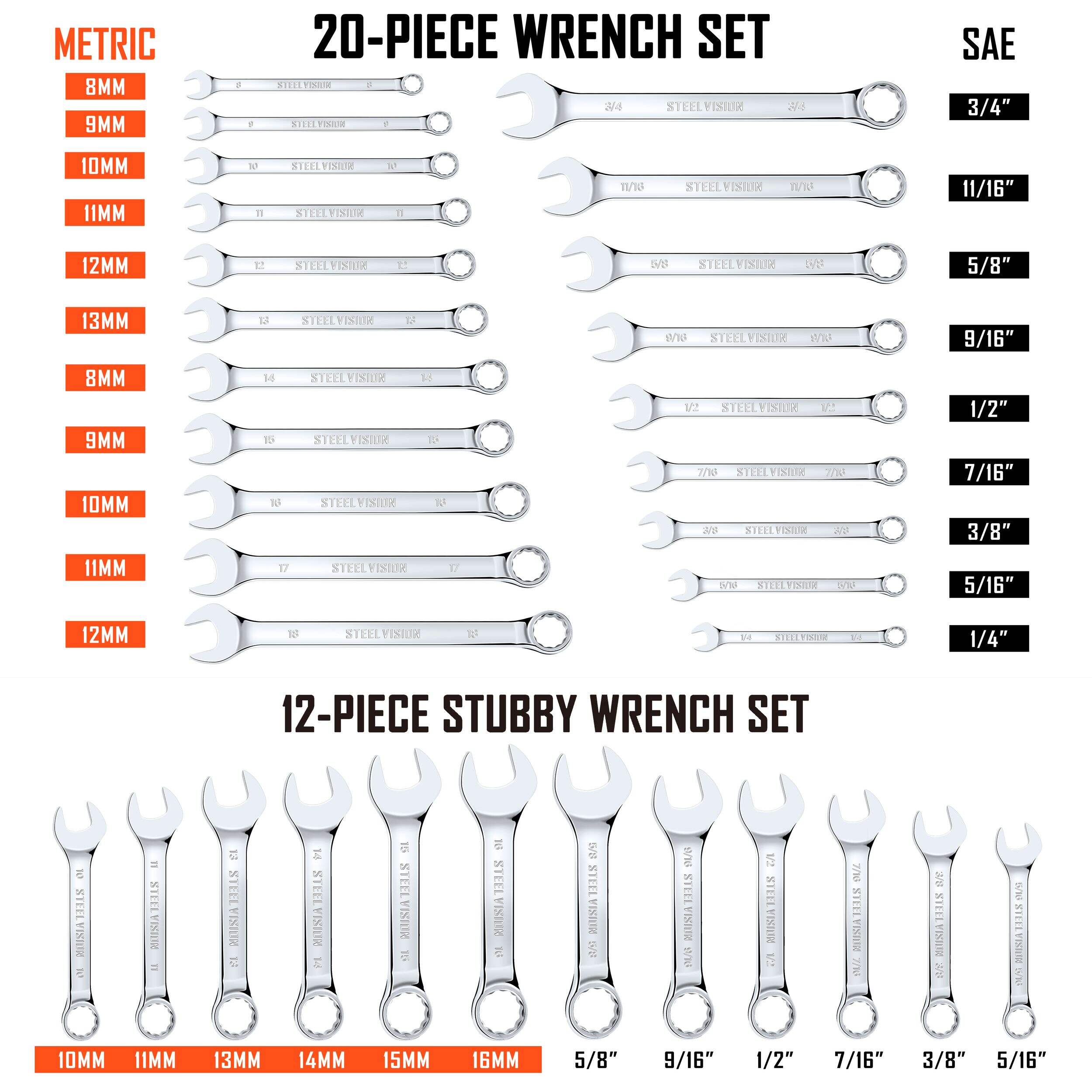Whether you like to tinker in the garage or take on home maintenance chores yourself, this SteelVision wrench set will make the job easier. With almost three dozen sizes to choose from, you’re sure to find the right one for the task. Shorter, longer, metric or SAE, this silver finish wrench set offers a complete selection for the committed DIYer. The alloy steel construction provides extended durability and corrosion resistance for long-term reliability.