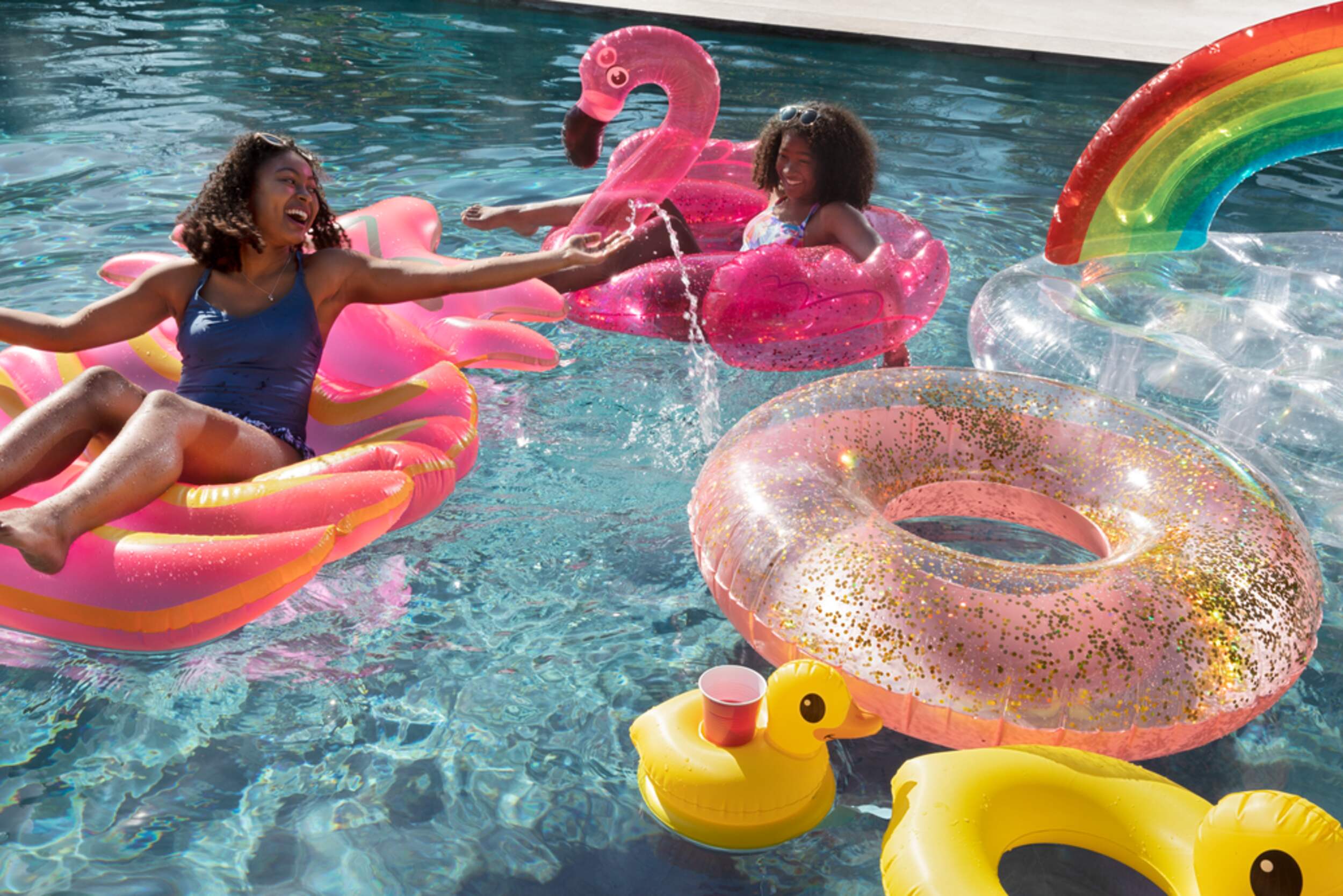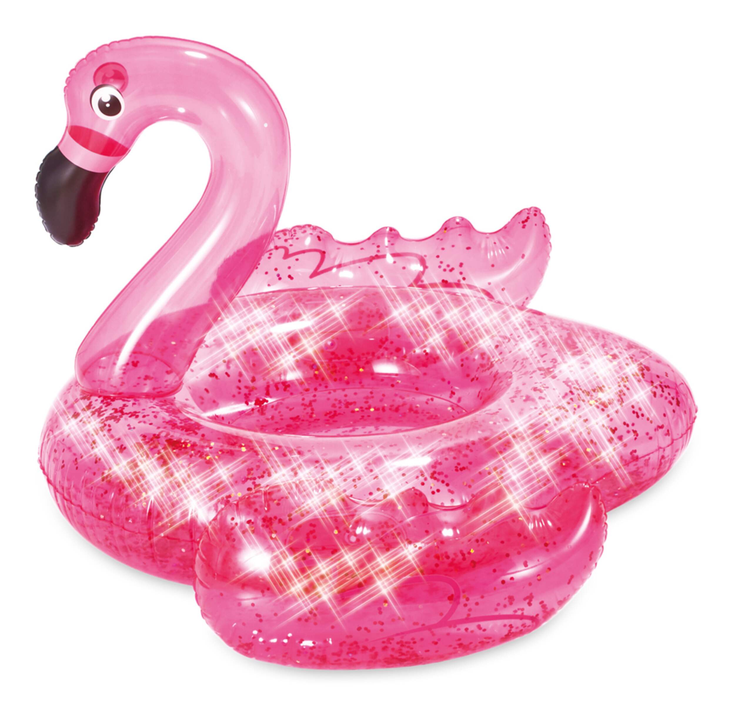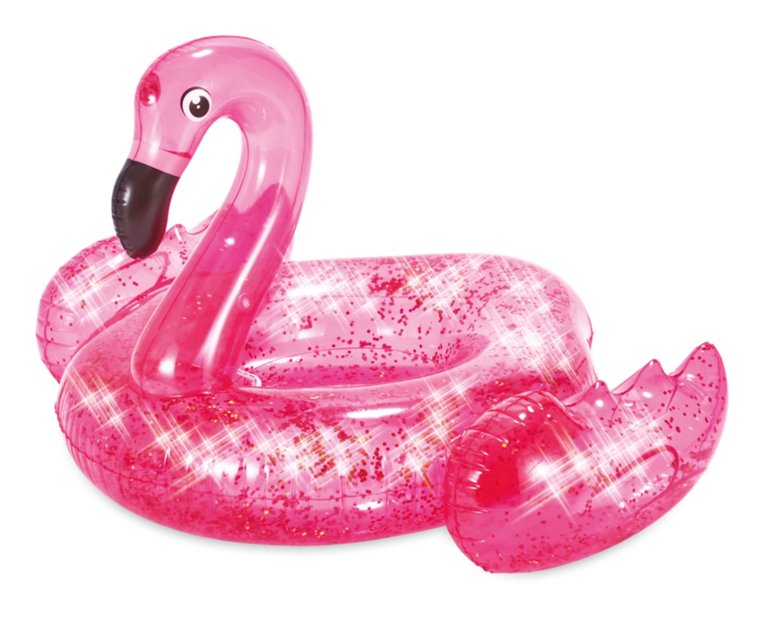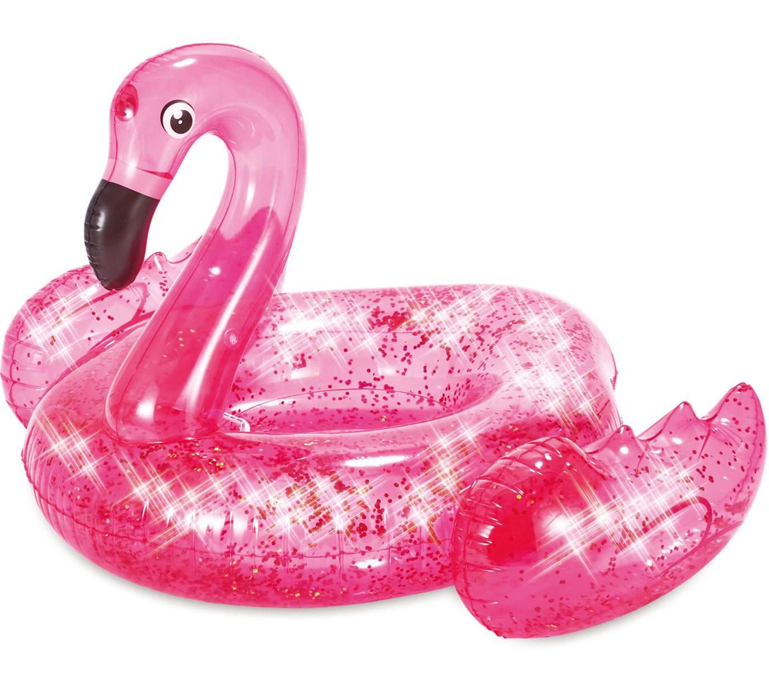 Stella & Finn Flamingo with Glitter Confetti Inflatable Pool Float features a transparent design with glitter confetti inside that sparkles and shines under the sun