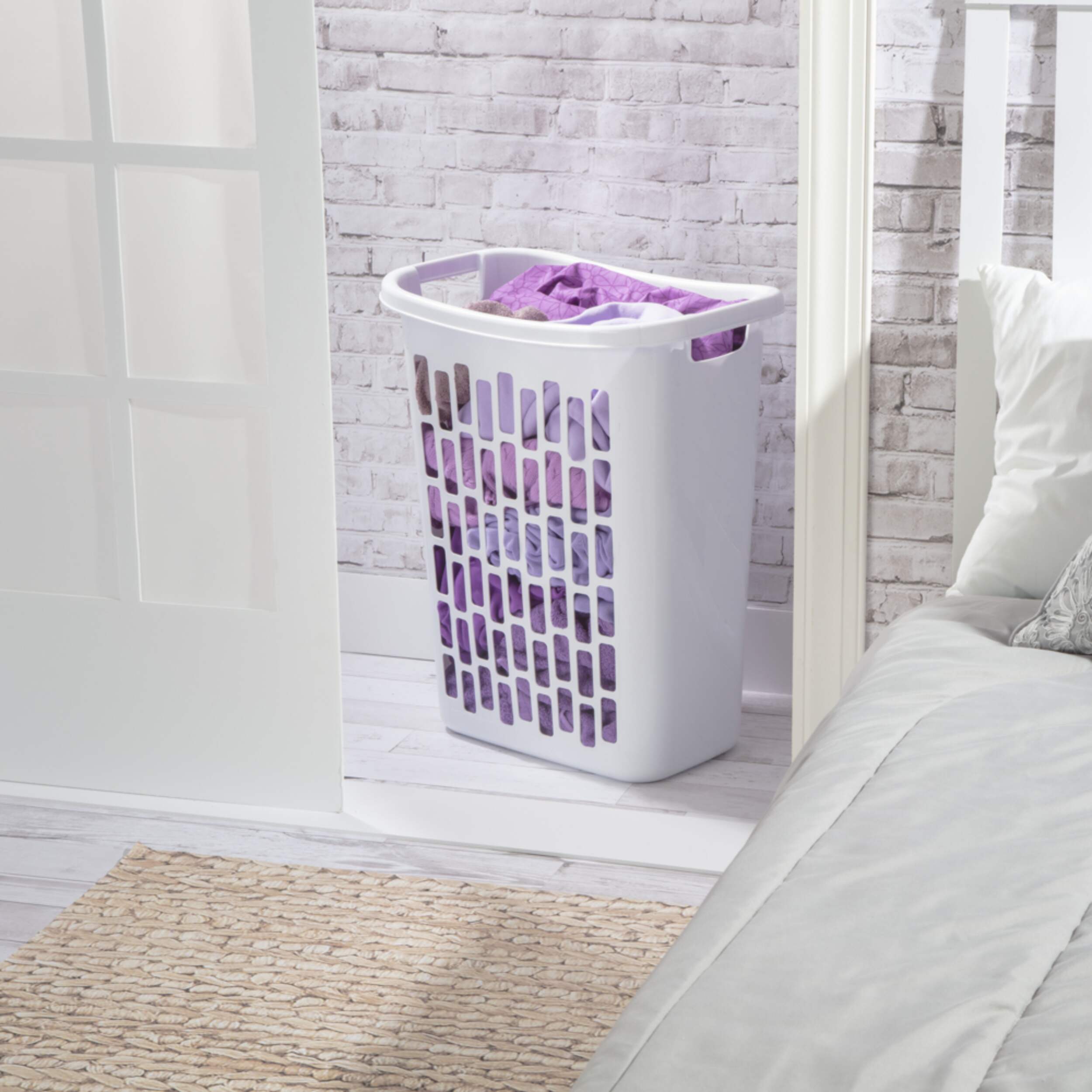 The Sterilite Rectangular Open Hamper features a slim profile and a generous 1.8 bushel capacity, making it an ideal solution for large families looking to save some space. A contemporary hole pattern throughout the hamper provides ample ventilation for dirty laundry, while a wide opening allows for quick and easy access when loading and unloading clothes. This hamper features two through handles integrated into the reinforced rim that offer a comfortable grip surface for lifting and carrying. Its sleek, rectangular profile takes up minimal floor space, making it ideal for apartments, dorm rooms, or for transporting clothes between locations. A polished finish allows for easy cleaning and ensures this laundry hamper fits in with any home décor. The overall assembled dimensions of this item are 20" L x 13 1/8" W x 24" H.