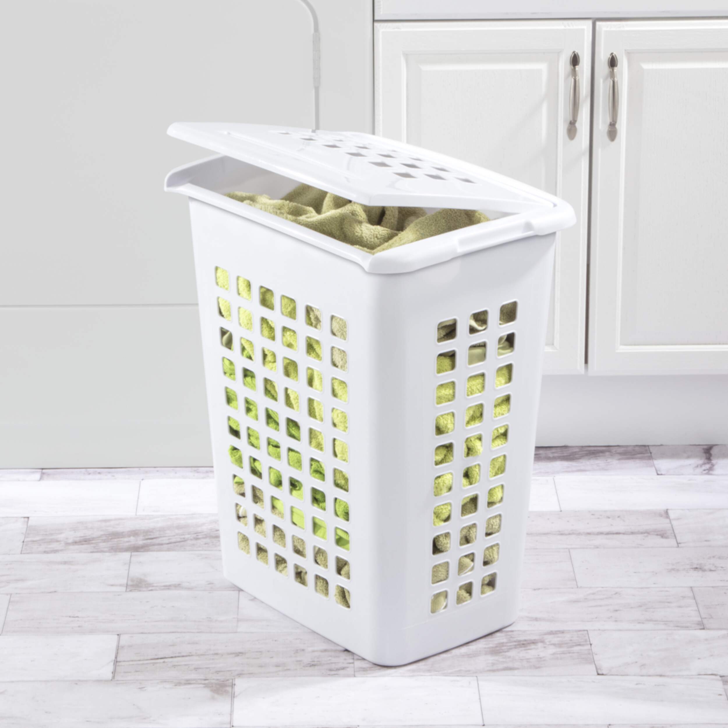 Laundry day just got easier with the Sterilite Rectangular LiftTop Laundry Hamper. This hamper features a contemporary look and feel with a polished finish that is easy to clean. It is designed with a slim profile that takes up minimal floor space yet will hold plenty of laundry. The lift-top lid keeps clothes contained and concealed and will stay open for easy loading and unloading. For situations where the hamper needs to be moved, integrated handles on each side provide a comfortable gripping surface for easy lifting and carrying. The sturdy rim offers added strength, while the stylish, square hole pattern provides ventilation for dirty laundry and helps eliminate excessive odors. Its sleek, rectangular footprint efficiently uses valuable floor space, making it ideal for apartments, dorm rooms, bedrooms and bathrooms. The overall assembled dimensions of this item are 19 1/8" L x 13 3/4" W x 22 7/8" H.