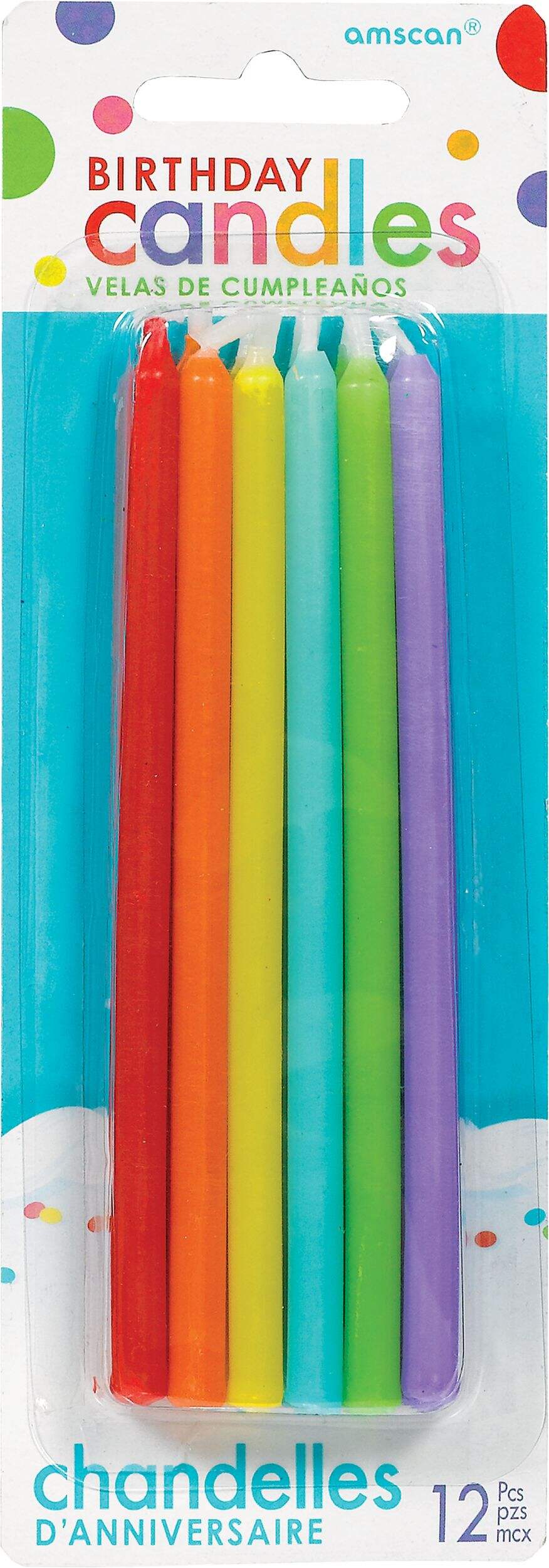 Make a special wish for your next birthday with the Amscan Tall Multicolour Birthday Candles 12-Pack. At 5” high, these candles stand tall atop both cakes, cupcakes, and other desserts. Their vibrant hues appear quite stark in contrast with the simple colours of frosted desserts. Light up your celebratory sweets in style with this rainbow assortment of birthday candles. Their classic slim profile adds festive flair without overwhelming your cake. Simply insert the candles into your confections and let the wicks flicker with wishes.