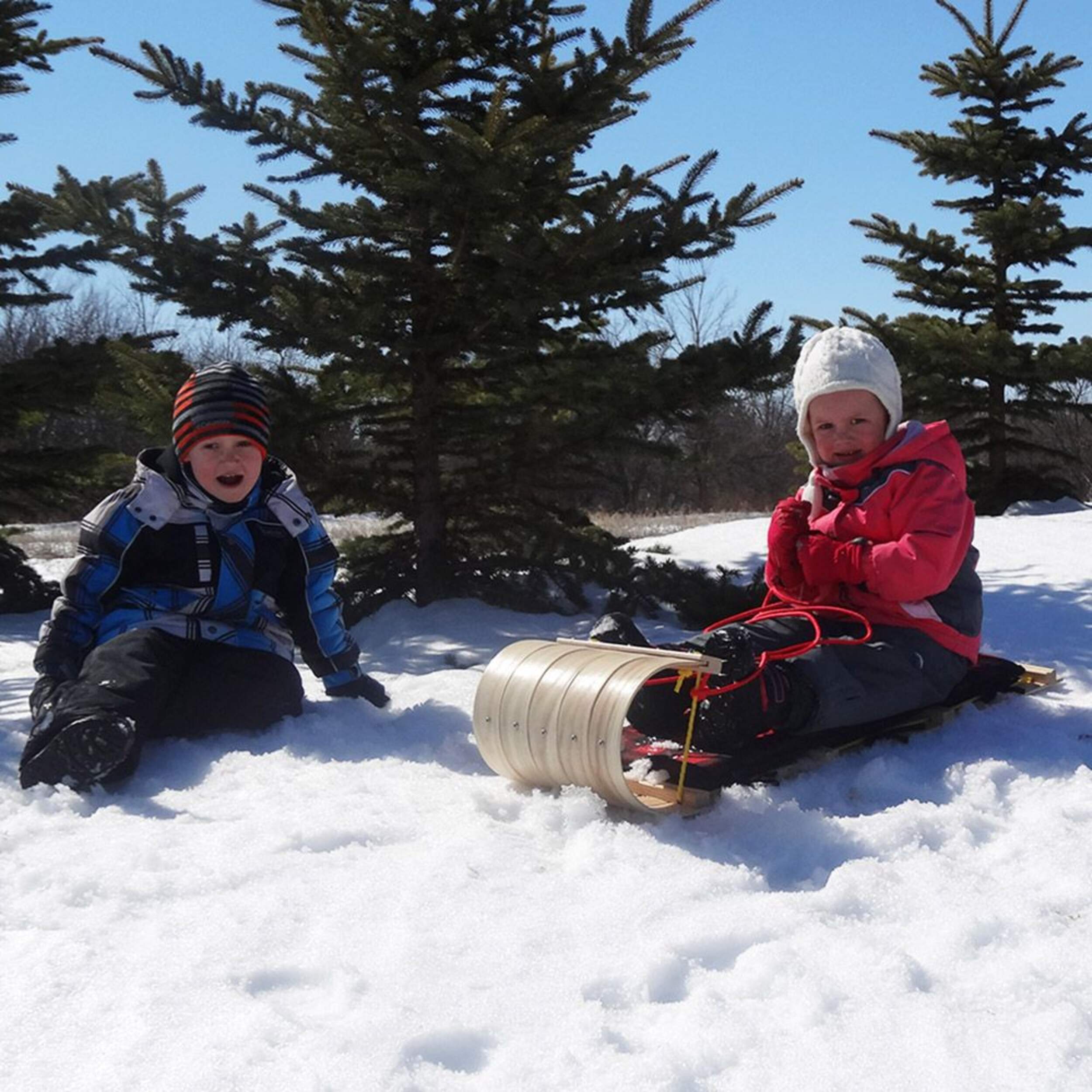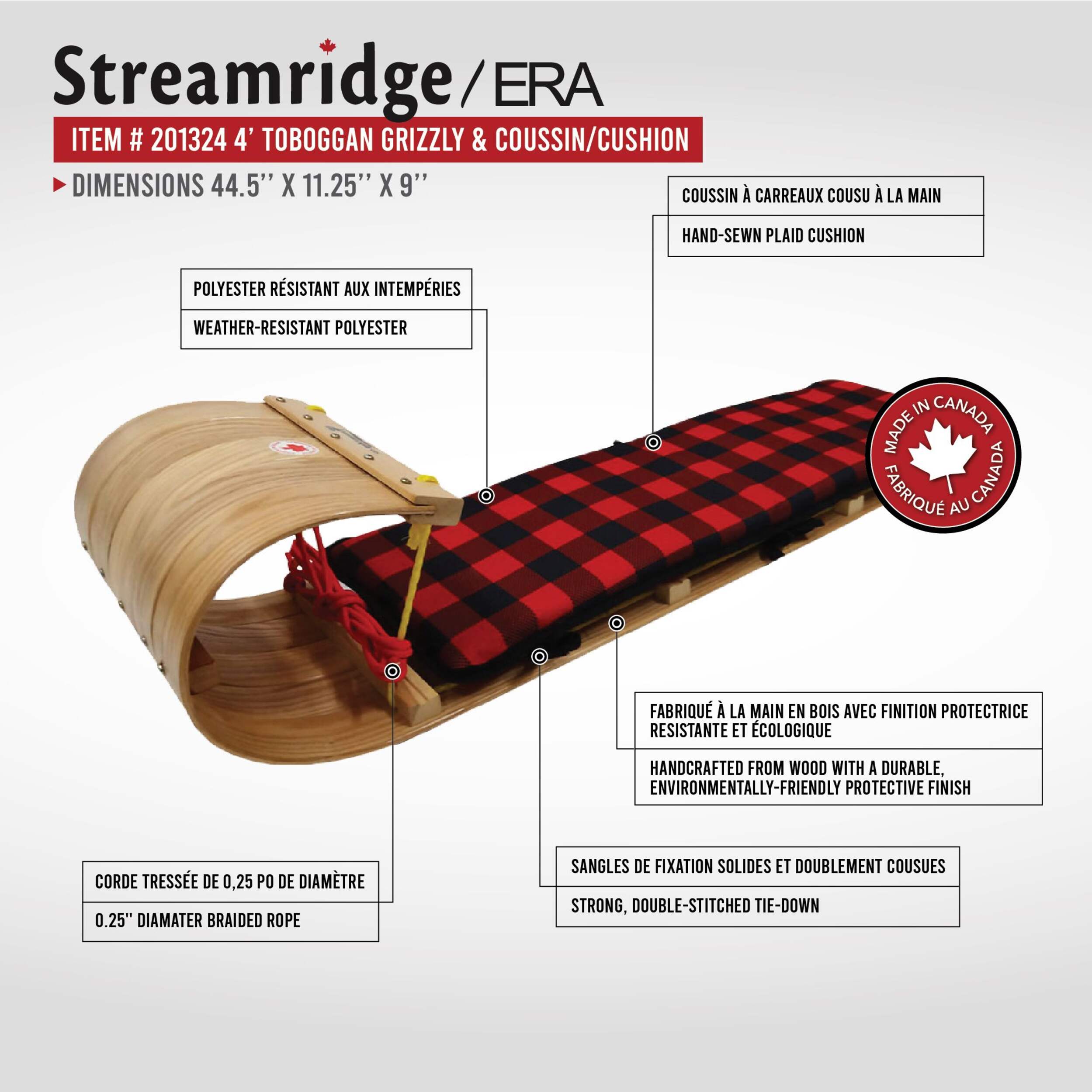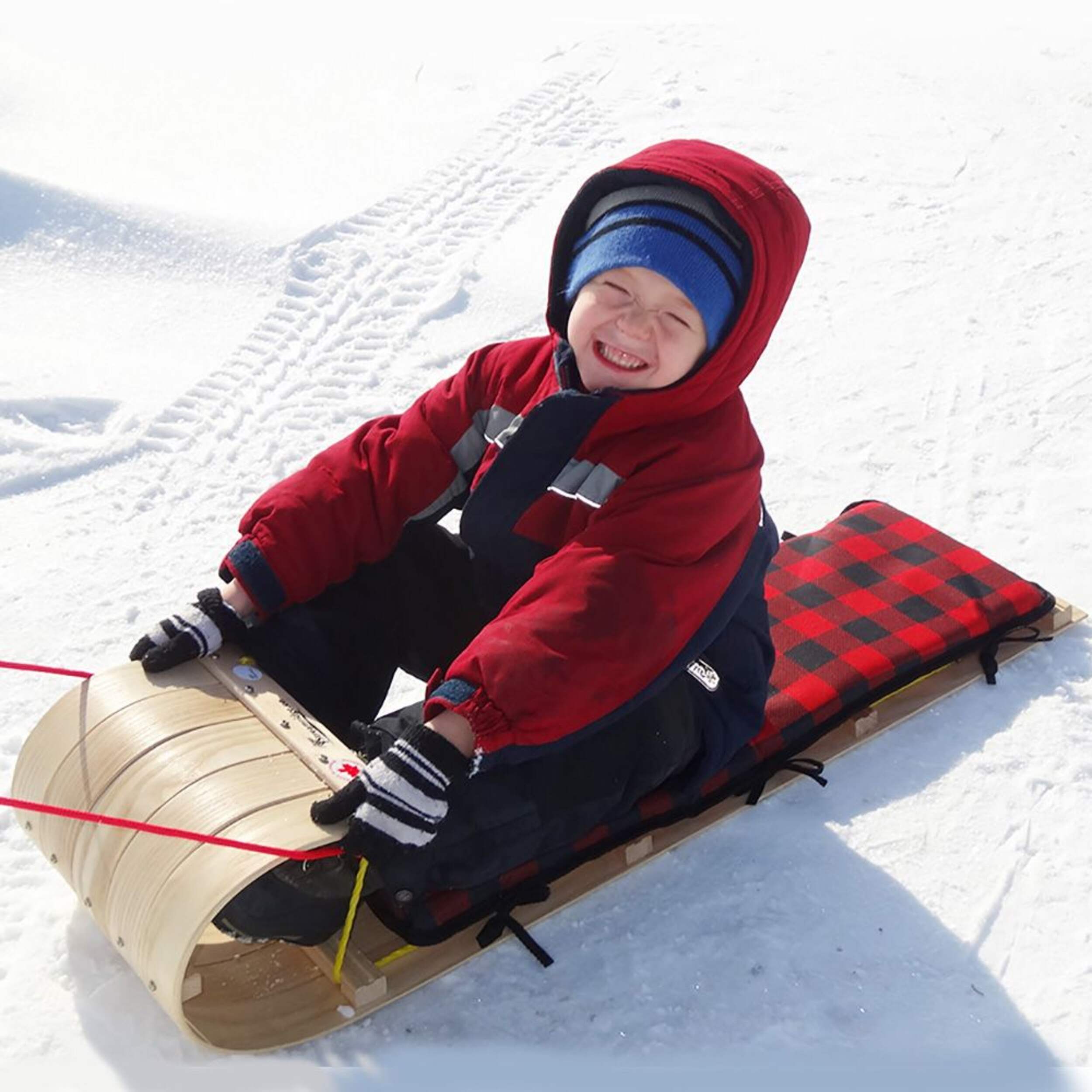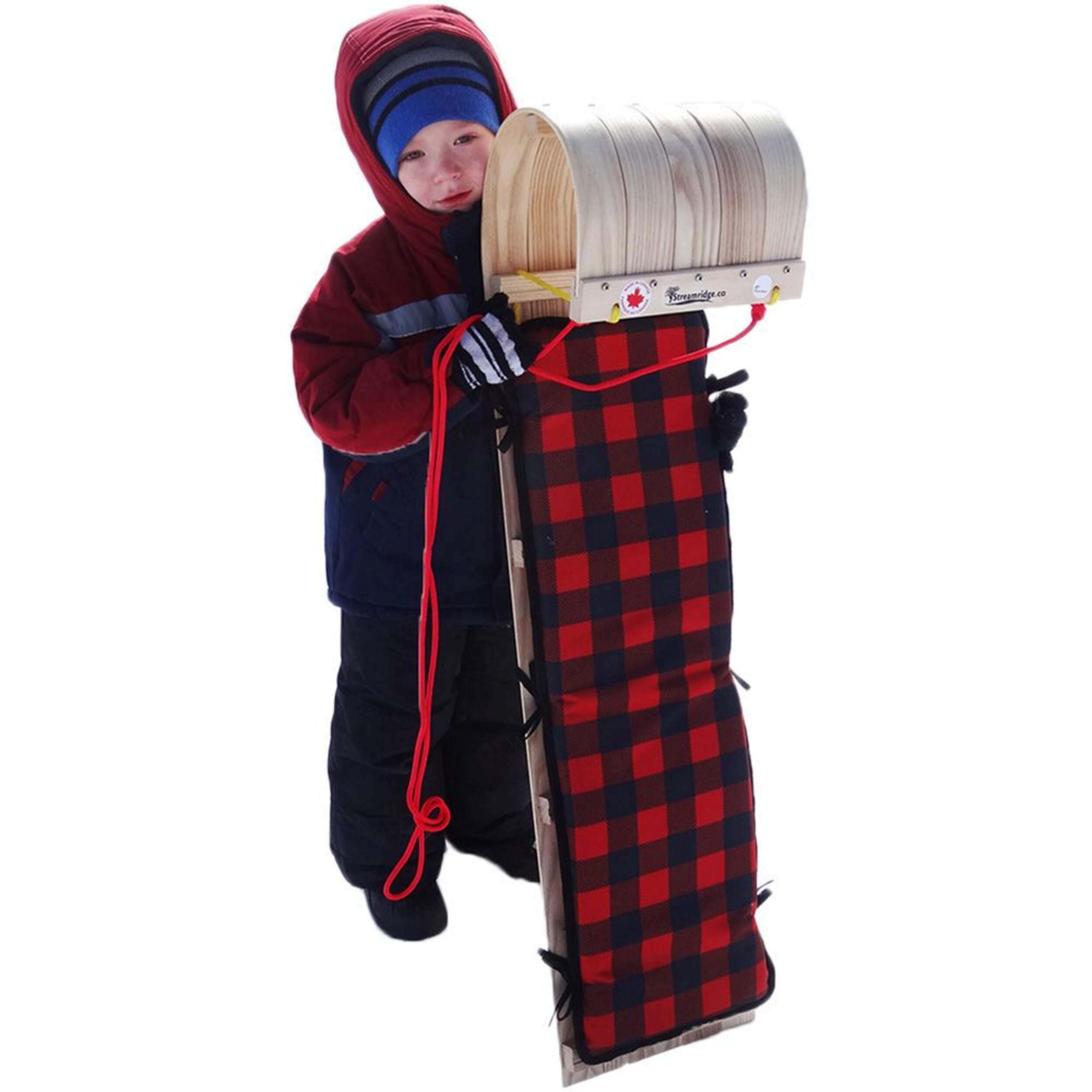 The Streamridge Grizzly Kids' Traditional Vintage Wooden Winter Toboggan Sled is expertly crafted from Ontario ash hardwood for durability and style. This 4-ft sled features a comfortable plaid seat pad and a robust eco-friendly finish to protect the wood, ensuring that this classic design looks and performs its best for endless days of winter fun. Ideal for family enjoyment, this high quality sled is built to be passed down through generations.