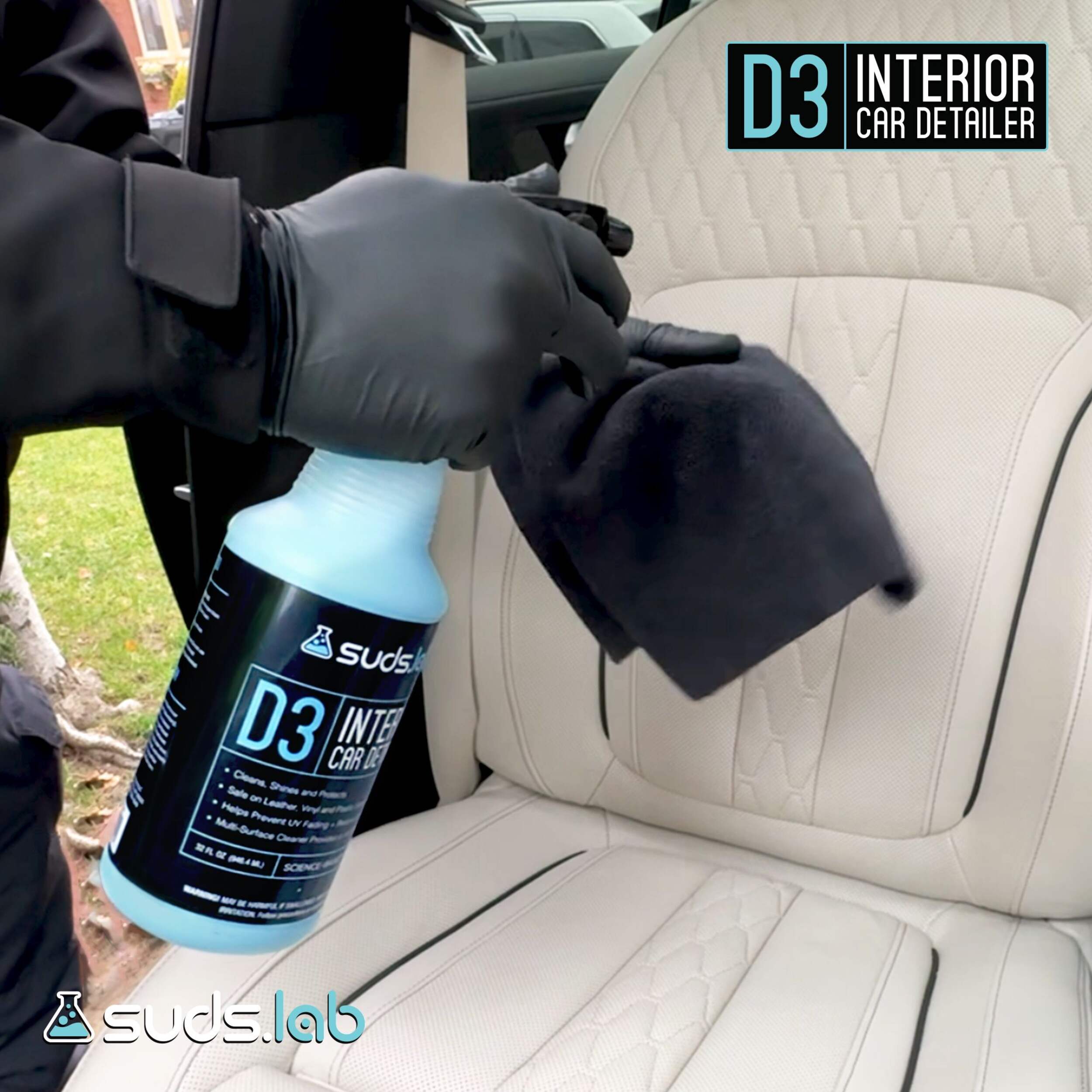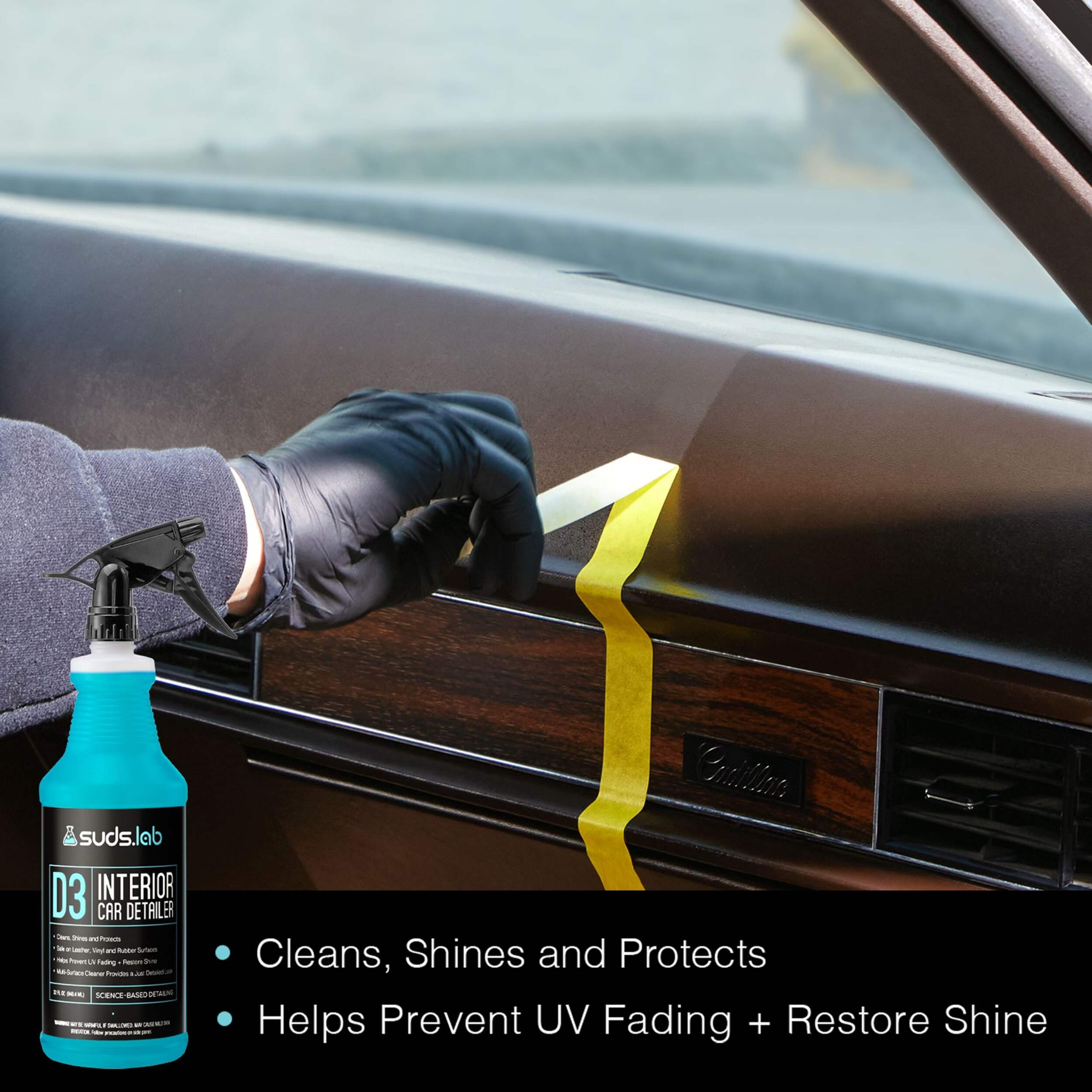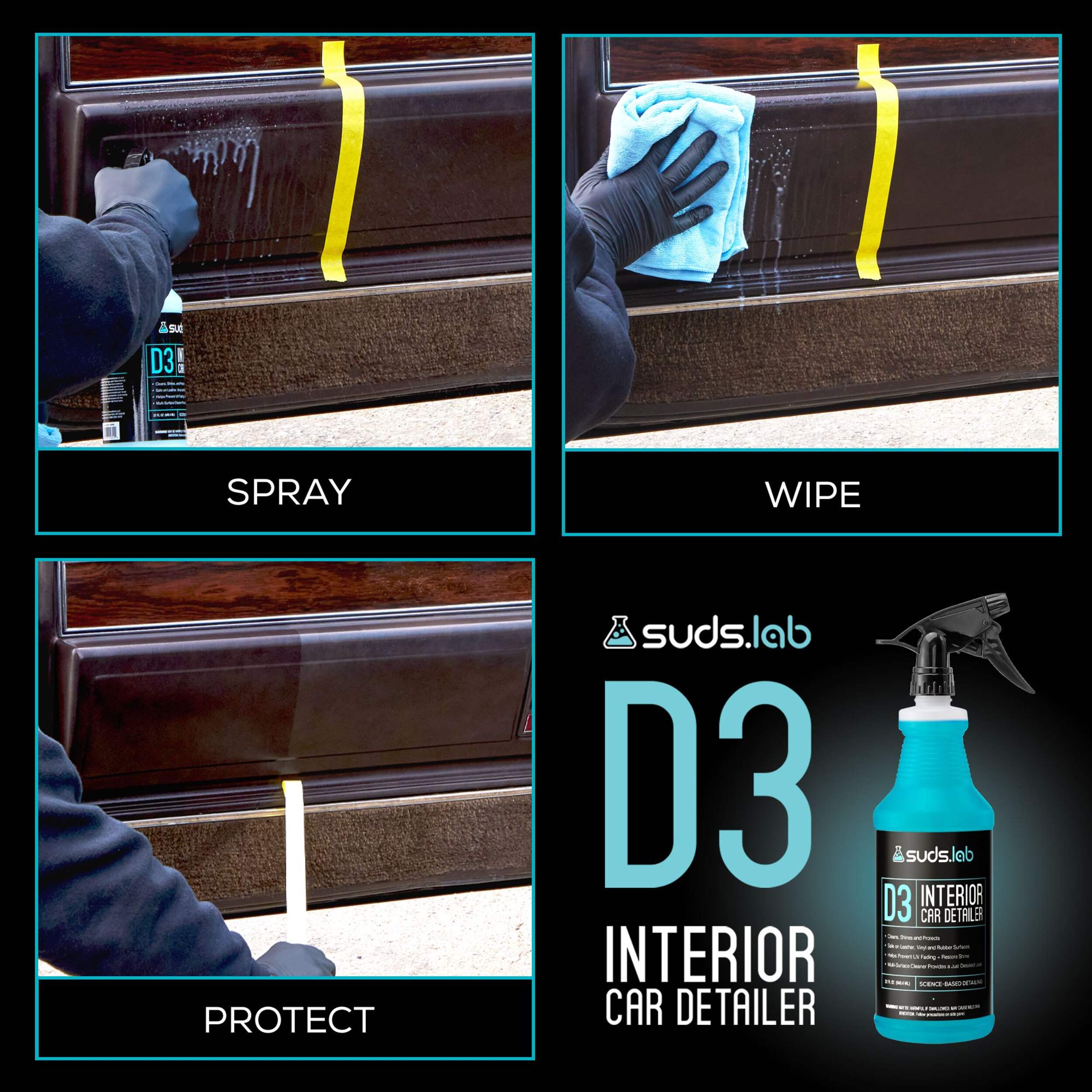 Suds Labs D3 Interior detailing spray solution cleans and protects automotive interior surfaces in one easy step. Providing UV protection, D3 helps prevent UV fading sun damage and restores shine to your dashboard, center console, steering wheel, and door panels.