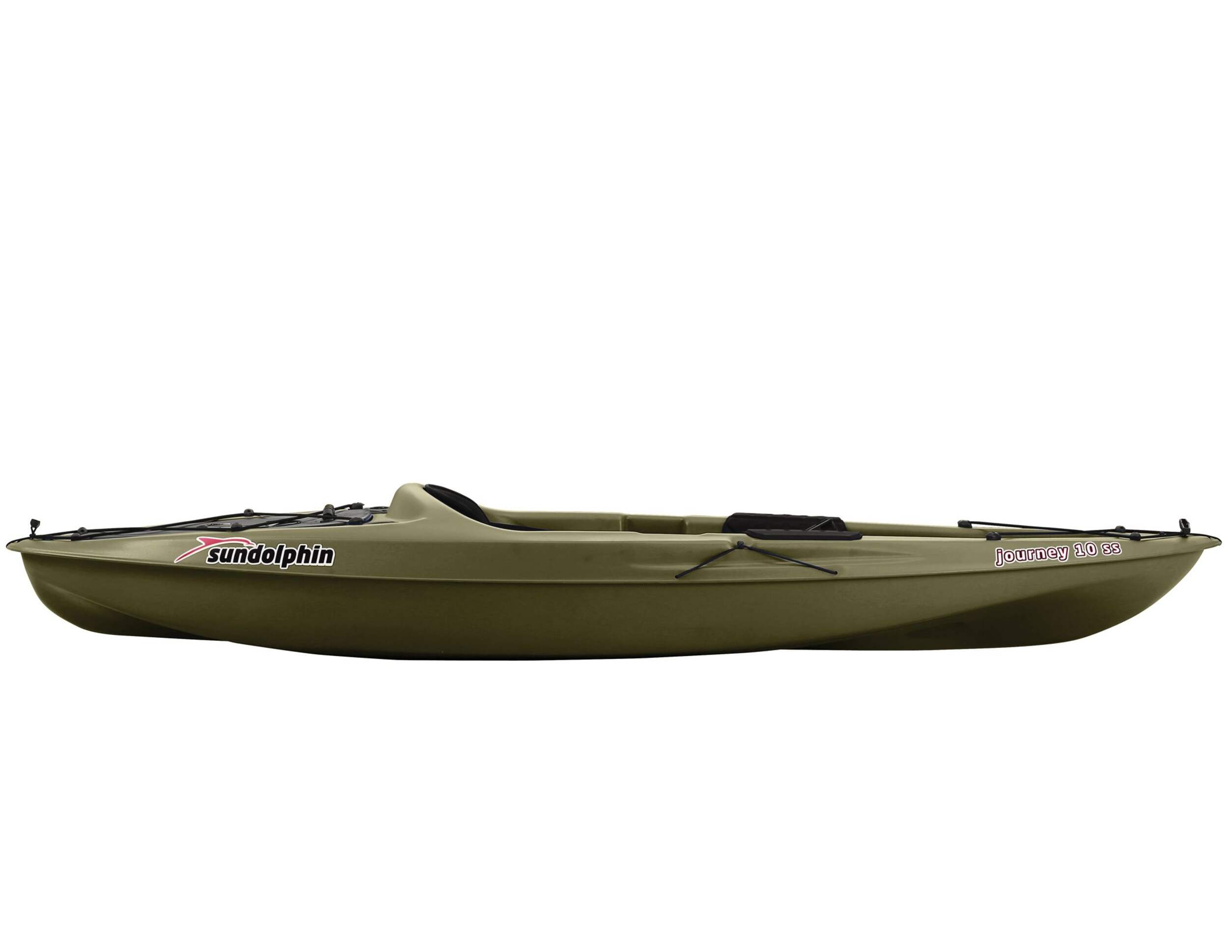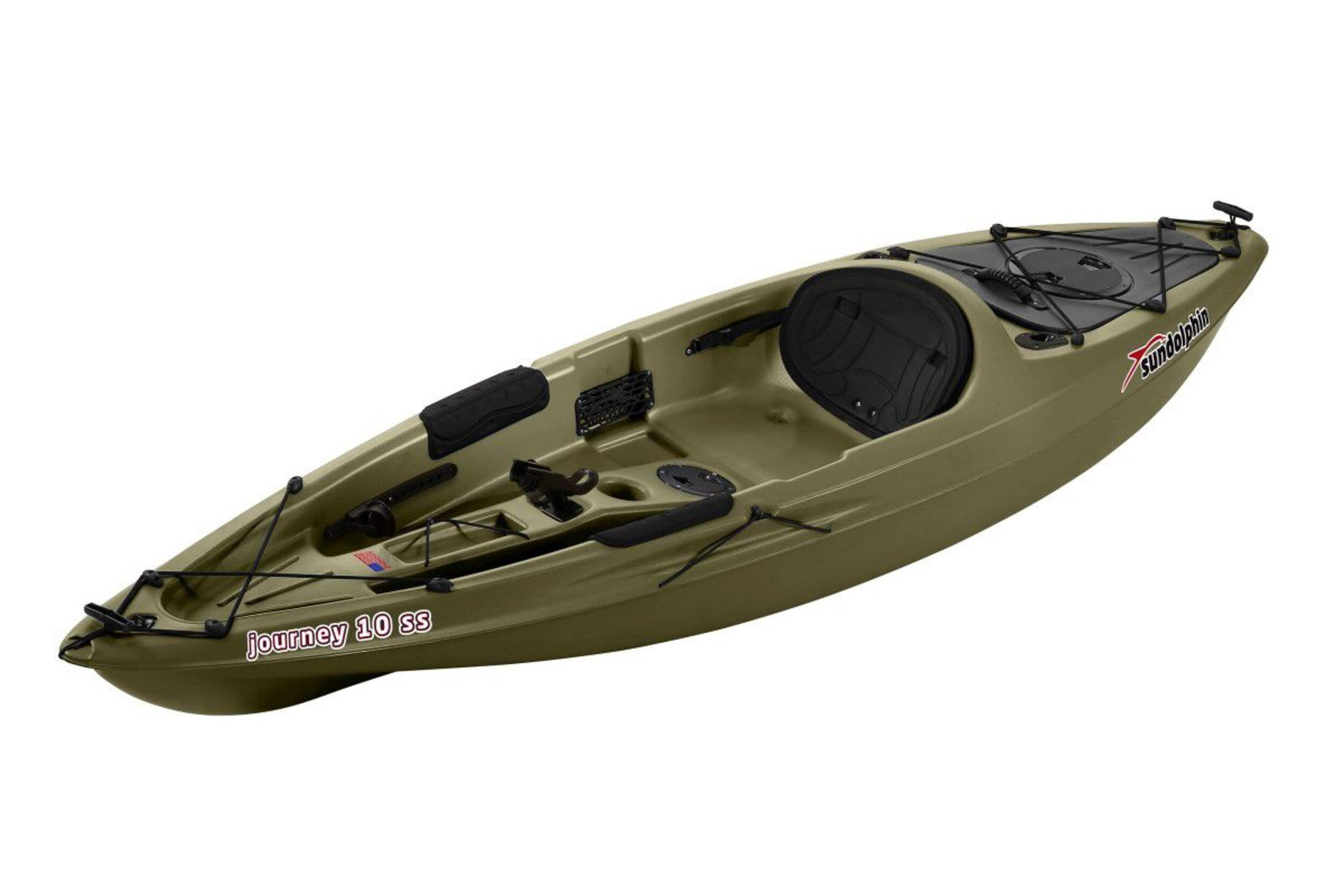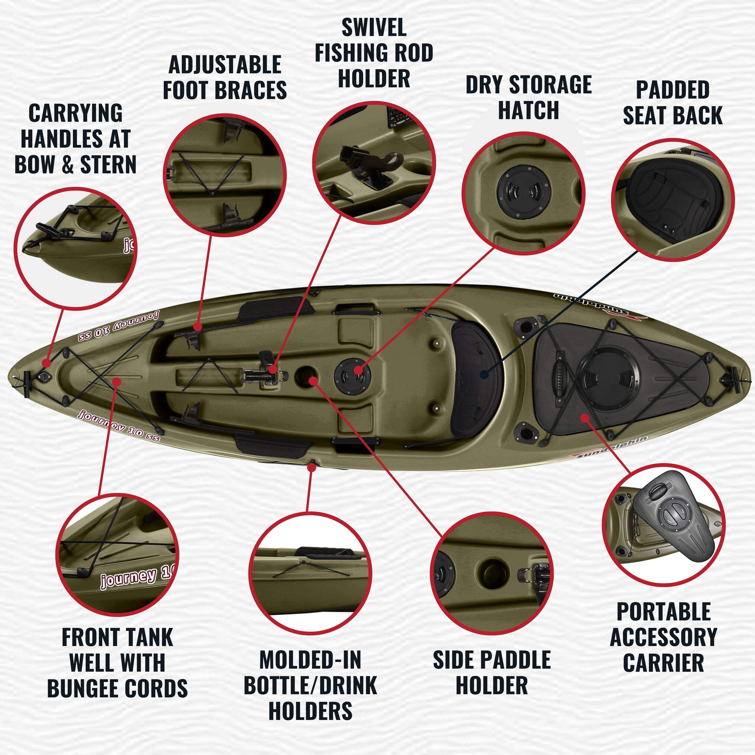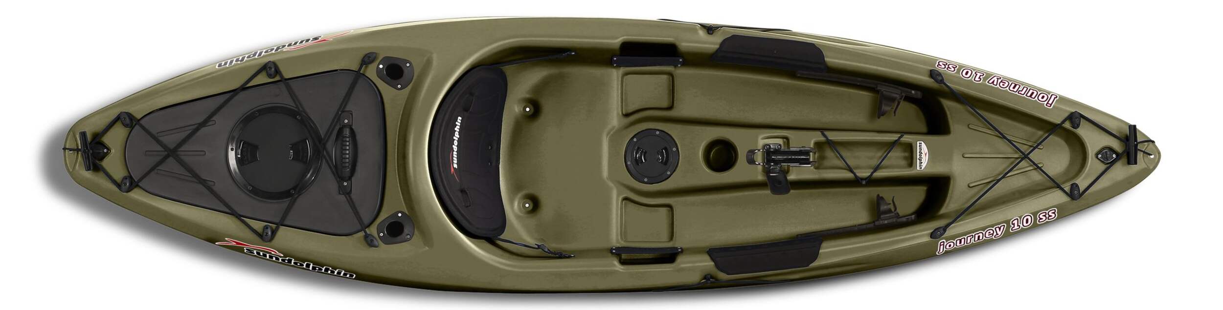 As the name suggests, the Sun Dolphin Journey 10 SS fishing kayak is built for anglers who see fishing as more than just catching fish—it’s about enjoying the entire experience. An excellent 10 ft. vessel for rivers, shallow bays, and narrow channels where the big fish lurk. It is designed for stability while casting and reeling as well as maneuverability and tracking on water so you can easily get through rugged shorelines, around stumps, and to those secluded fishing spots. The sit-on-top design features a large, comfortable seating area with an open cockpit, padded seat back, and adjustable foot braces to accommodate paddlers of all sizes. There are multiple storage compartments for all your gear including a Portable Accessory Carrier.