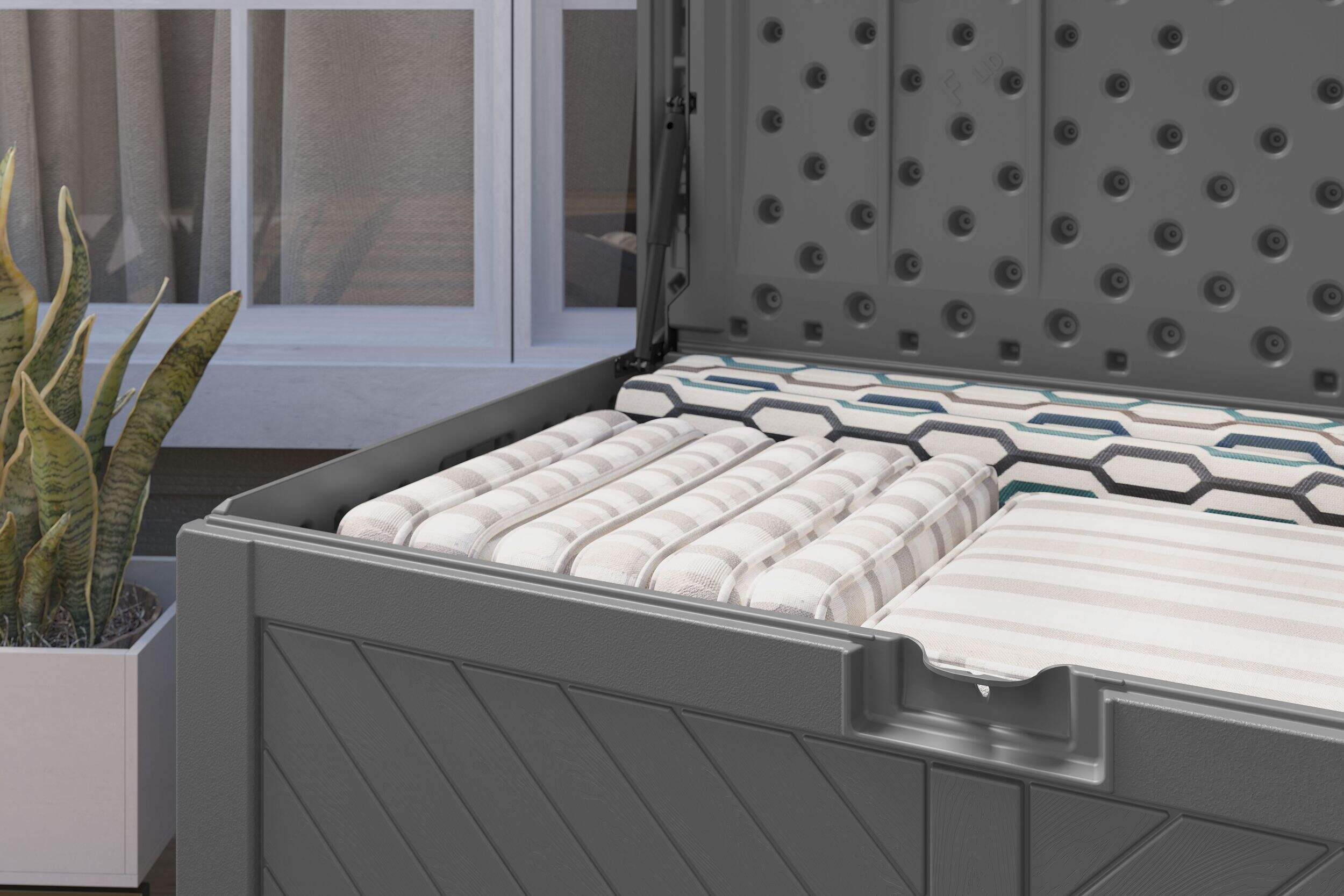 The Suncast® 134-Gallon Extra Large Deck Box is the ultimate solution for your outdoor storage needs. Perfect for storing patio cushions, gardening tools, firewood, and more, this deck box combines functionality with style. The durable construction resists water and UV damage, ensuring long-lasting use. The reinforced lid doubles as extra seating, making it a versatile addition to any patio or deck, while the decorative wood-look design complements any outdoor décor.