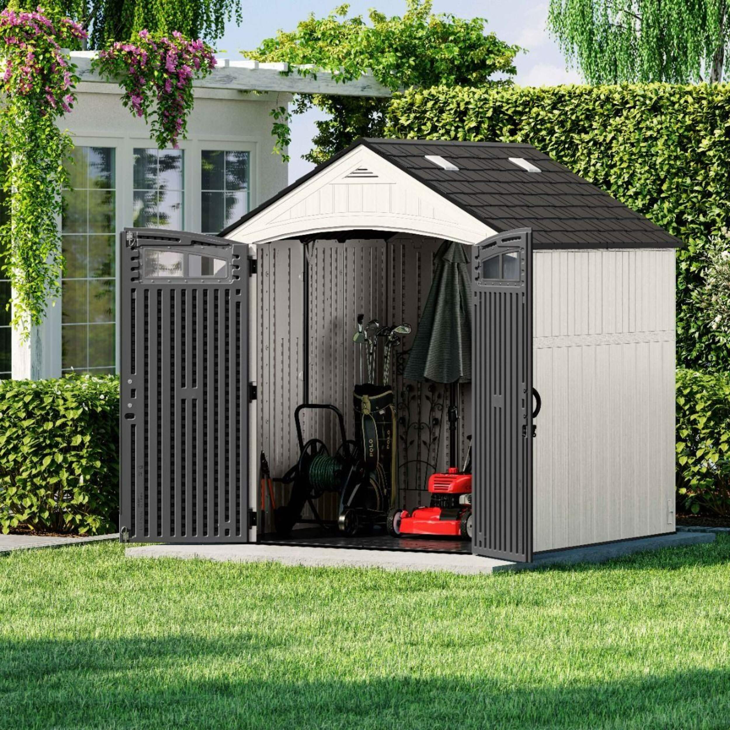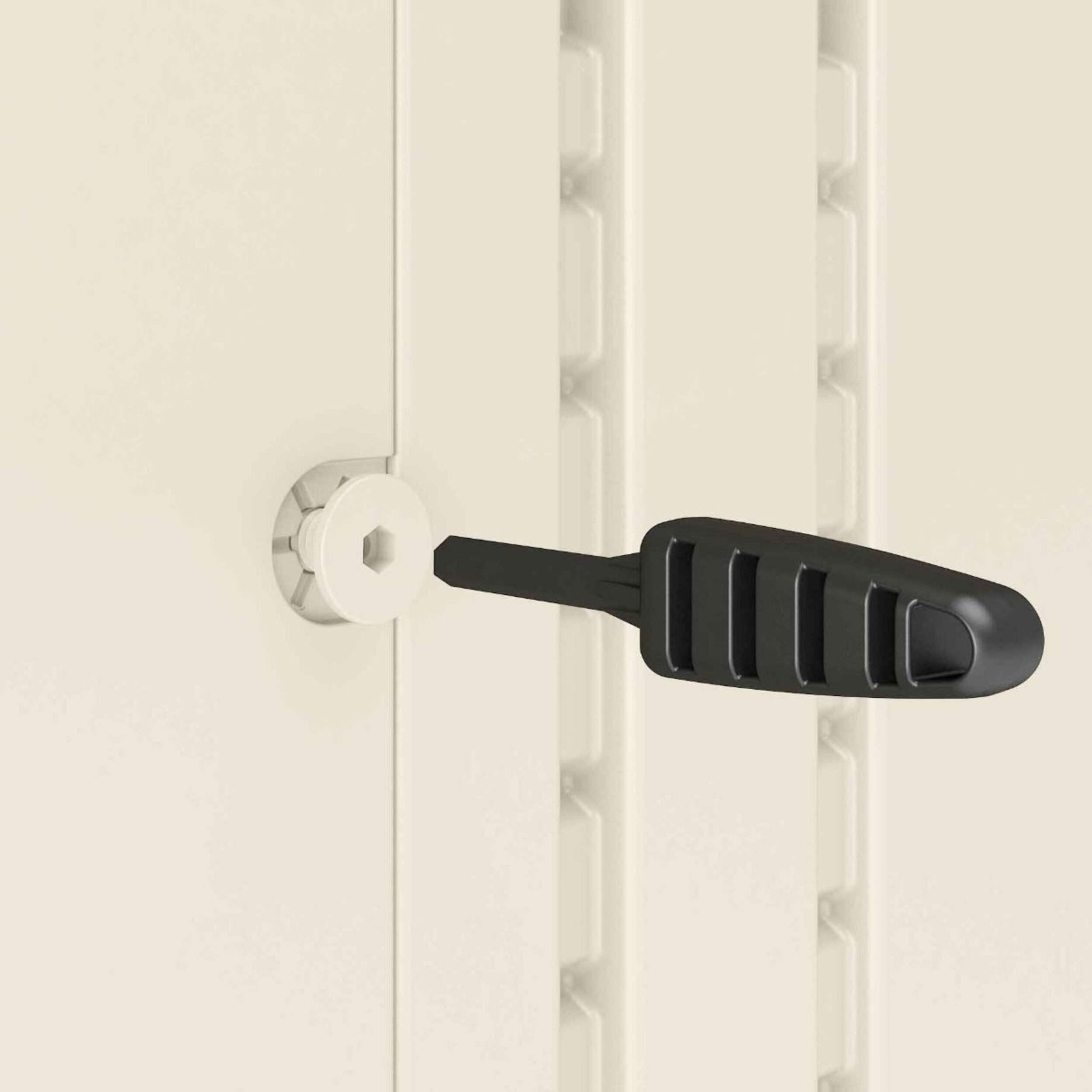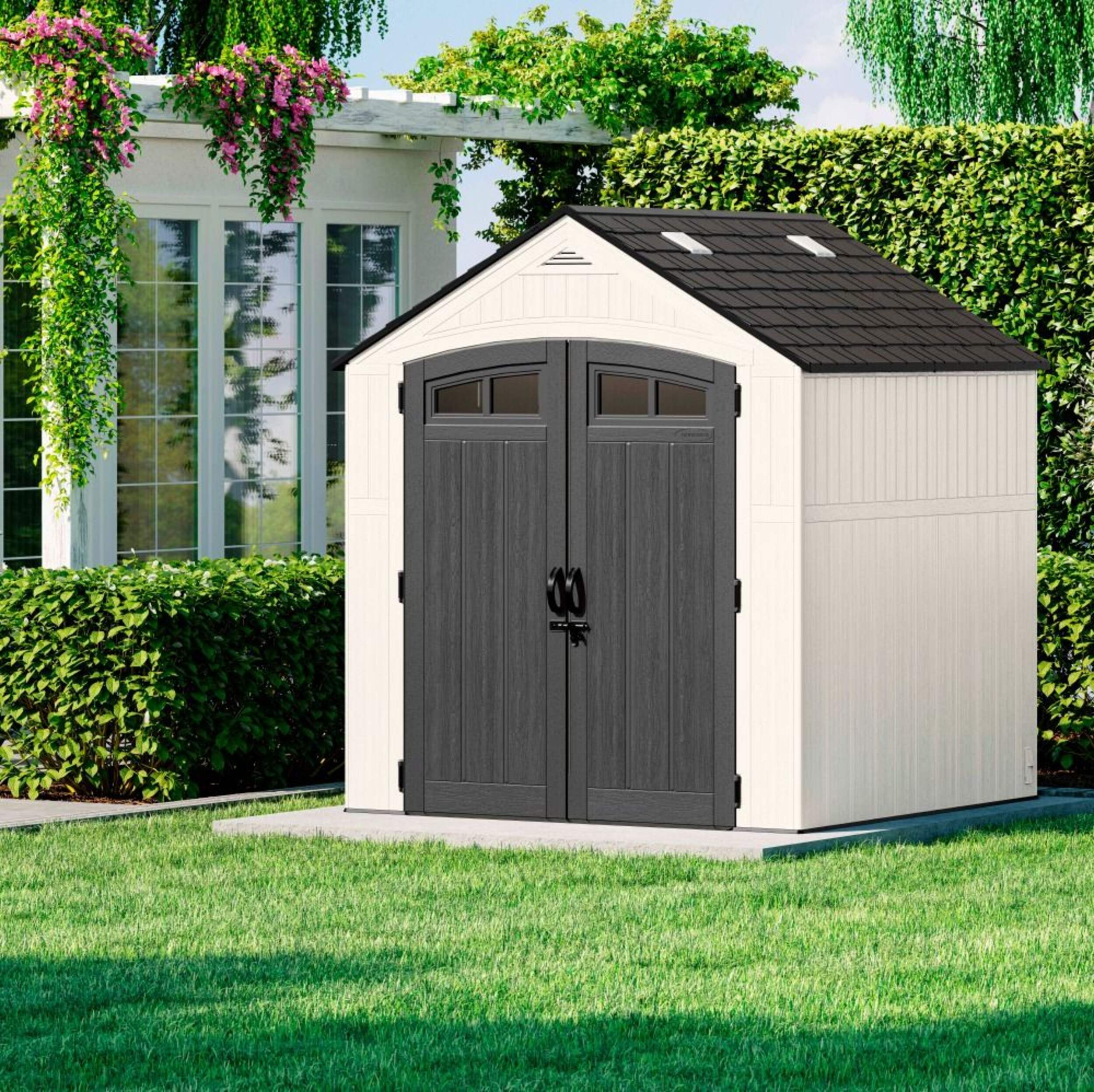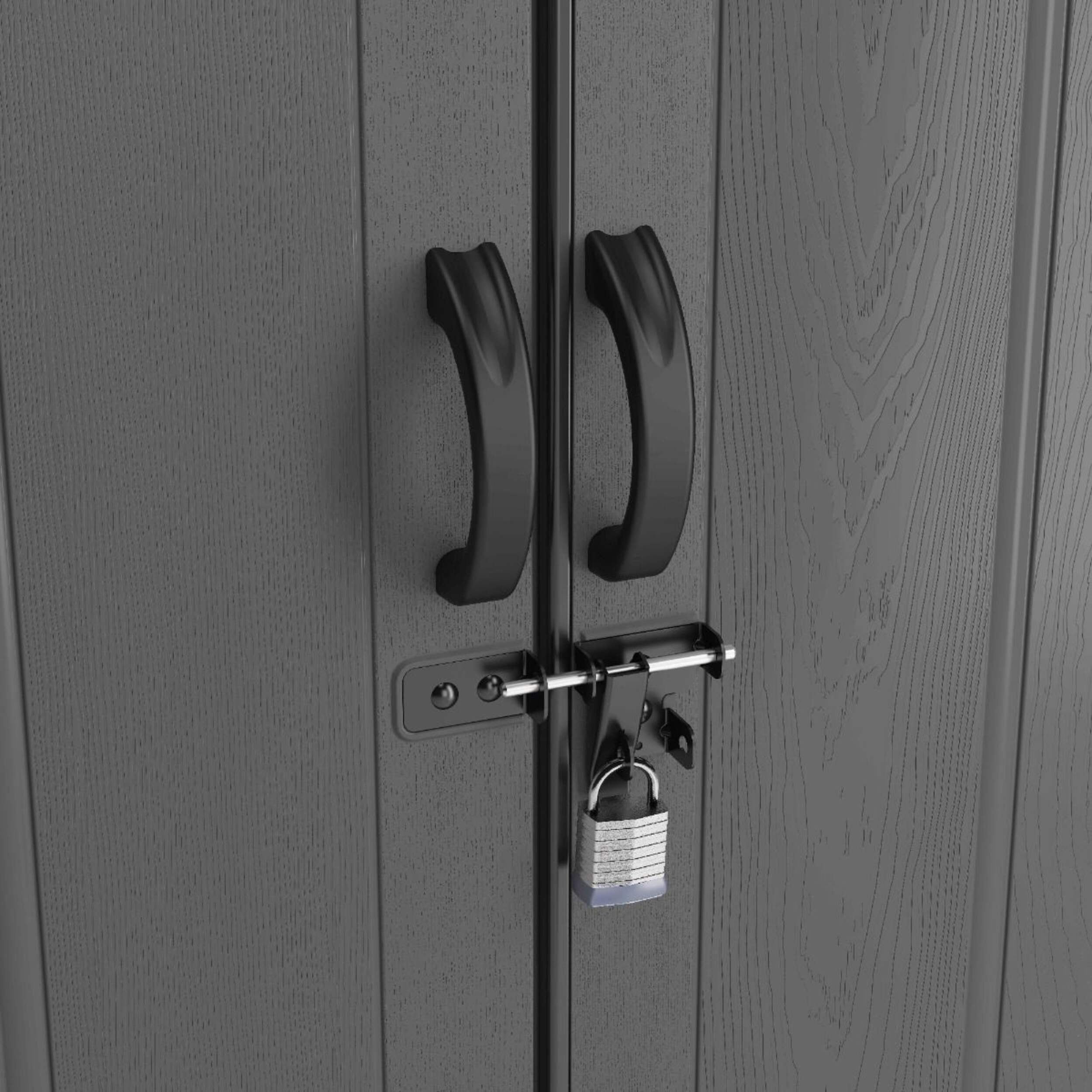 The Suncast® Ridgeland™ Storage Shed keeps outdoor supplies organized and safe. With ample room for gardening tools, bicycles, lawnmowers and such, this shed combines practicality and style. The sturdy double doors with metal hinges offer easy access and they're equipped with upper and lower metal latches to keep them securely closed. The doors are also pad-lockable for added security (lock not included).