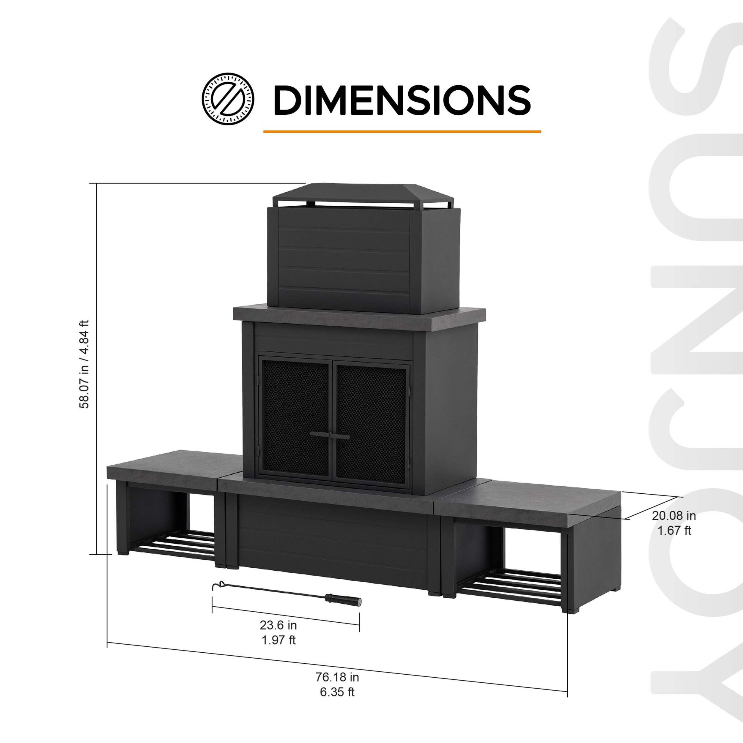 Create the ultimate outdoor relaxation destination with the Sunjoy wood-burning fireplace. Experience the magic of flickering, cozy fires that will transform your patio into a captivating retreat. Crafted by the world's leading ready-to-assemble outdoor structure maker, this fireplace combines classic design with the durability of powder-coated steel. Enhance any traditional outdoor setting with its sleek matte black frame and stylish cement-look finish appearance. Unlike open fire pits, this fireplace directs smoke up and away through its functional chimney, while the mesh screen protects against embers and sparks. Stay organized with the side shelf log-holders, creating a cozy atmosphere for gathering around the fire. No need to worry about the elements - the included PVC cover ensures year-round enjoyment of, and protection for your investment. With the included fireplace tool, maintenance, and fire adjustment are a breeze. Cleanup is effortless thanks to the removable grate, saving you time and effort. Get ready to curl up under the stars or invite loved ones for roasting marshmallows, as you create lasting memories around this fireplace for years to come.