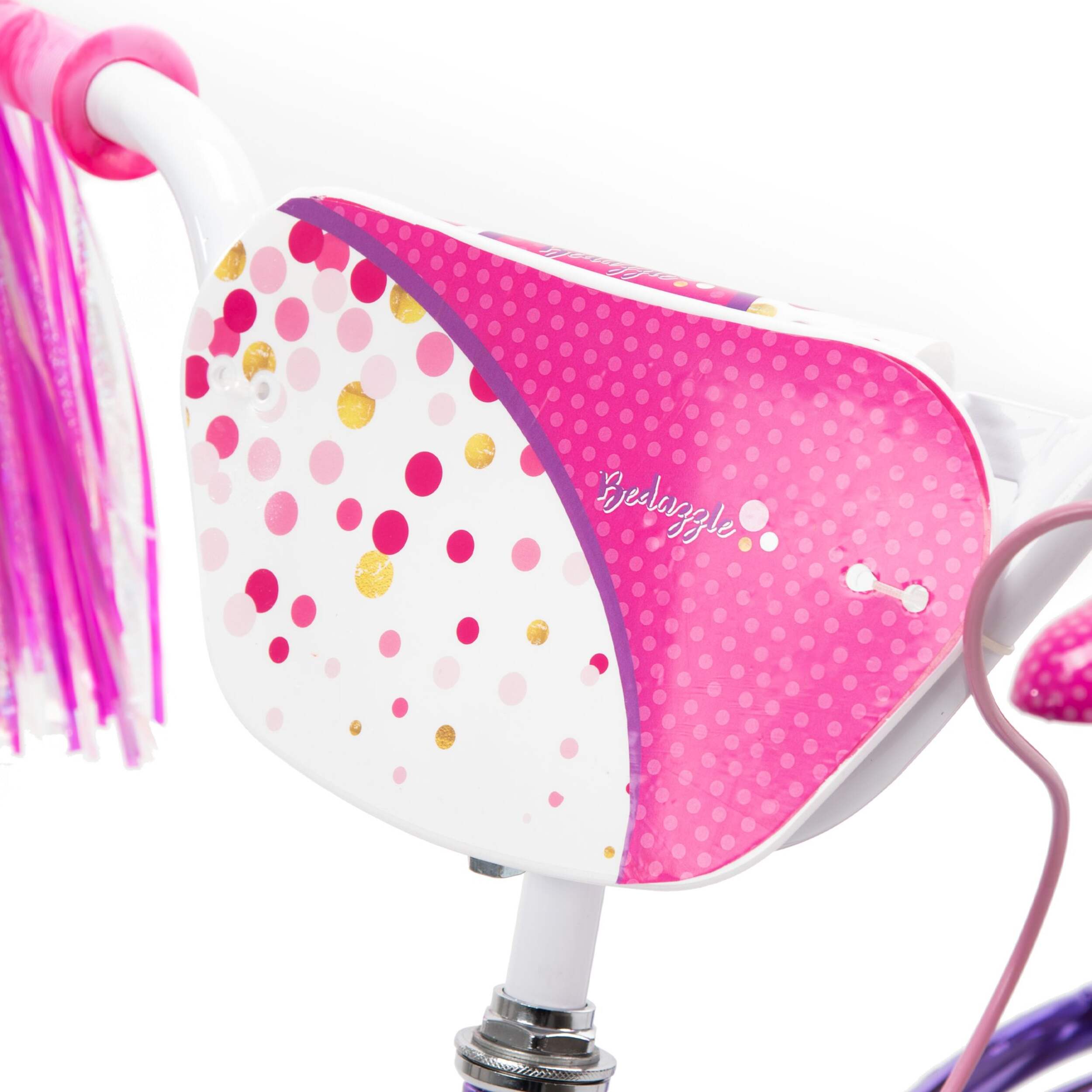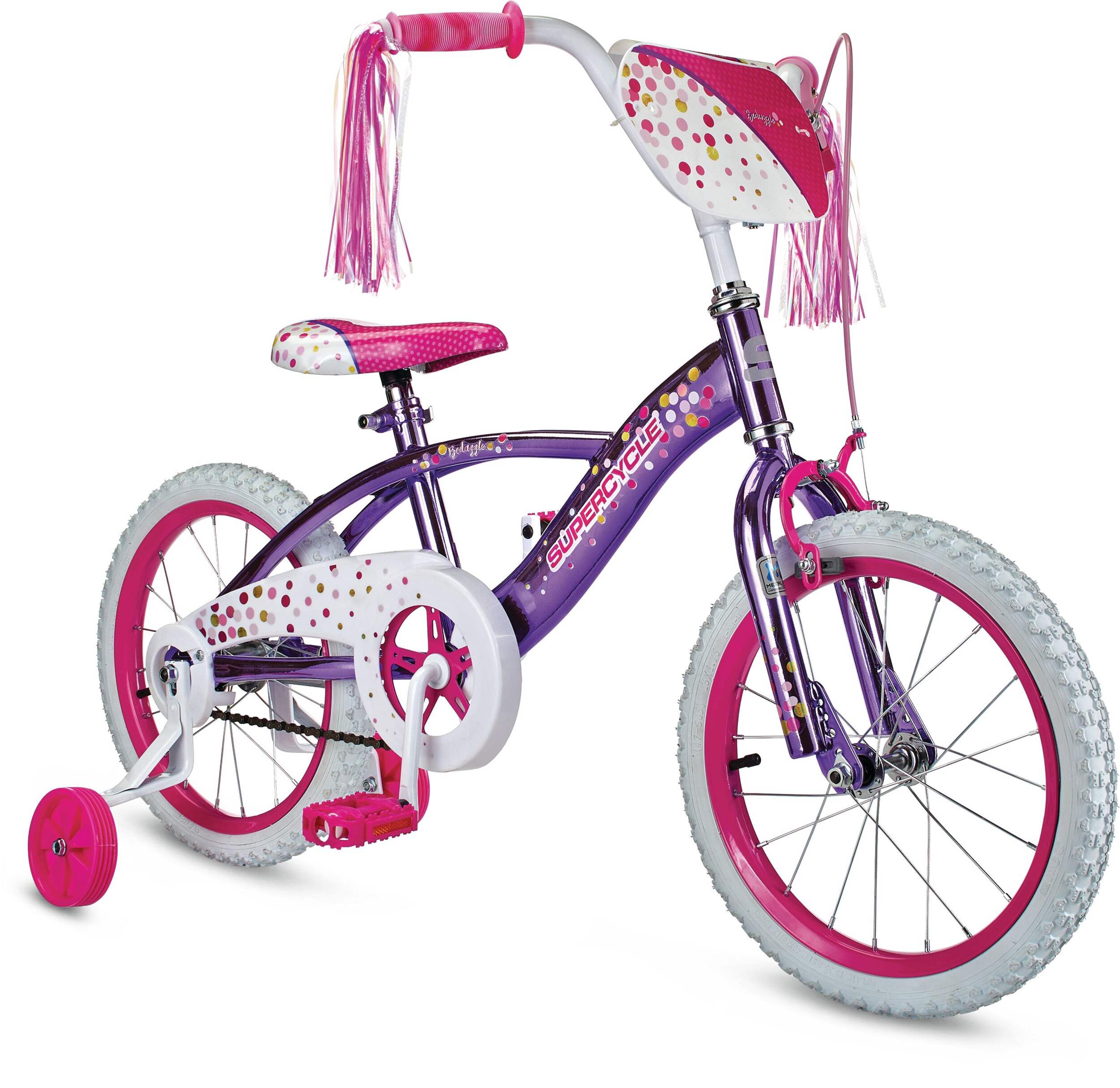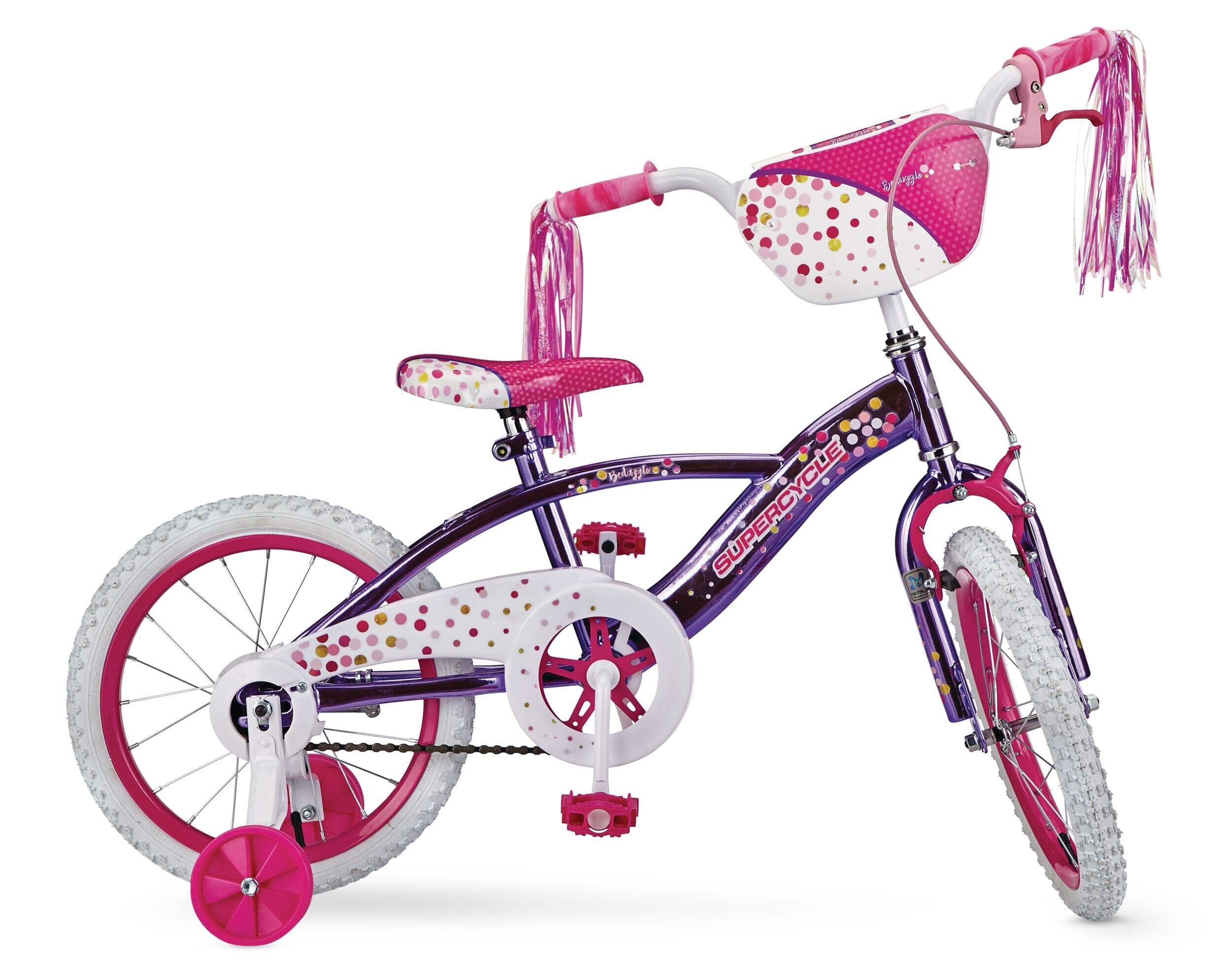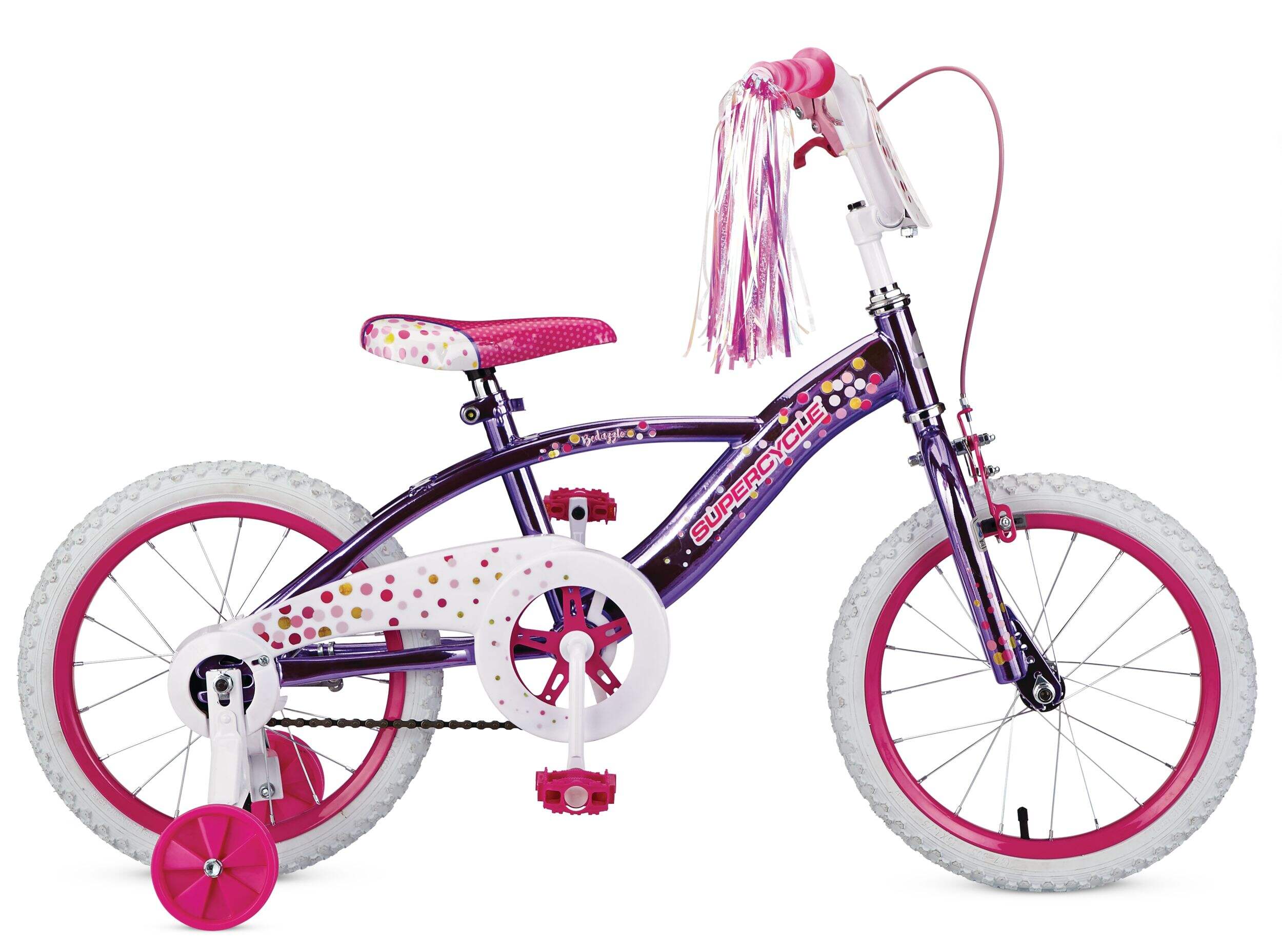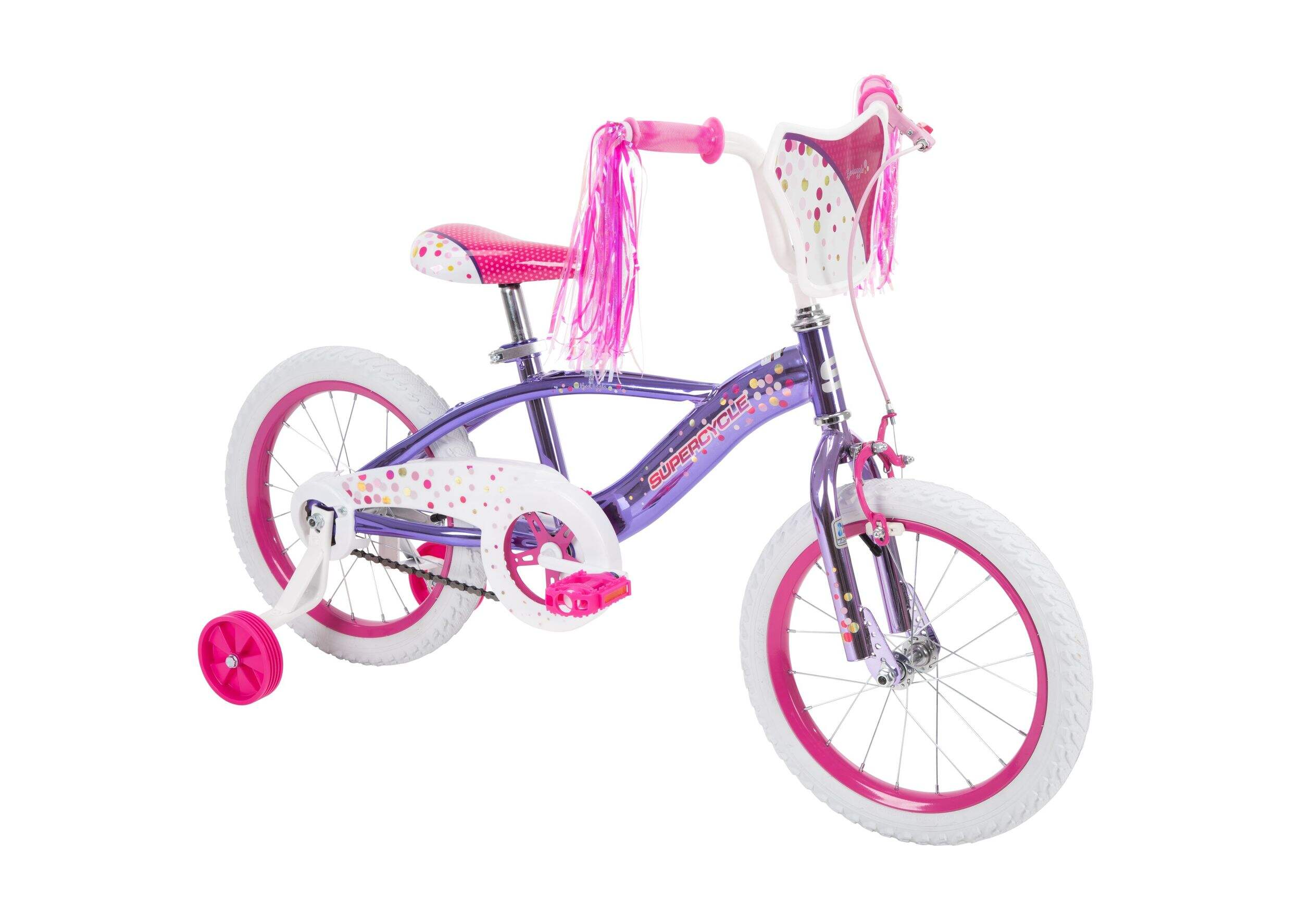 The Supercycle Bedazzled Metaloid Kids' Bike is designed for young riders who love vibrant style and reliable performance. Featuring a durable steel frame with a dazzling metaloid finish, this bike stands out. Its 16" wheels offer stability, and removable training wheels support beginners. A coaster brake provides dependable stopping power, while colourful streamers and a 3D handlebar plaque complete the fun design.