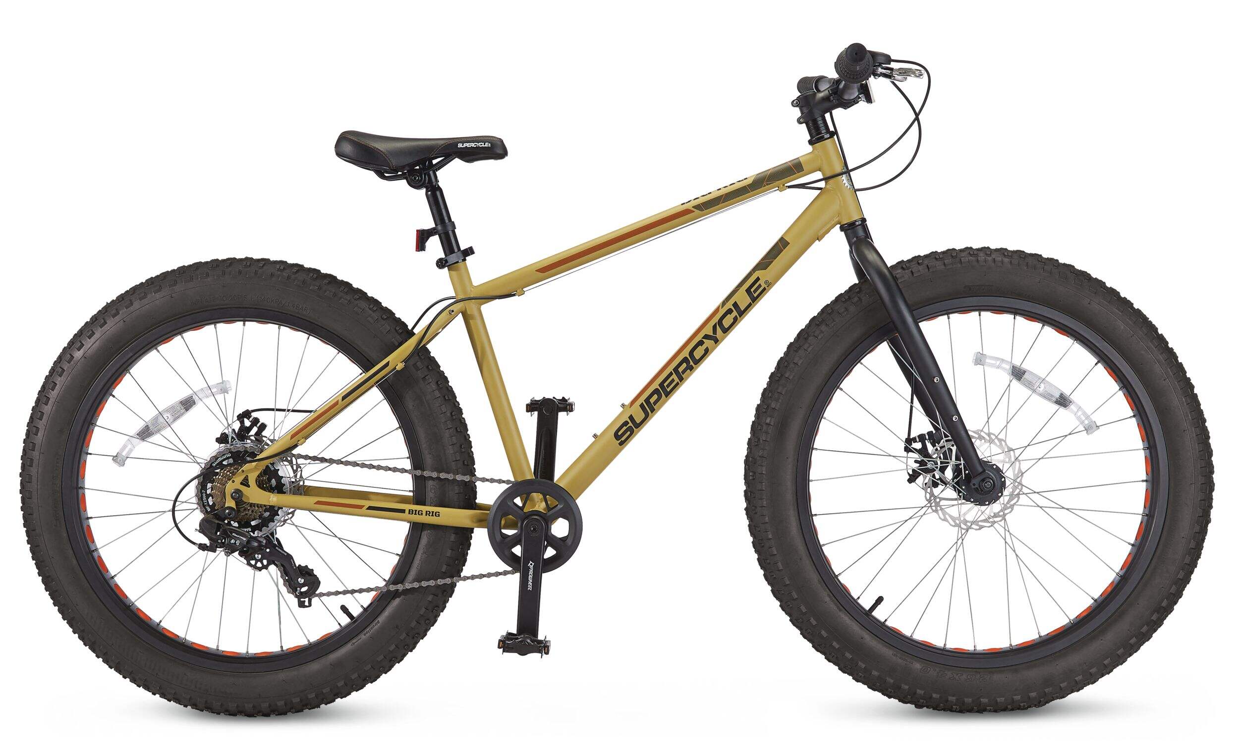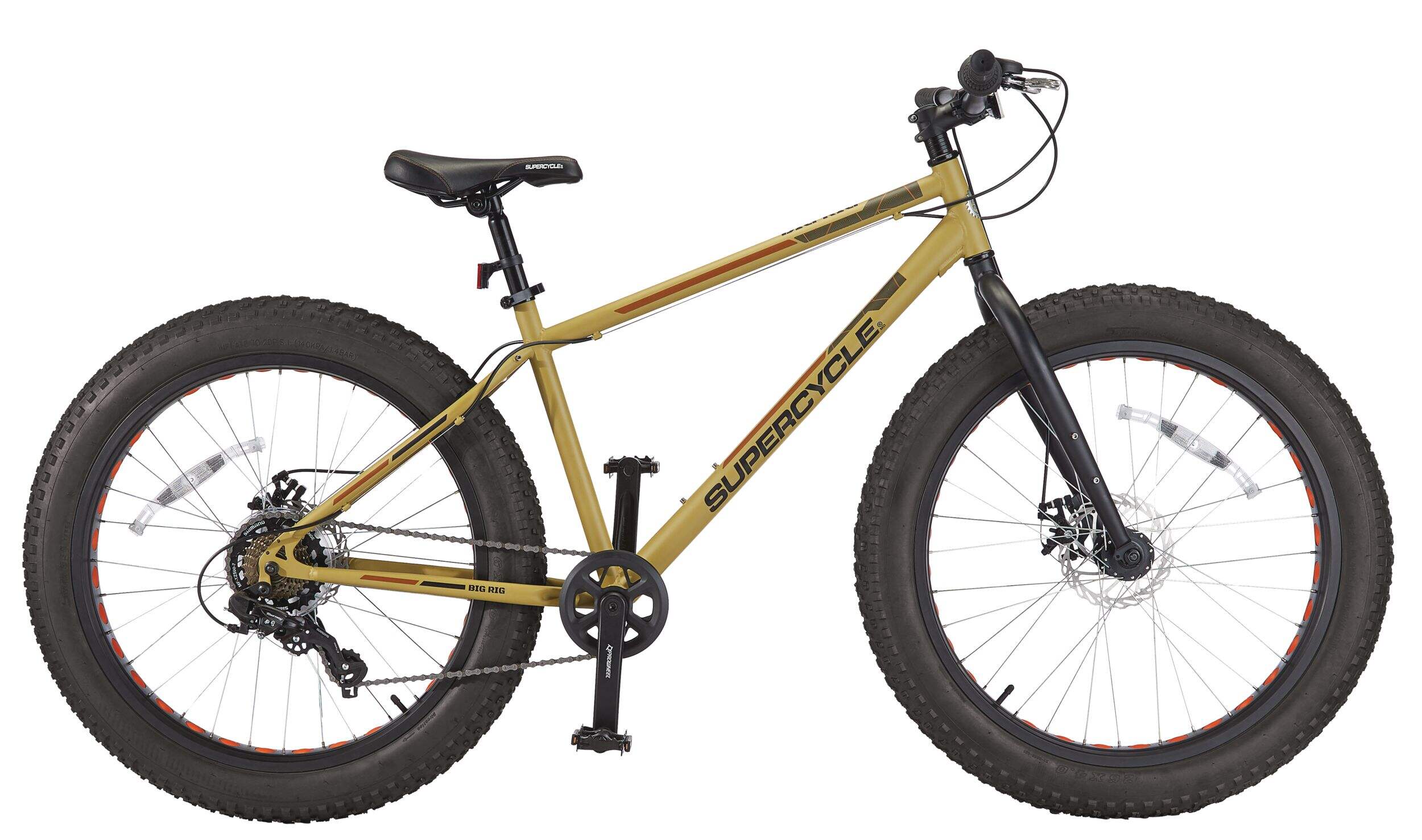 The Supercycle Big Rig 26” mountain bike has all the benefits of a Fat Tire mountain bike at a value price point. Including a 7-speed Shimano Revo grip shifter with Shimano derailleur and large range freewheel and alloy disc brakes. With 4” wide fat tires, and oversize alloy rims you can rest assured you’ll have plenty of stability and traction when out on your adventure.