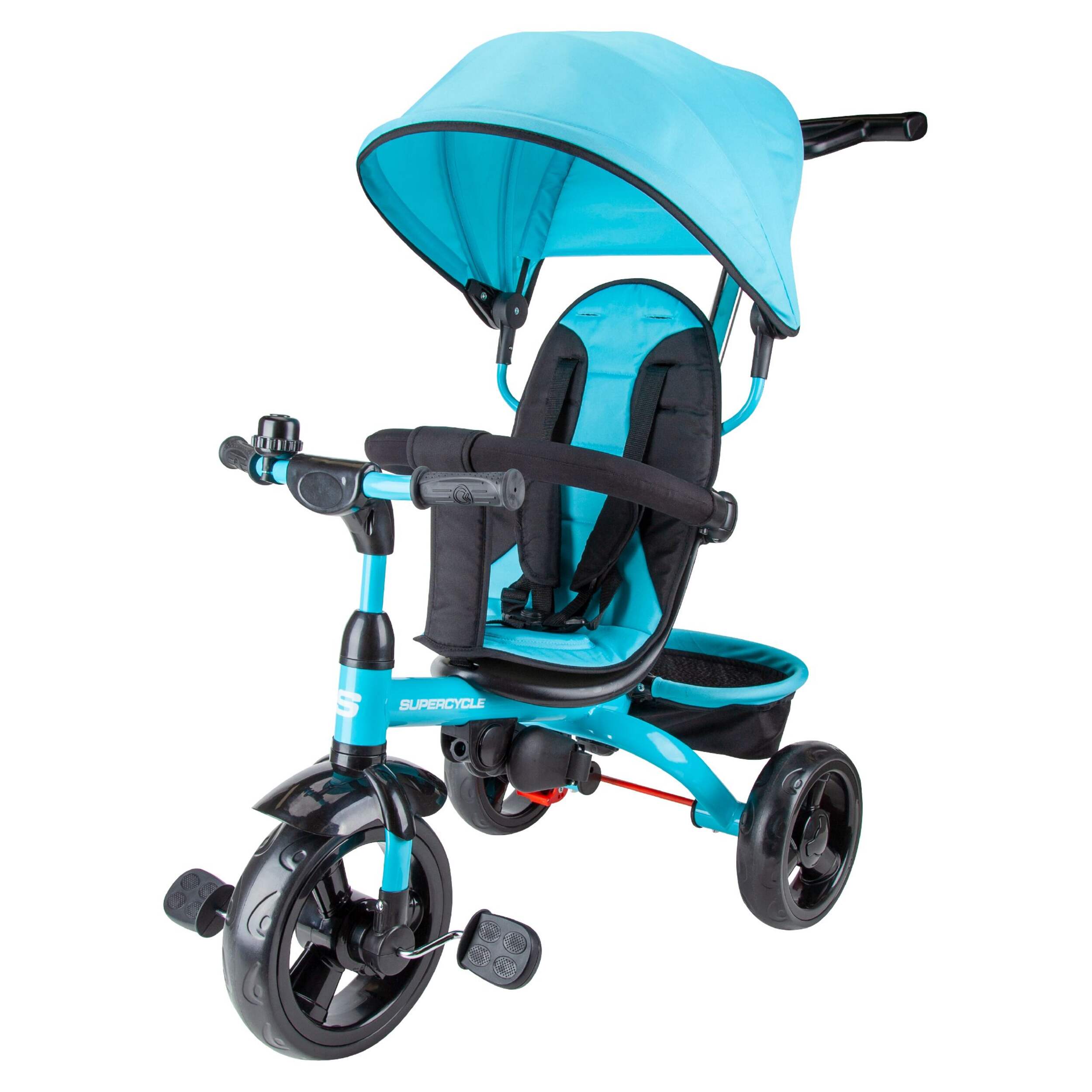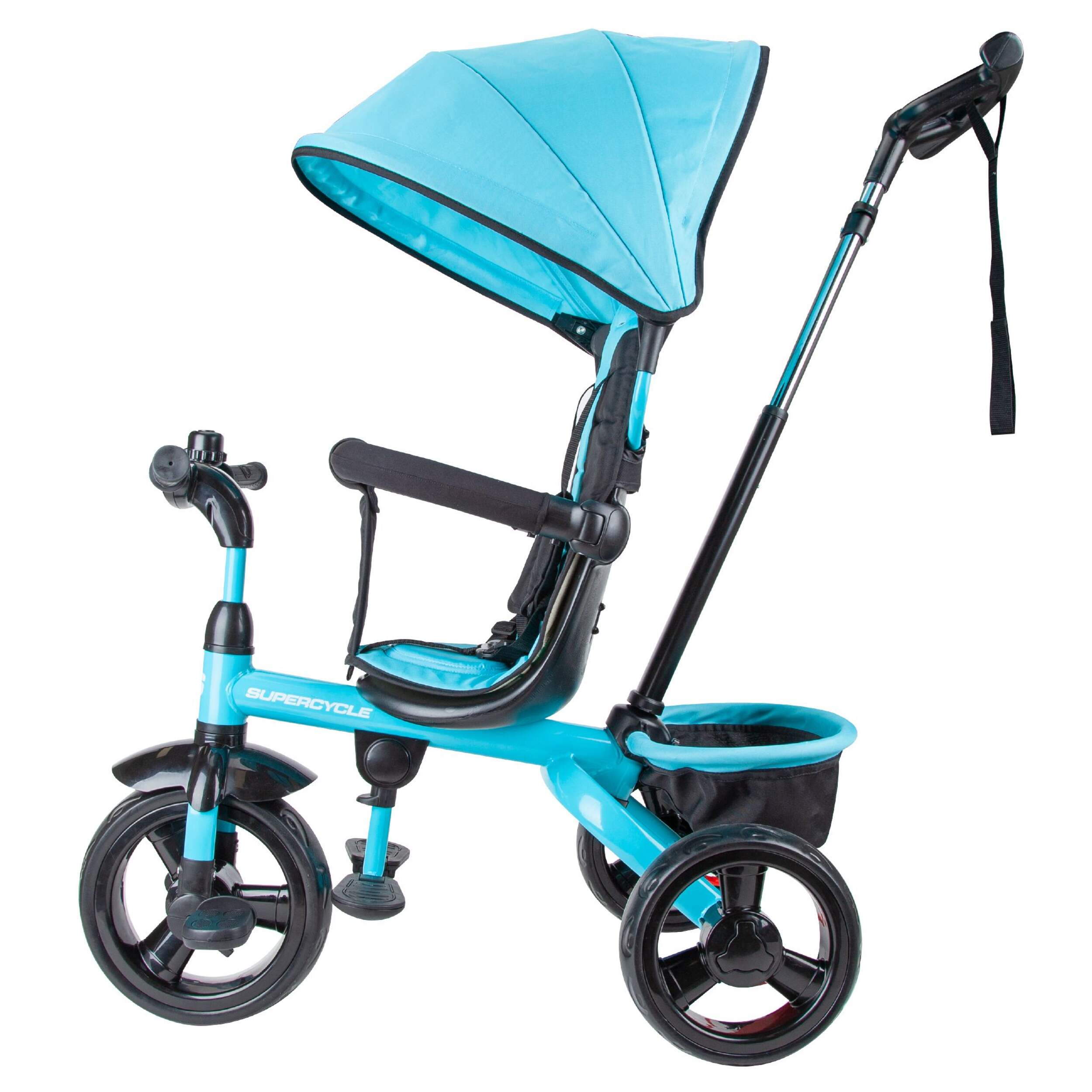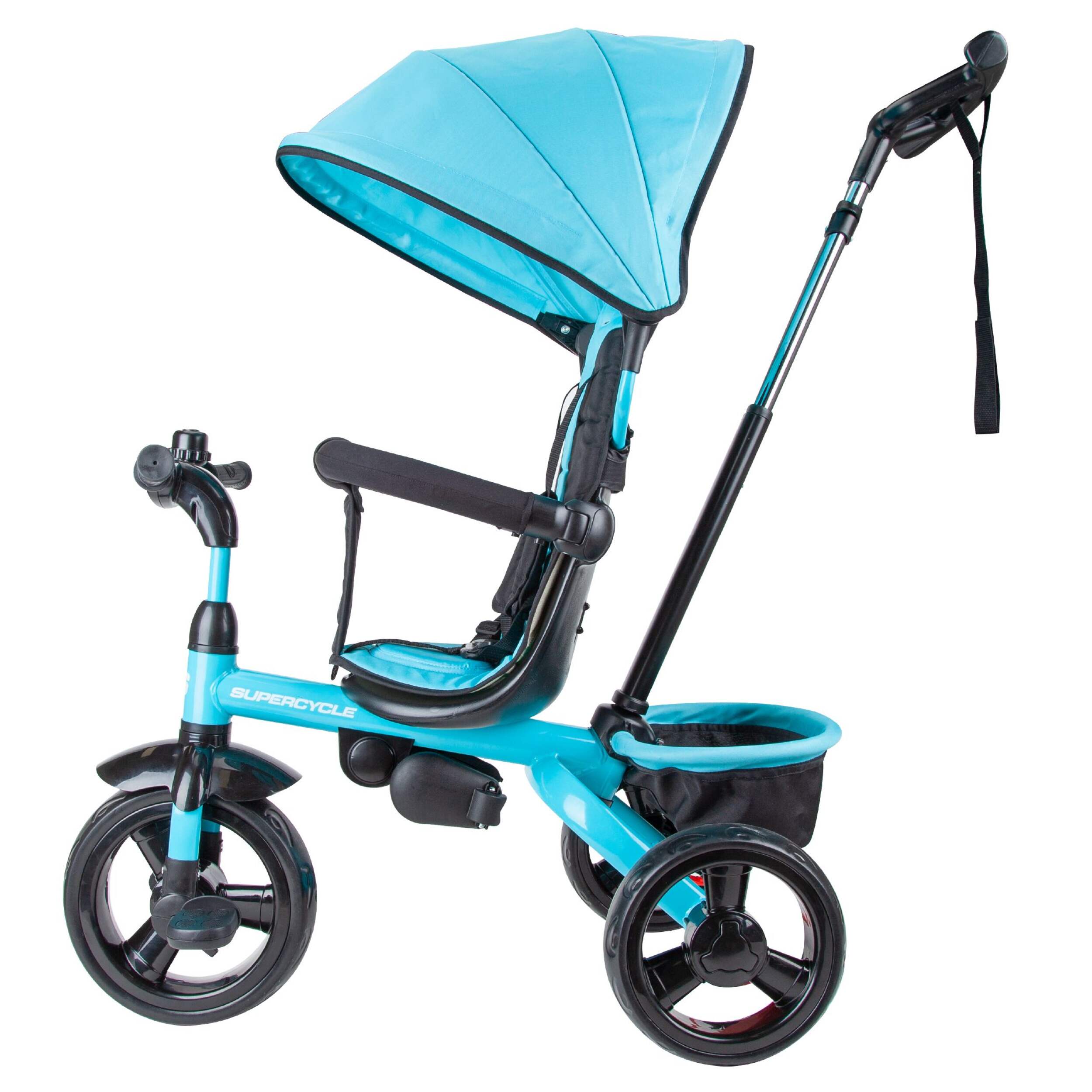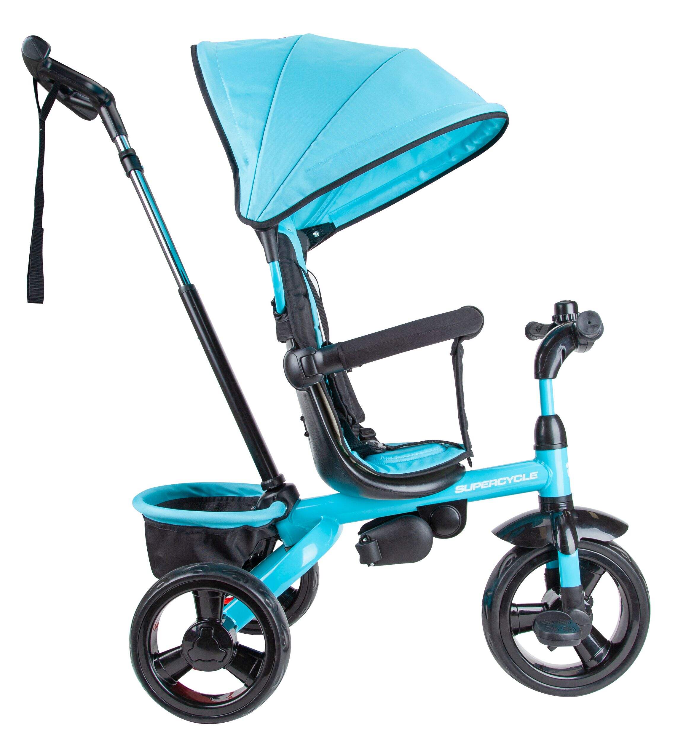 The Supercycle Convertible Trike is a versatile ride that grows with your kids. It transforms into four modes: push stroller, push trike, training trike, and classic trike. It features a removable, foldable canopy for UV protection, a comfortable, detachable seat cushion, a storage basket, and a front fender to keep mud away. This versatile trike offers safety and convenience as your child grows.