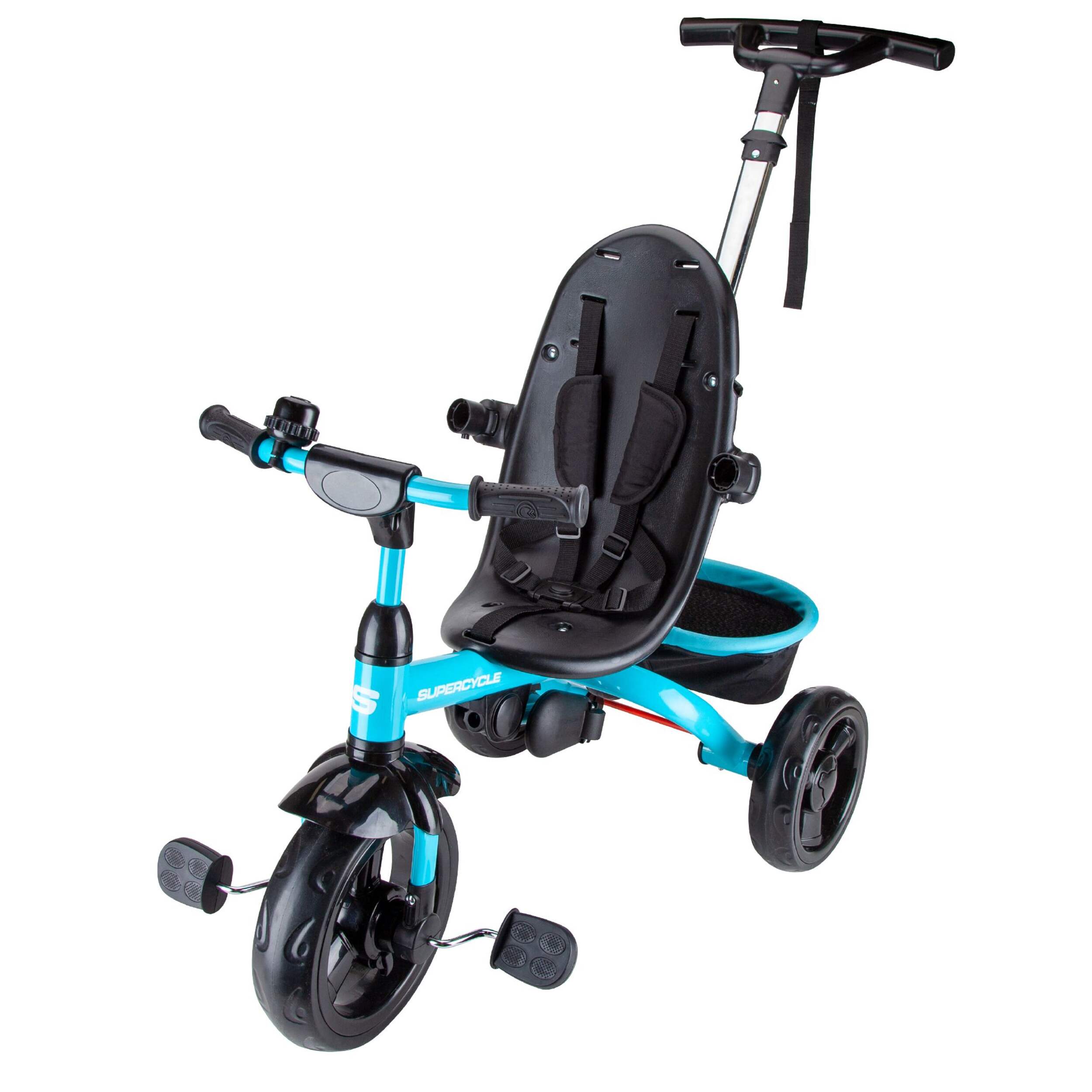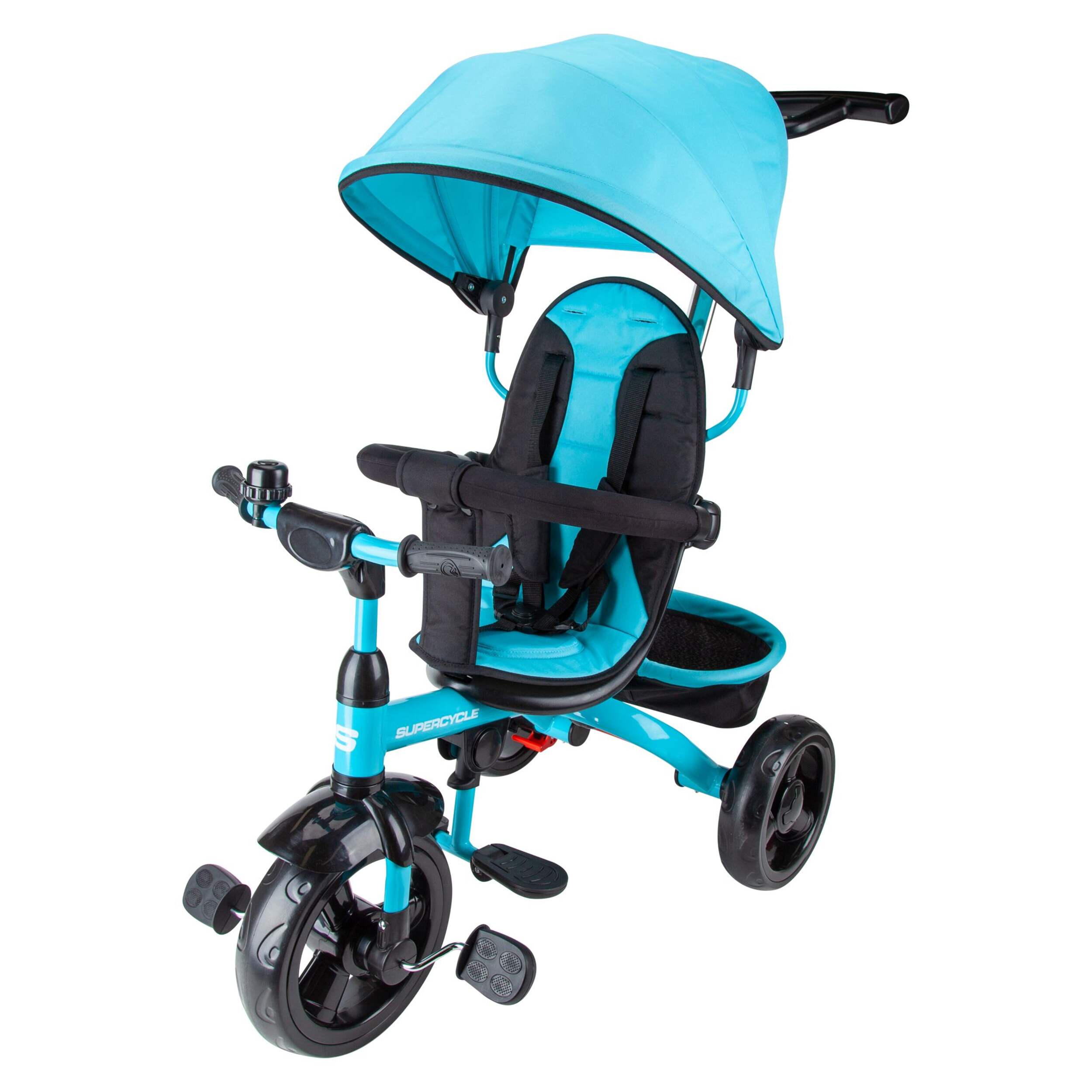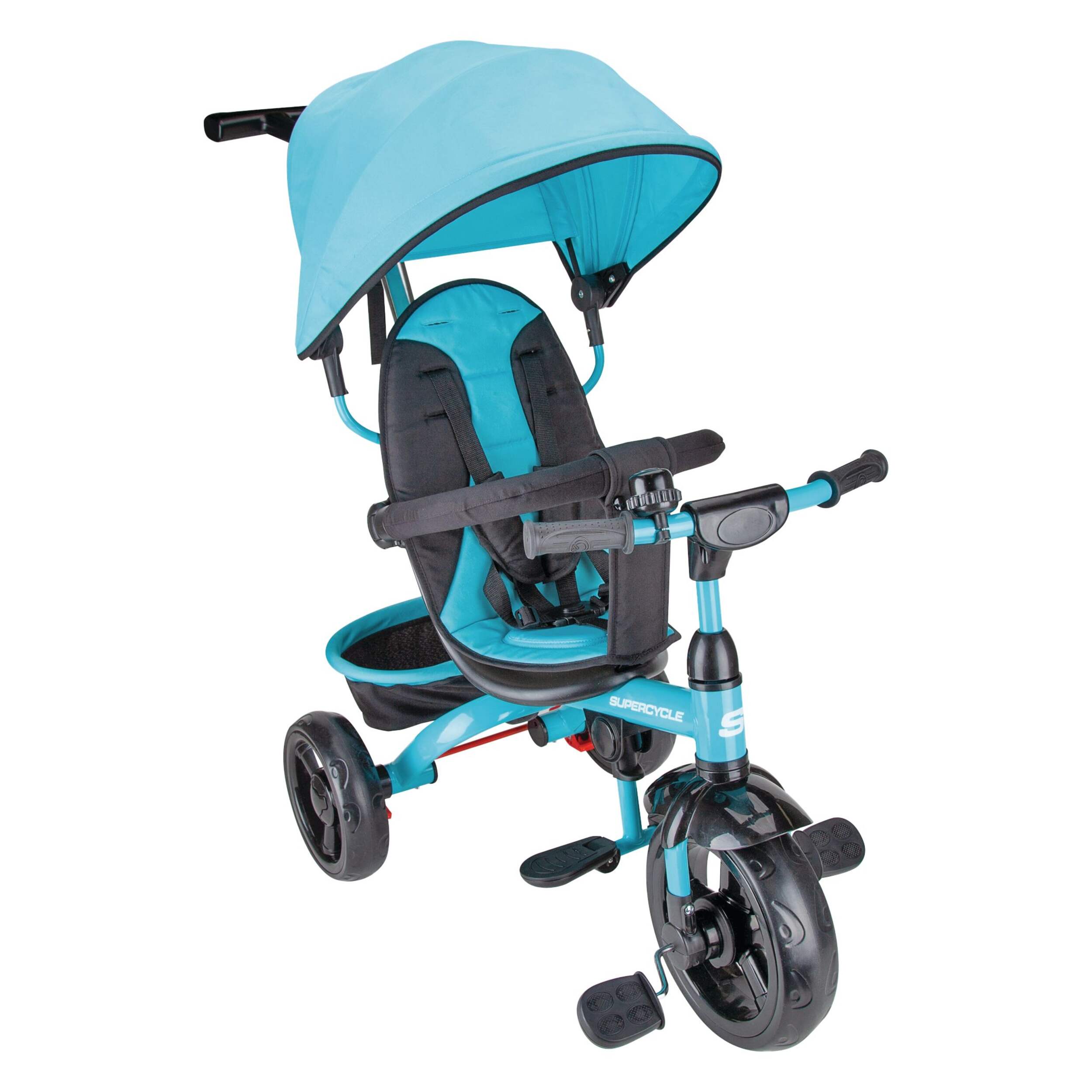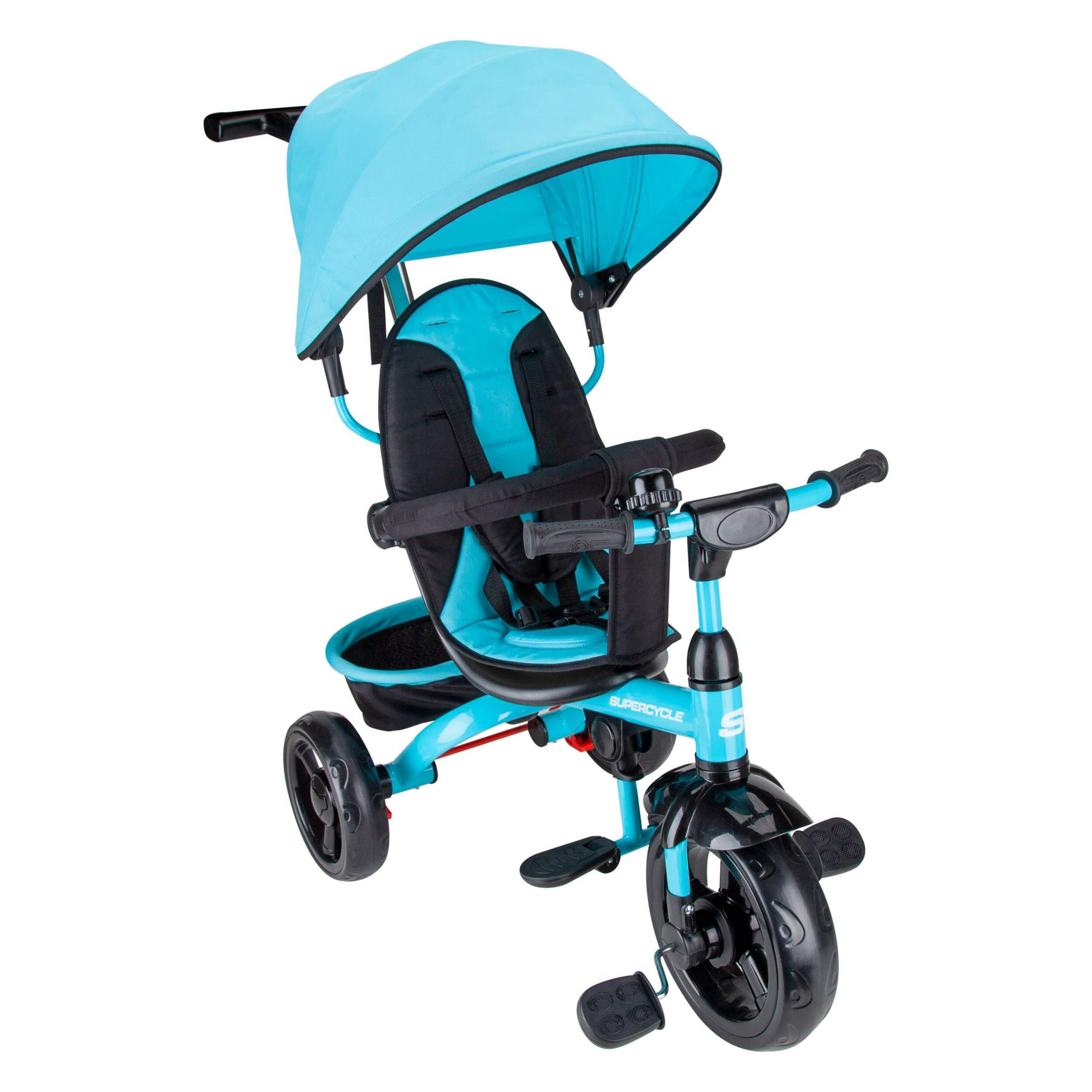 The Supercycle Convertible Trike is a versatile ride that grows with your kids. It transforms into four modes: push stroller, push trike, training trike, and classic trike. It features a removable, foldable canopy for UV protection, a comfortable, detachable seat cushion, a storage basket, and a front fender to keep mud away. This versatile trike offers safety and convenience as your child grows.