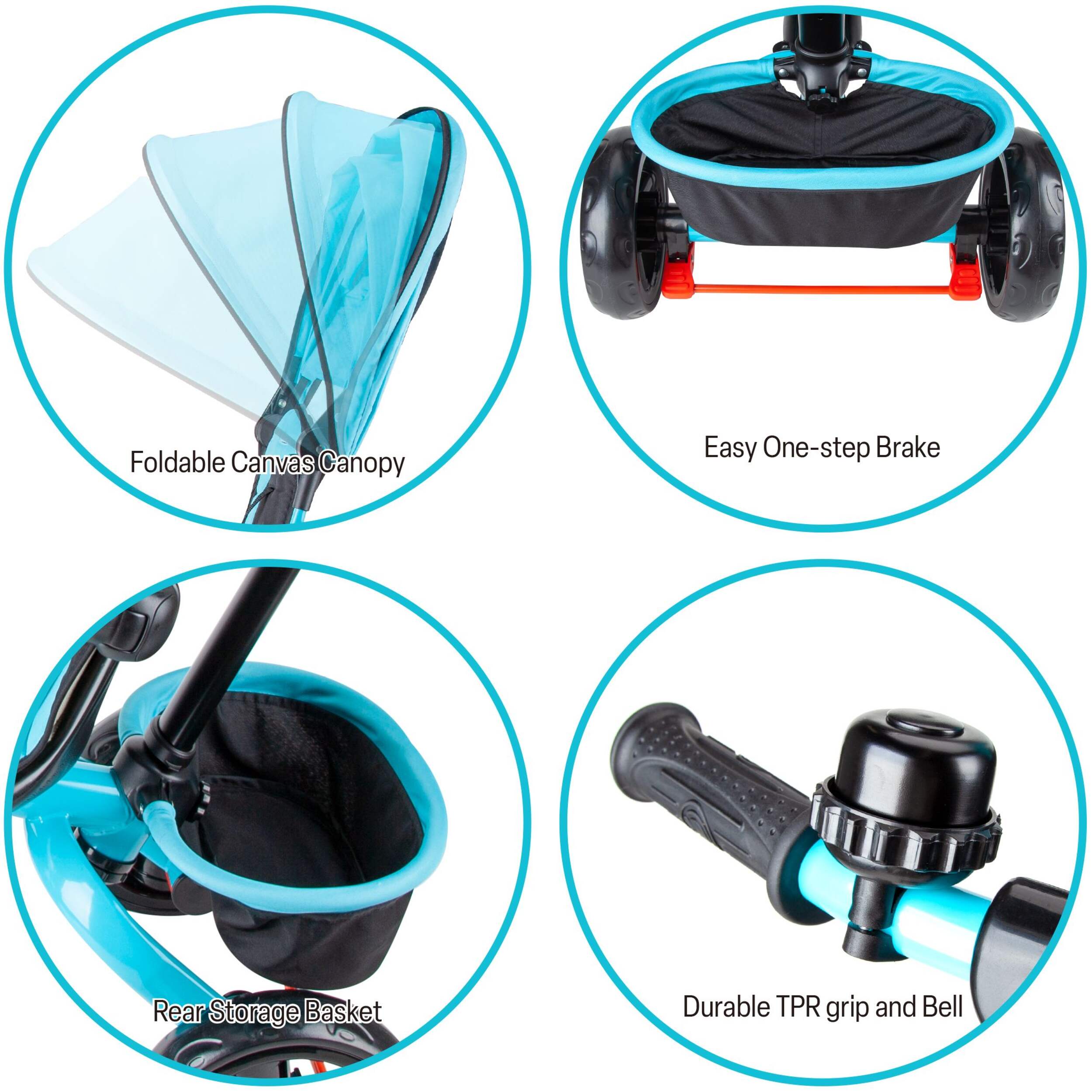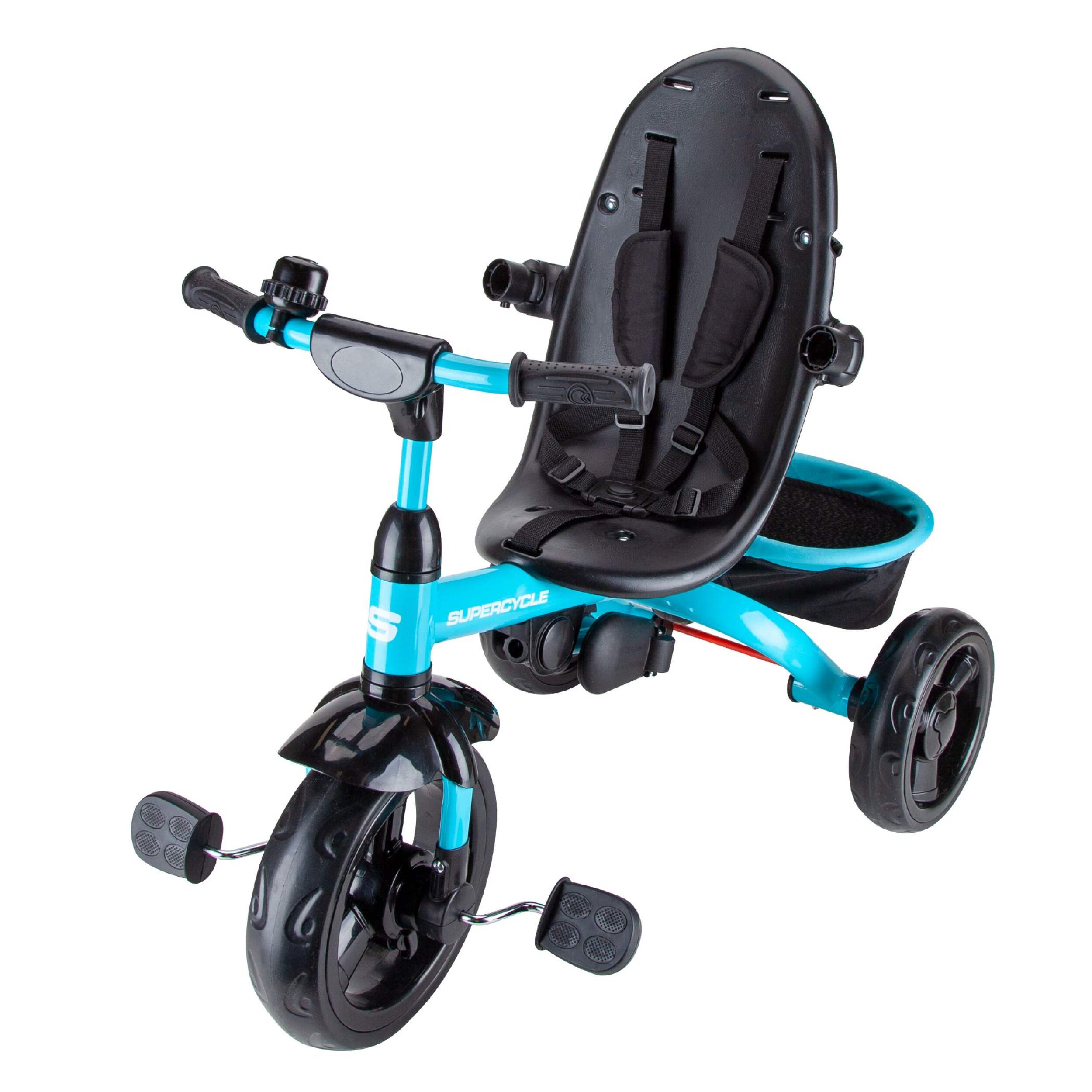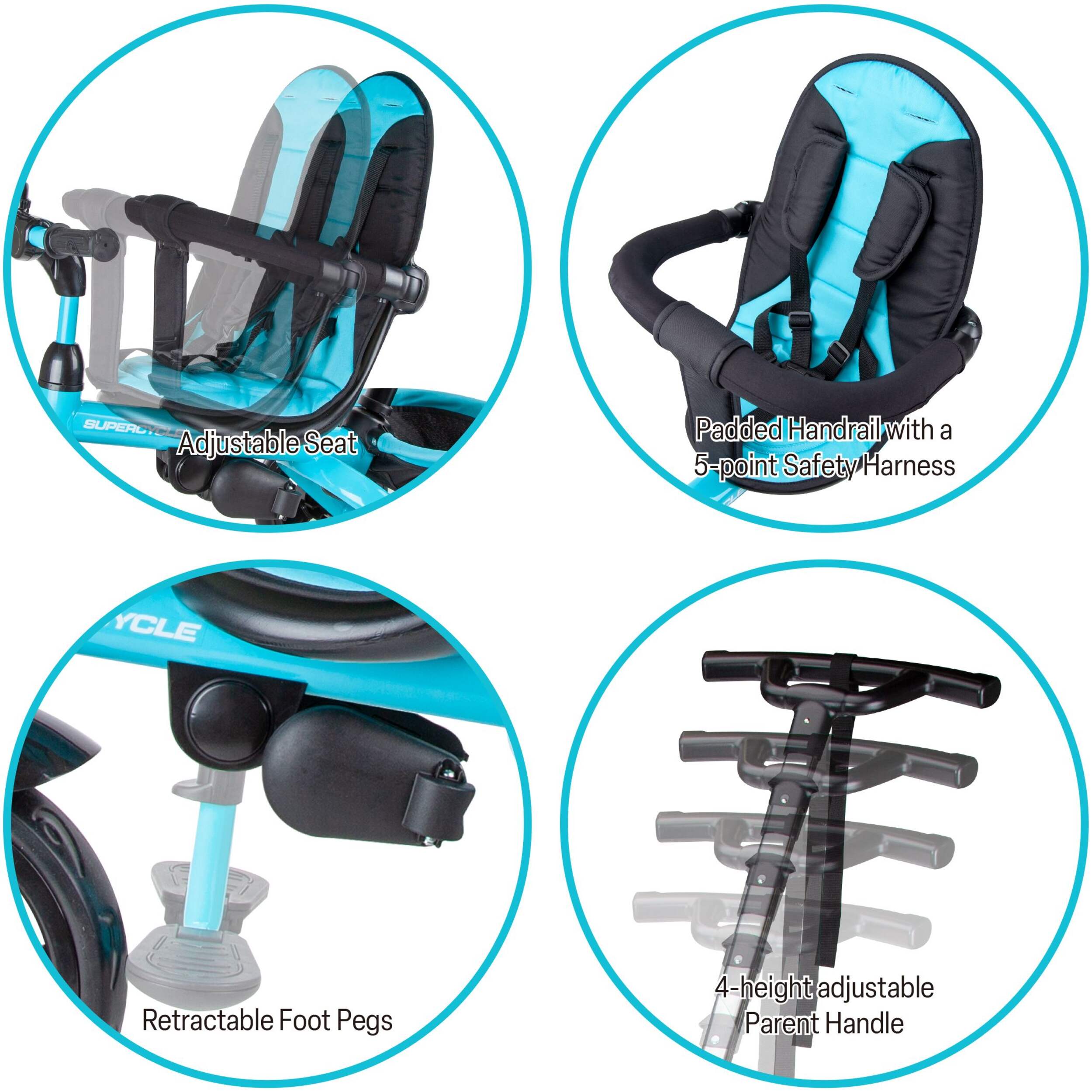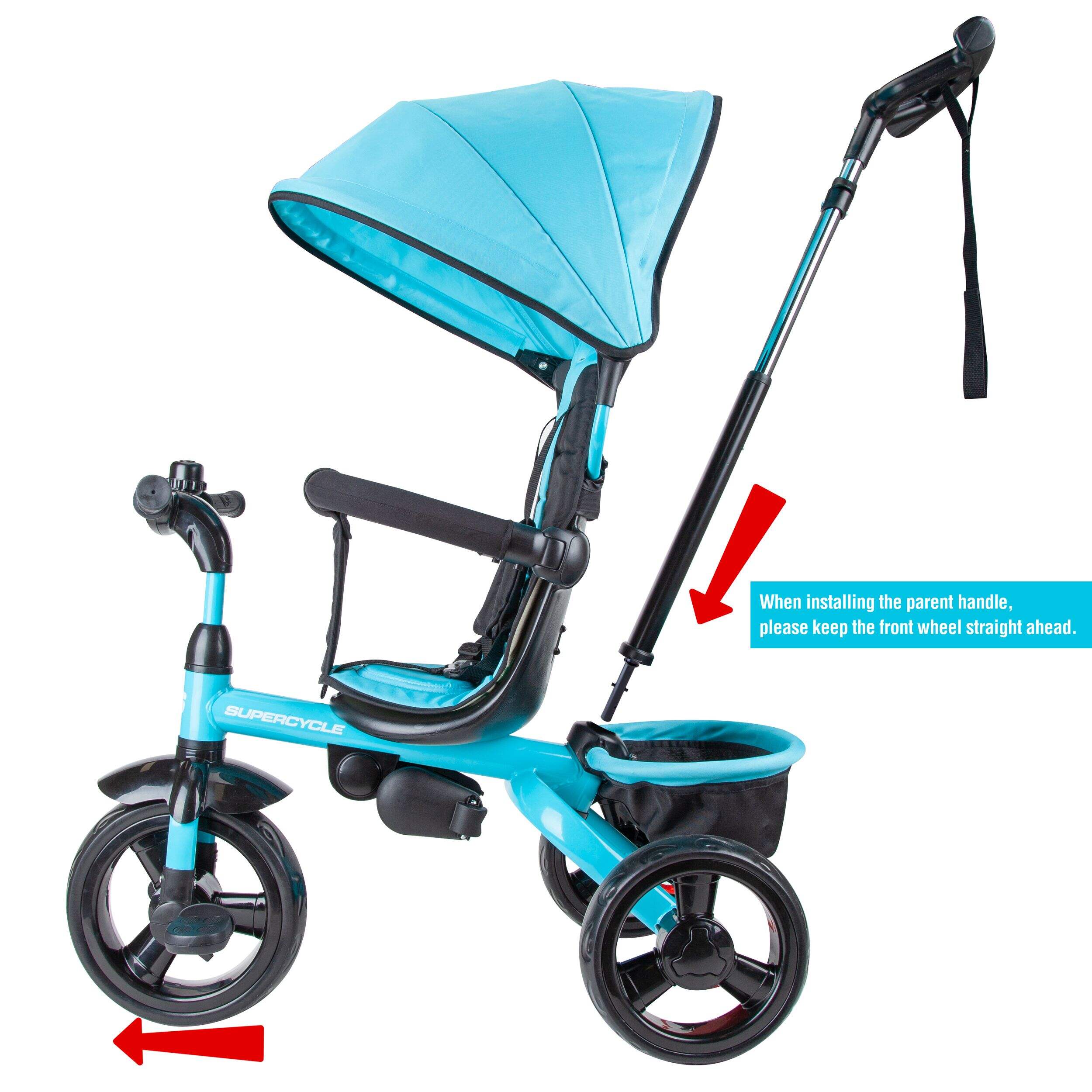 The Supercycle Convertible Trike is a versatile ride that grows with your kids. It transforms into four modes: push stroller, push trike, training trike, and classic trike. It features a removable, foldable canopy for UV protection, a comfortable, detachable seat cushion, a storage basket, and a front fender to keep mud away. This versatile trike offers safety and convenience as your child grows.