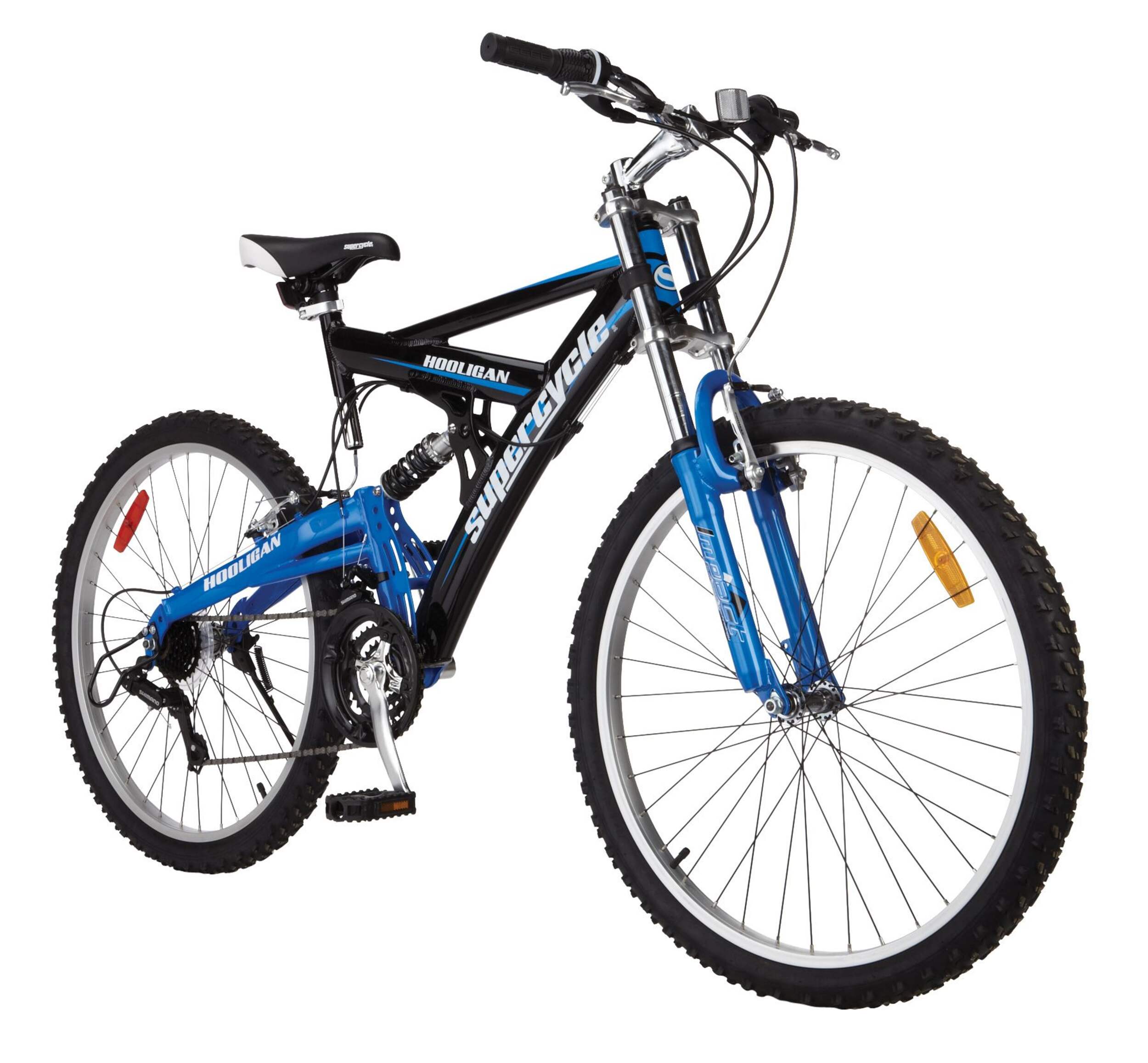 The Supercycle Hooligan 26" Full Suspension Mountain Bike features legendary dual suspension with a downhill fork. Since its inception in 2002, the Hooligan has conquered every bit of terrain you can throw at it. Its main feature is an aluminum frame and double-crown downhill style fork and, when combined with its wider size tires, alloy "V" brakes and Shimano derailleurs, the Hooligan is tried, tested, and proven.