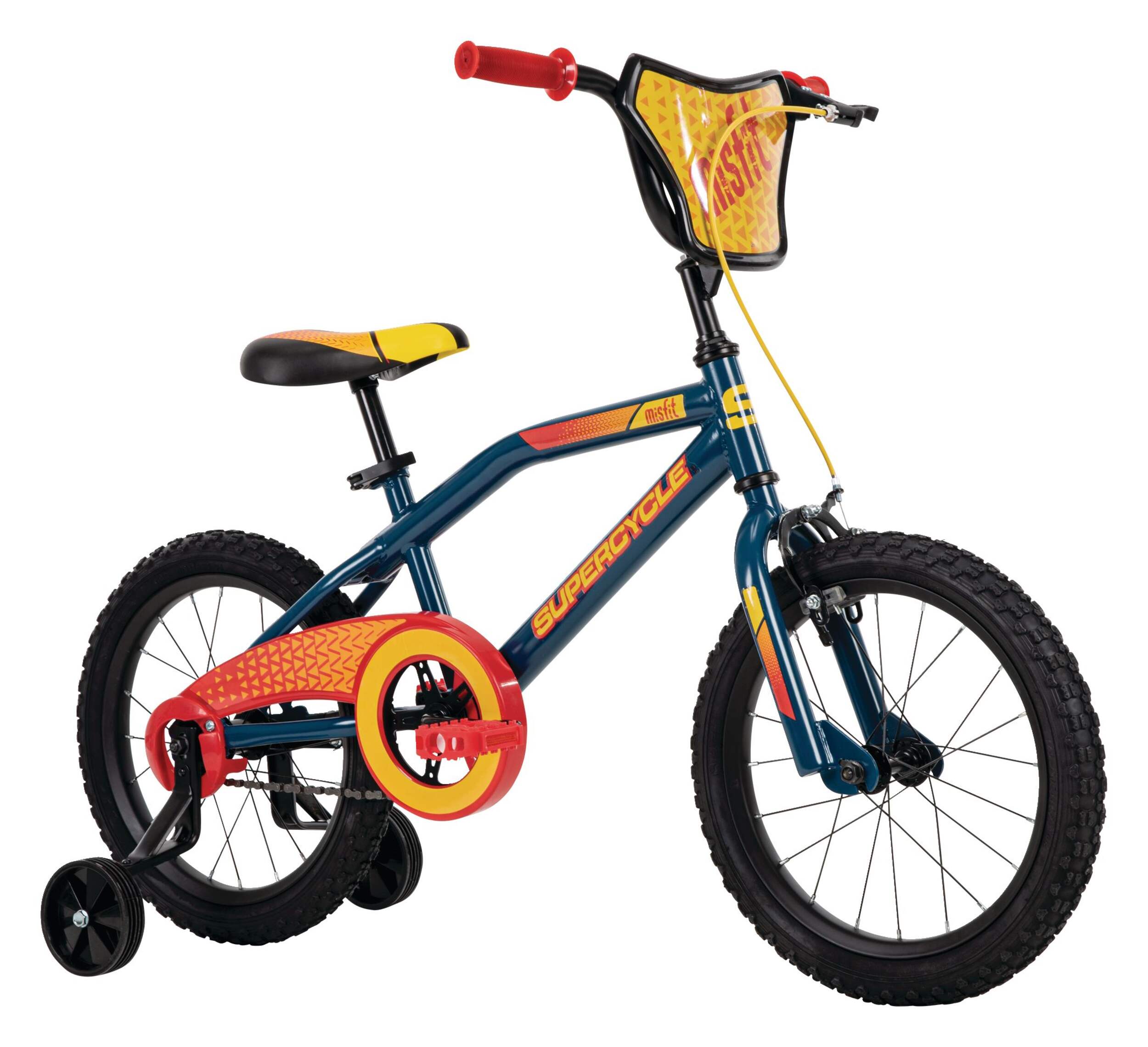 The Supercycle Misfit Kids' Bike delivers fun and functionality for young riders. Built with a durable 9-in steel frame and 16-in wheels, this bike offers lasting performance and stability. Featuring both a front hand brake and rear coaster brake, it ensures reliable stopping power. Removable training wheels help beginners build confidence, while the 3D handlebar plaque adds a playful touch to the design.