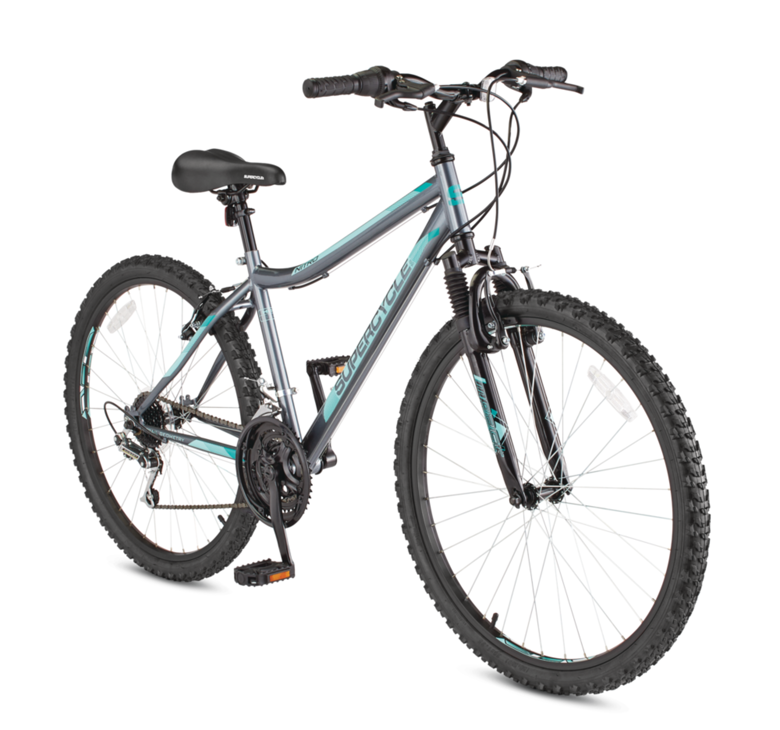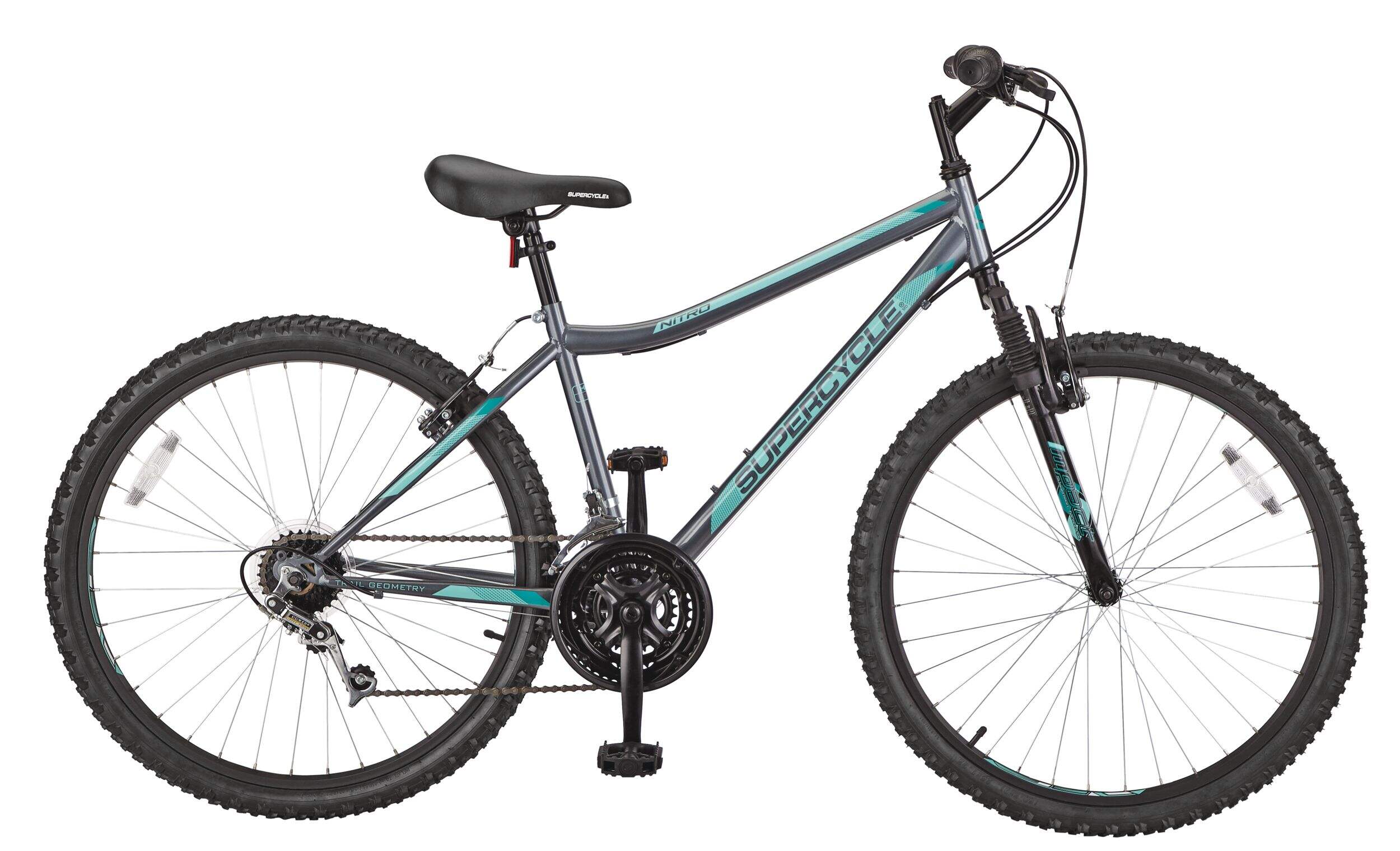 The Supercycle Nitro XT Hardtail Mountain Bike, 26-in, is built for riders looking to explore trails and urban paths with confidence. Featuring an 18-speed twist shifter and a durable steel frame, this bike provides reliable performance across varied terrains. Its front suspension fork absorbs shocks, delivering a smoother ride on rugged trails, while the 26-in wheels offer stability and control. The Supercycle Nitro XT combines function and design, making it an ideal choice for beginner to intermediate cyclists.
