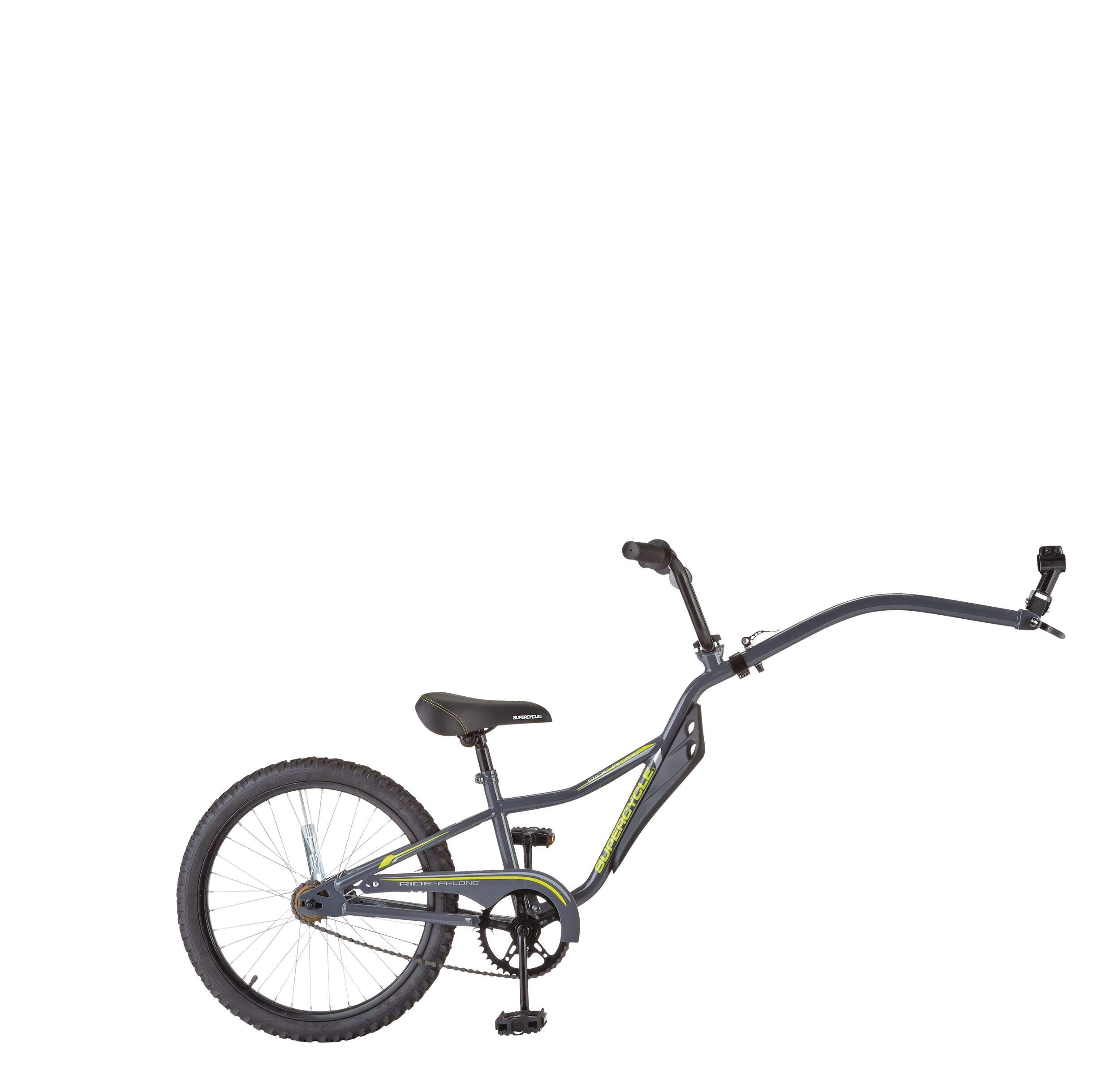 The Supercycle Ride-A-Long Bike Trailer/ Co-Pilot Bike Trailer, 20-in Wheels, Kids, Grey, is perfect for active families. This ride-along bike has a single-speed drivetrain with 20 inches (50.8 cm) wheels. It features durable steel construction and attaches quickly and easily to adult bicycles. The bicycle trailer is ideal for weekend adventures or commuting with kids. Thanks to the easy design, kids can simply pedal or just sit back and enjoy. This single bike trailer includes adjustable seat height and a padded handlebar for extra comfort and a controlled grip.
