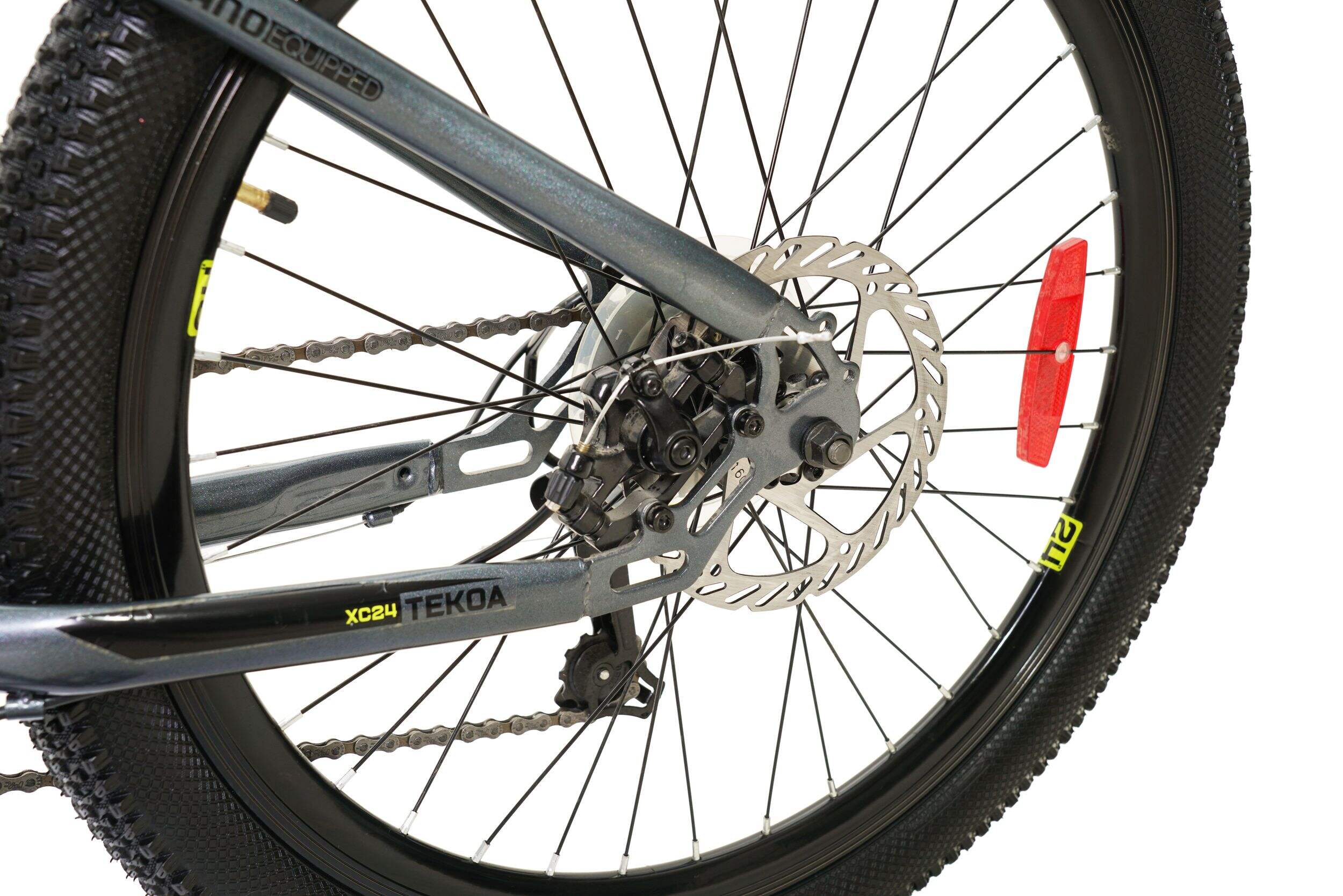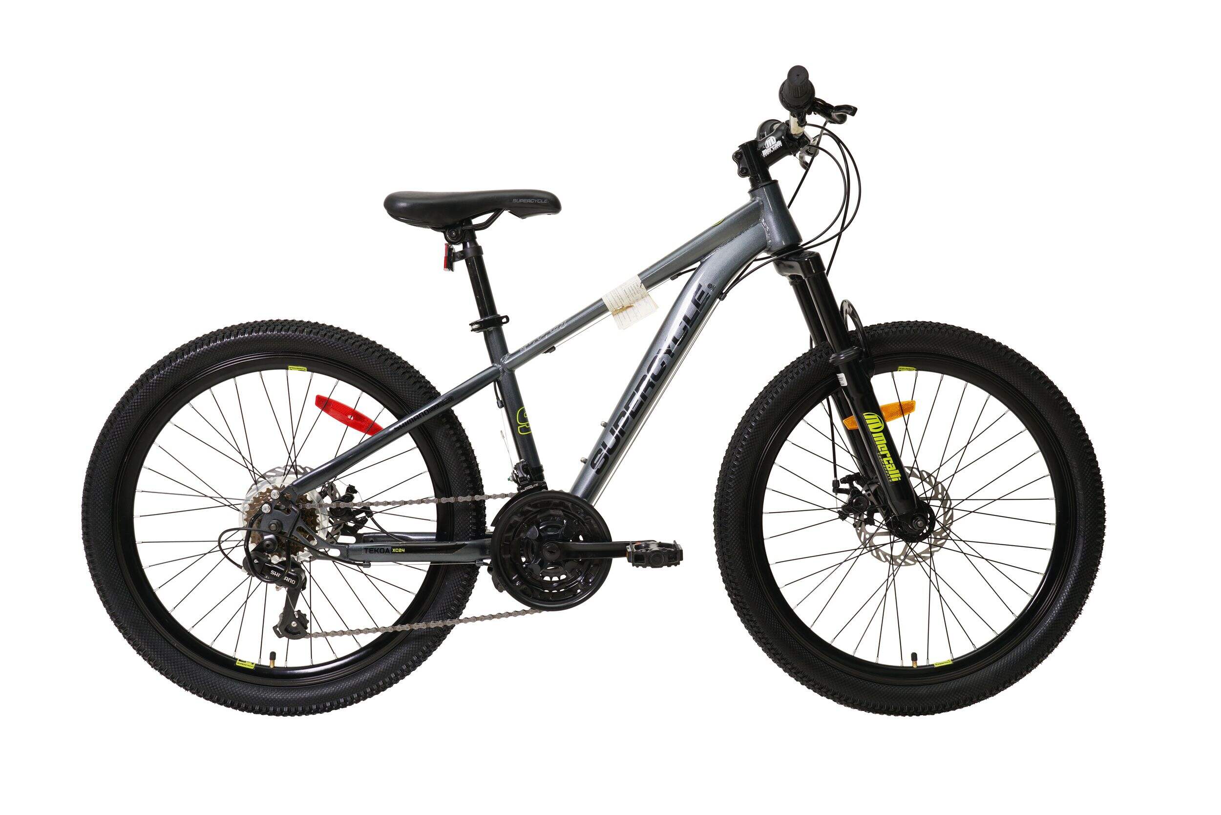 Get ready for the trails with the Supercycle Tekoa Bike, 21-Speed, 24-in. This mountain bicycle features a strong, lightweight, and versatile HT frame, ideal for off-road cycling. Its 24 inches wheels reduce fatigue and provide a smooth ride. Thanks to the 21-speed grip-shifting system, you can ride this bike at a comfortable pace. Sturdy and durable, this trek mountain bike provides an easier, better, and more intuitive ride. Known for its mechanism and material selection, the bicycle features Shimano rear derailleur for increased performance. The front and rear disc brakes are easy to control and require less effort to stop the bike. Engineered to improve balance and comfort over rough terrains, this hardtail mountain bike is perfect for outdoor adventures.