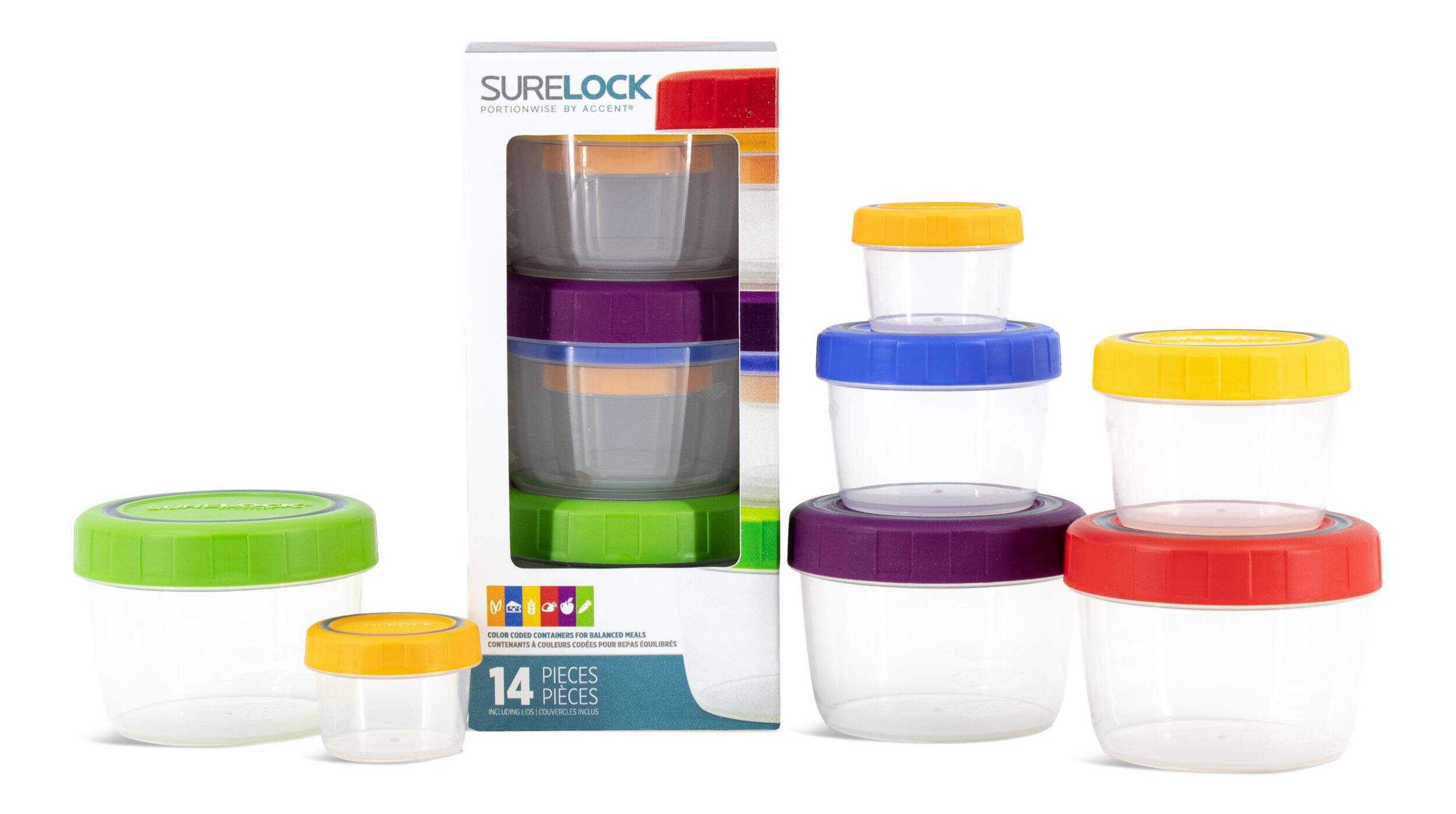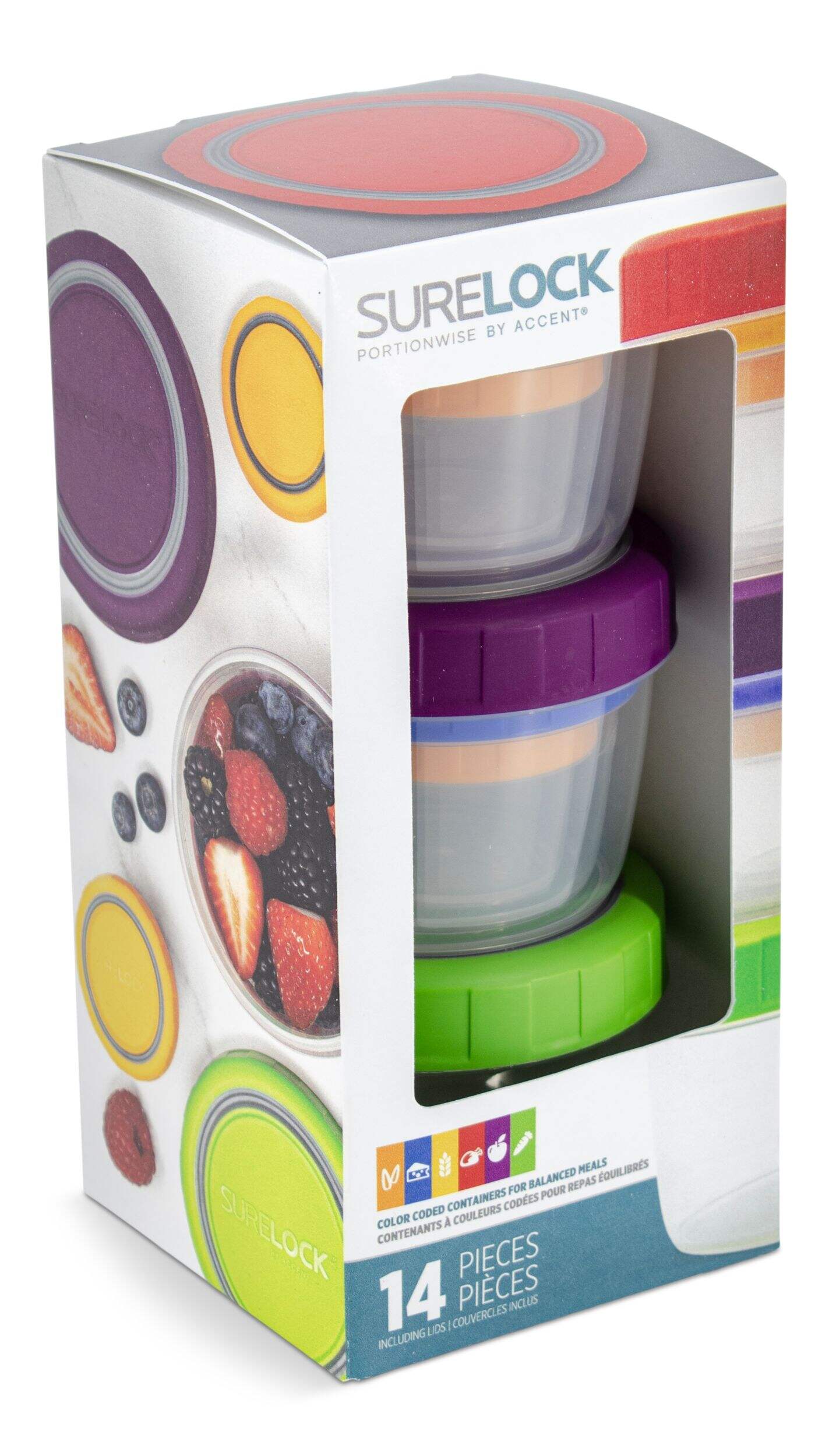 Injection molded polypropylene containers featuring a unique co-molded threaded lid design that is leakproof and airtight. Graduated sizing makes SURELOCK stackable and nestable for space saving storage.