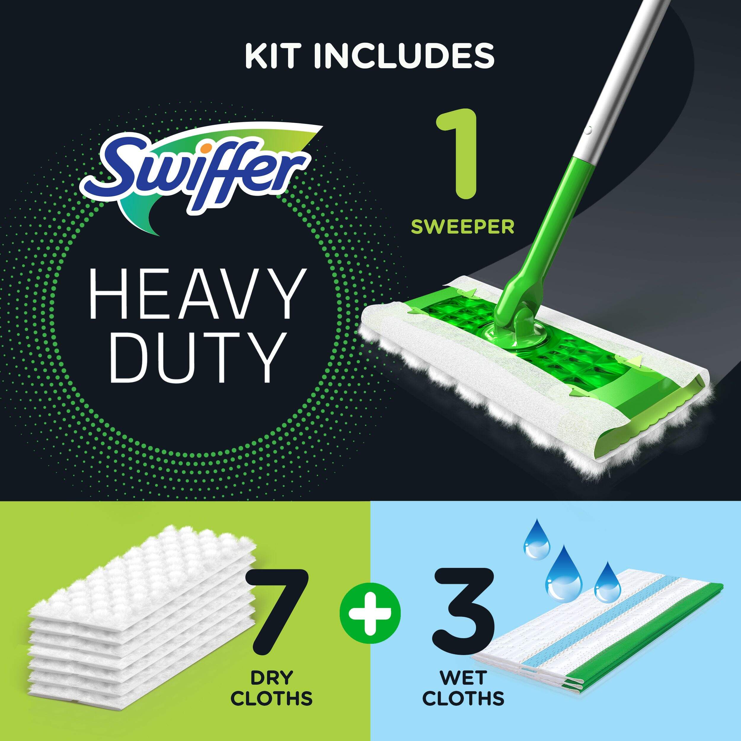 Starter kit includes 1 Sweeper Device, 2 Dry Heavy Duty Cloths, 1 Wet Heavy Duty Pads, 5 Dry Sweeping Cloths, 2 Wet Mopping Pads