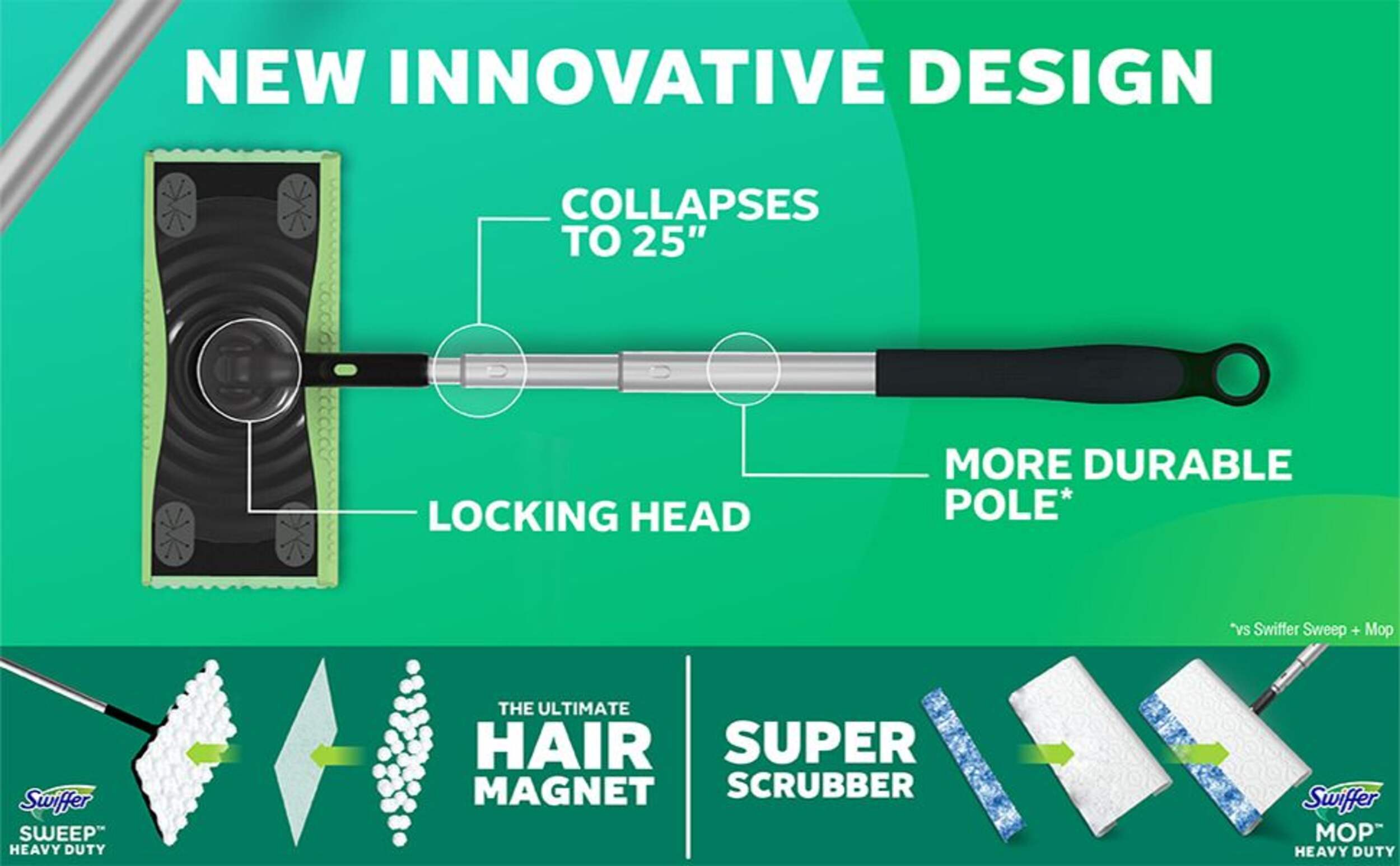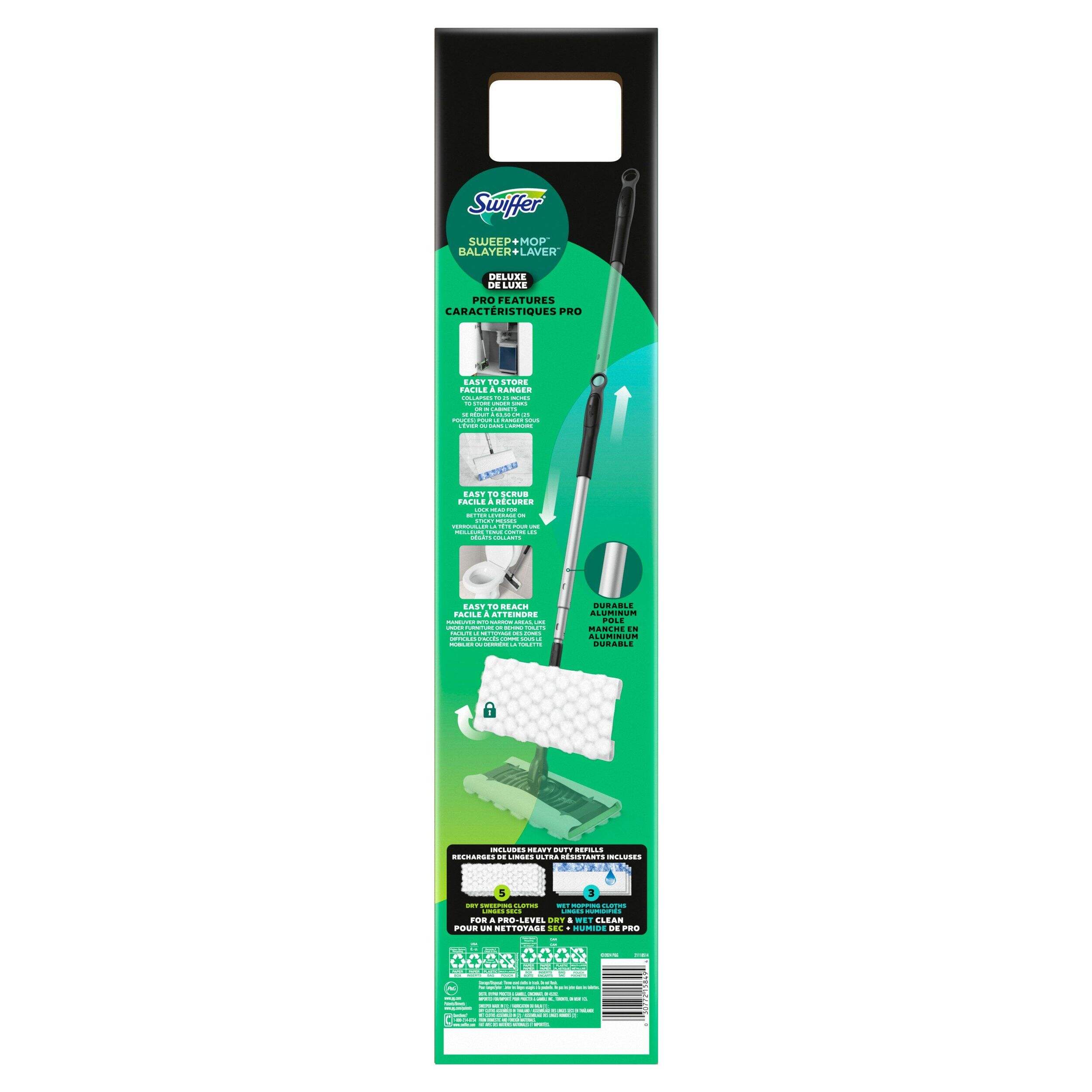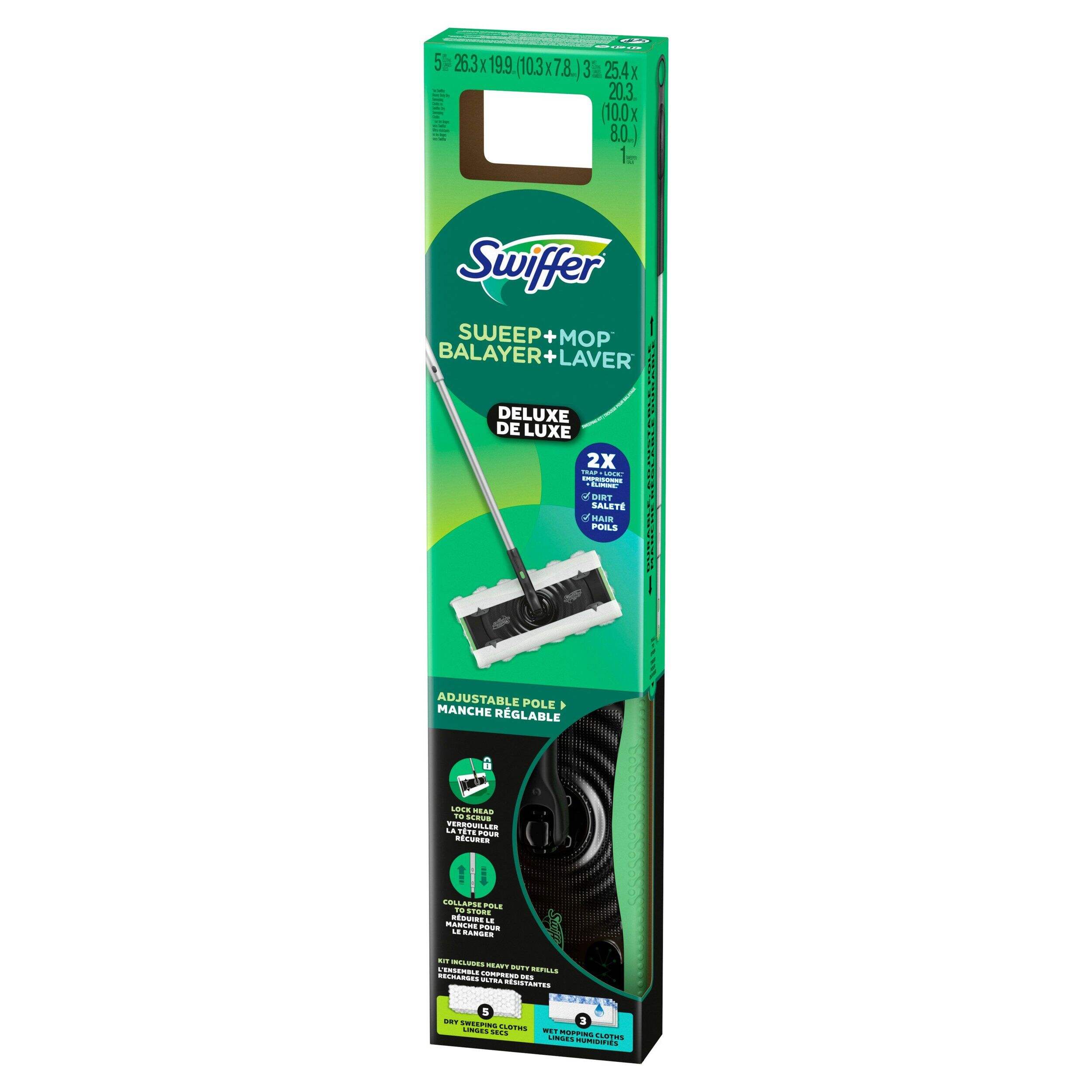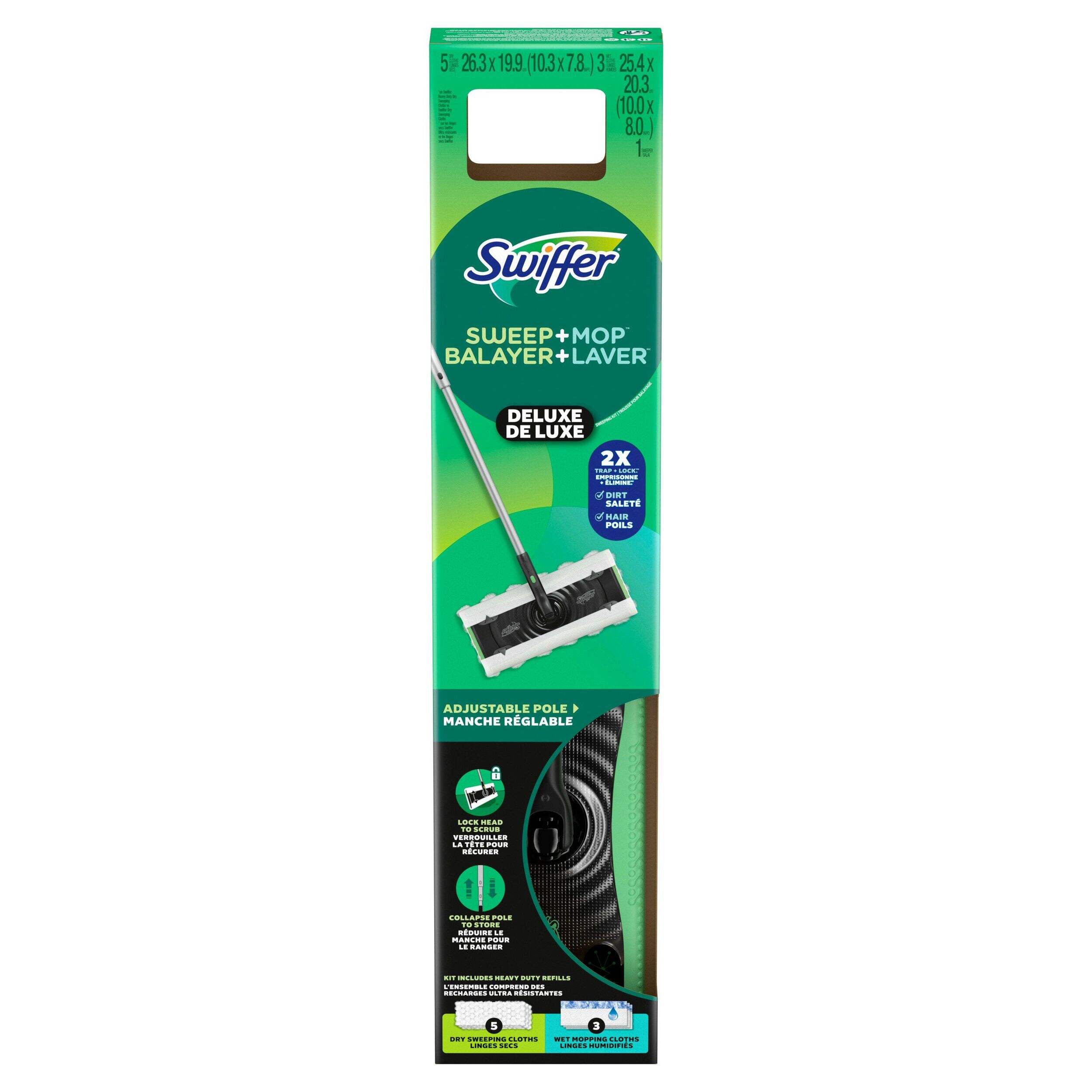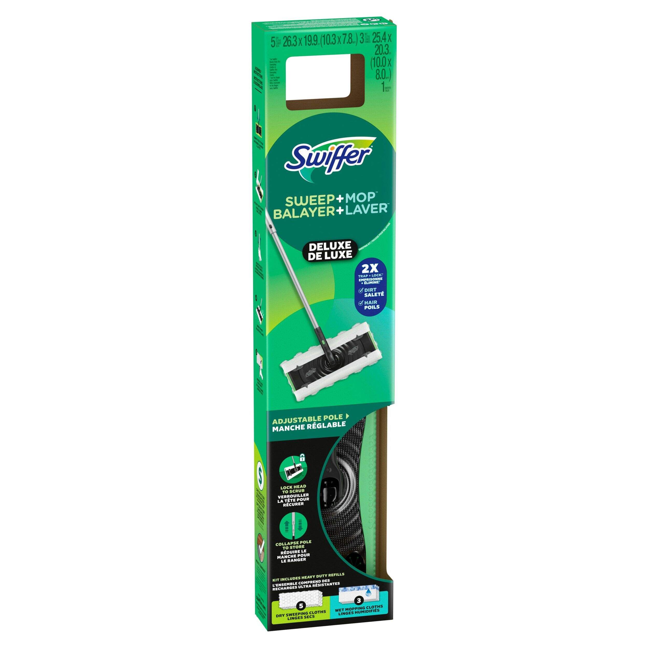 This Swiffer Sweeper Pro 2-in-1 Dry & Wet Floor Mopping and Sweeping Starter Kit is designed for both sweeping and mopping. The Heavy Duty Dry cloths have fluffy 3D fibers that reach deep in grooves to trap and lock 2X (vs. Swiffer Sweeper Multi-Surface Dry Cloth) dirt, dust and hair, while the Heavy Duty Wet cloths easily absorb your tough messes. It’s a quick and easy combination of cleaning that gets dirt out of your home.