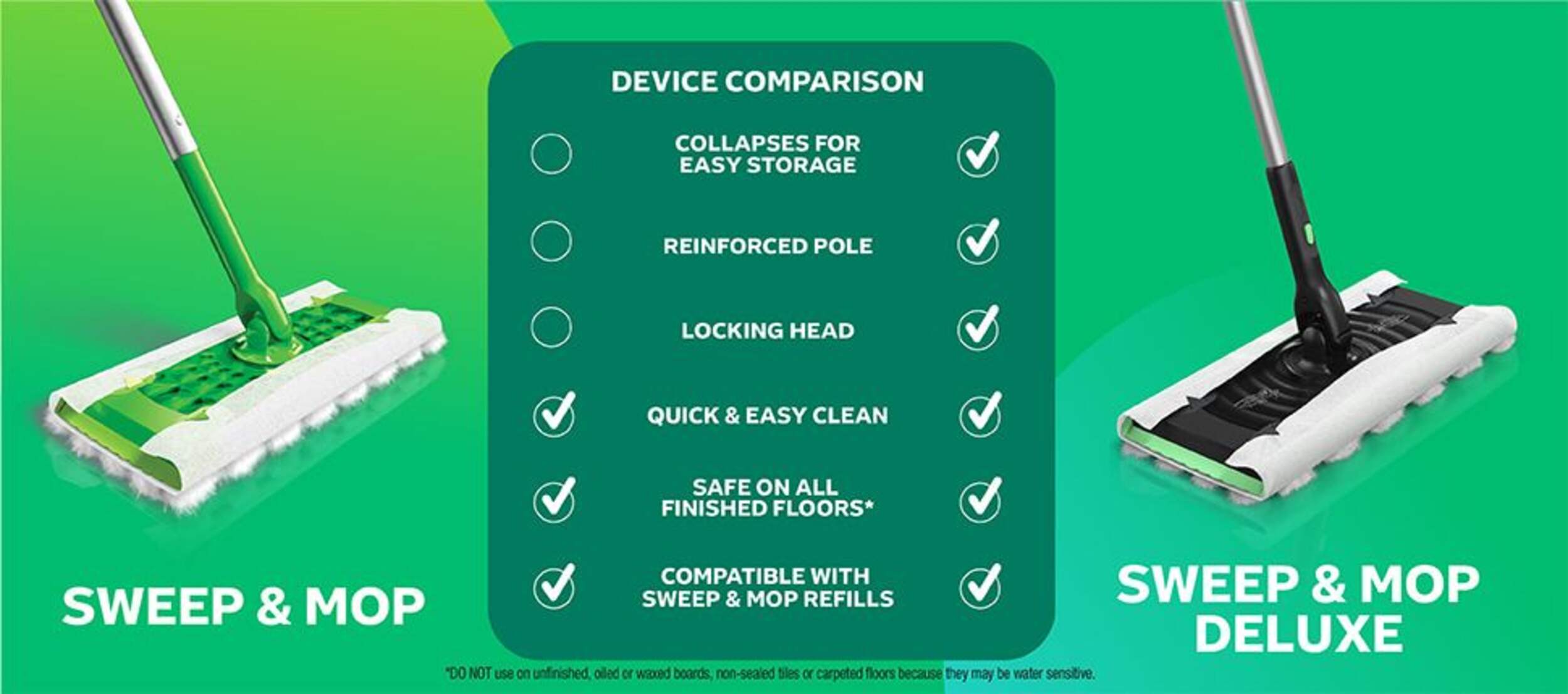 Starter Kit includes 1 Sweep and Mop Deluxe Device, 5 Heavy Duty Dry Sweeping Cloths, and 3 Heavy Duty Wet Mopping Cloths