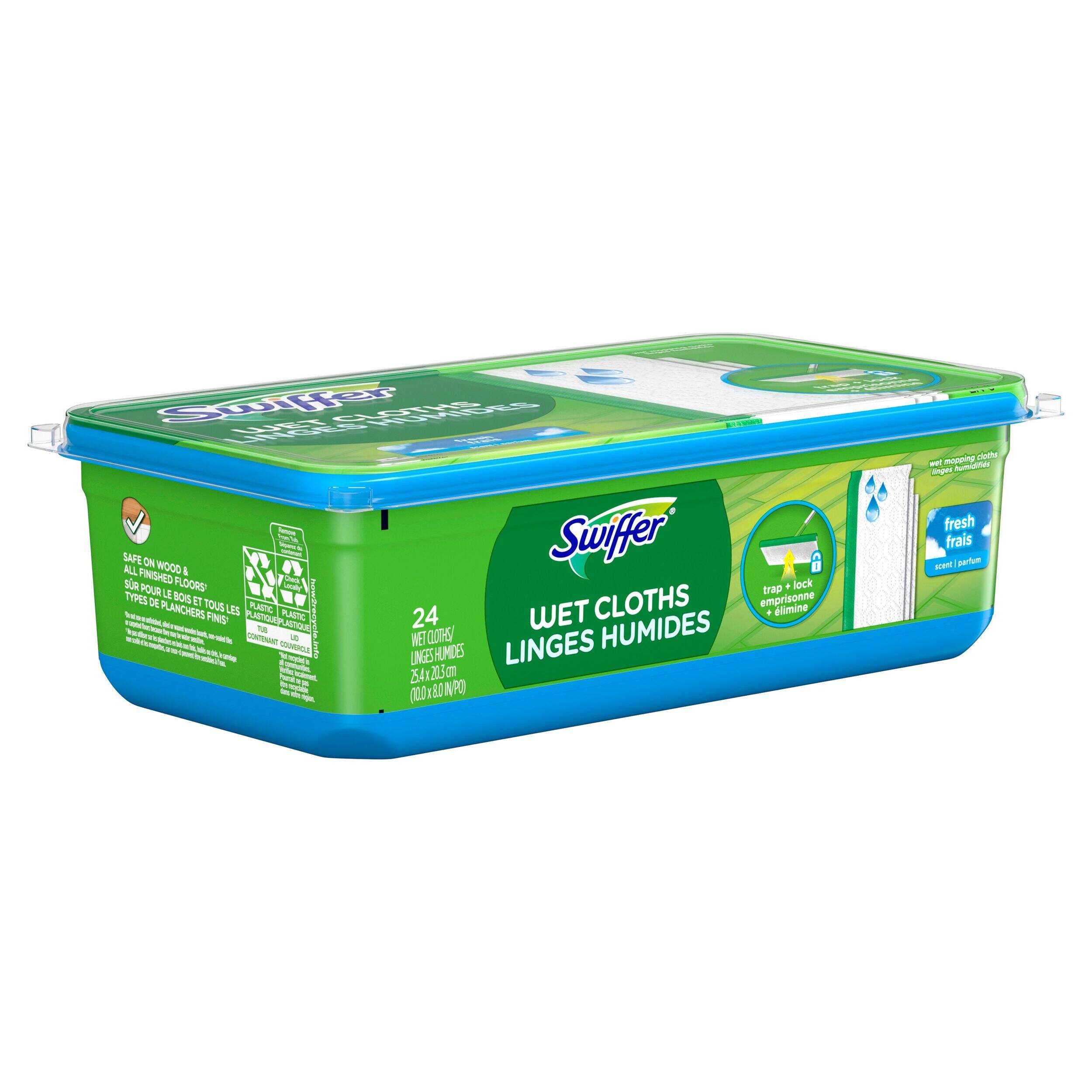 Swiffer Sweeper Wet mop textured cloths TRAP + LOCK™ dirt deep in cloth. They are safe to use on all finished floors* and have a scrubbing strip to remove tough spots. Use with your Swiffer Sweeper Dust Mop - the convenient combination of a broom and mop for a quick and easy clean.*Do not use on unfinished, oiled or waxed wooden boards, non-sealed tiles or carpeted floors because they may be water sensitive.