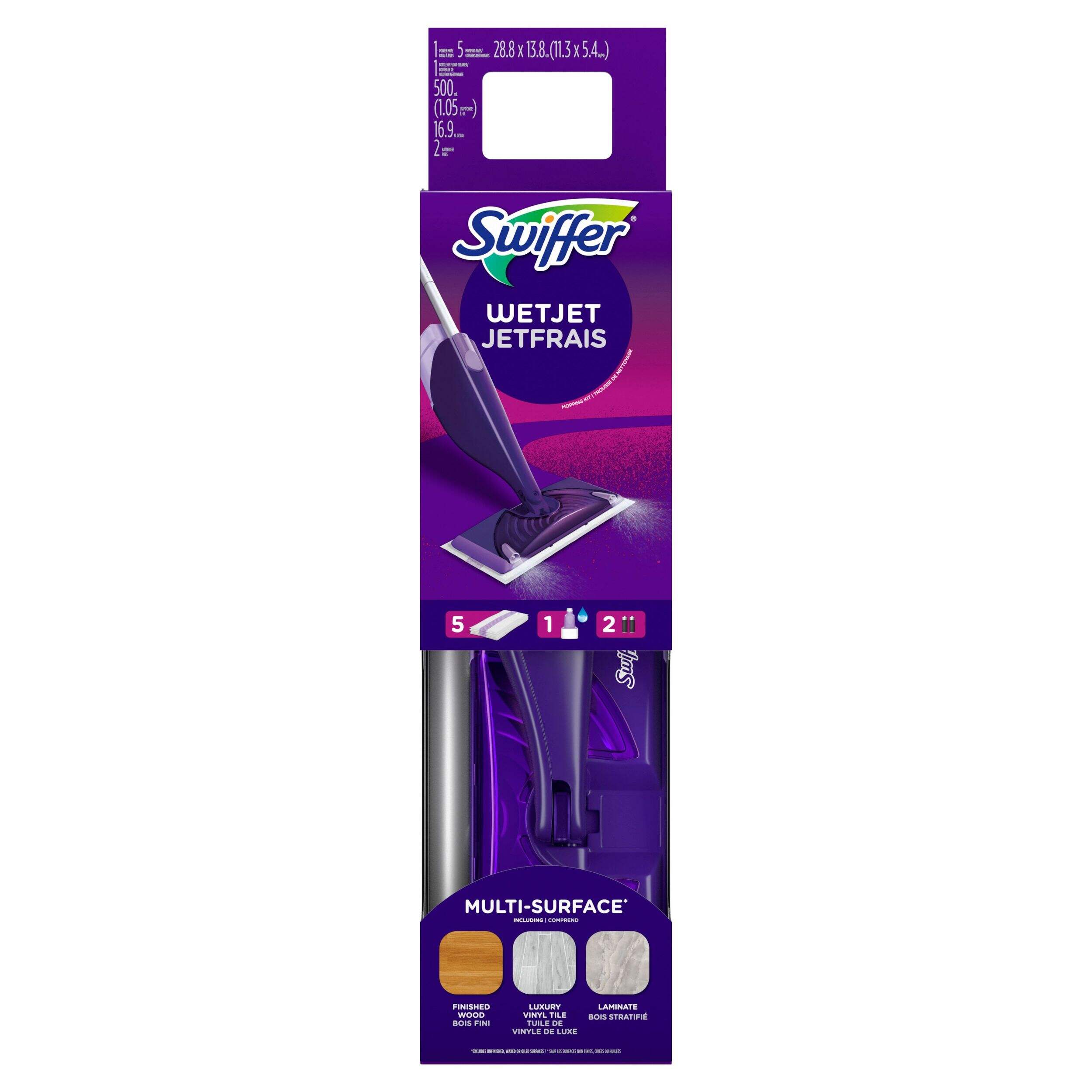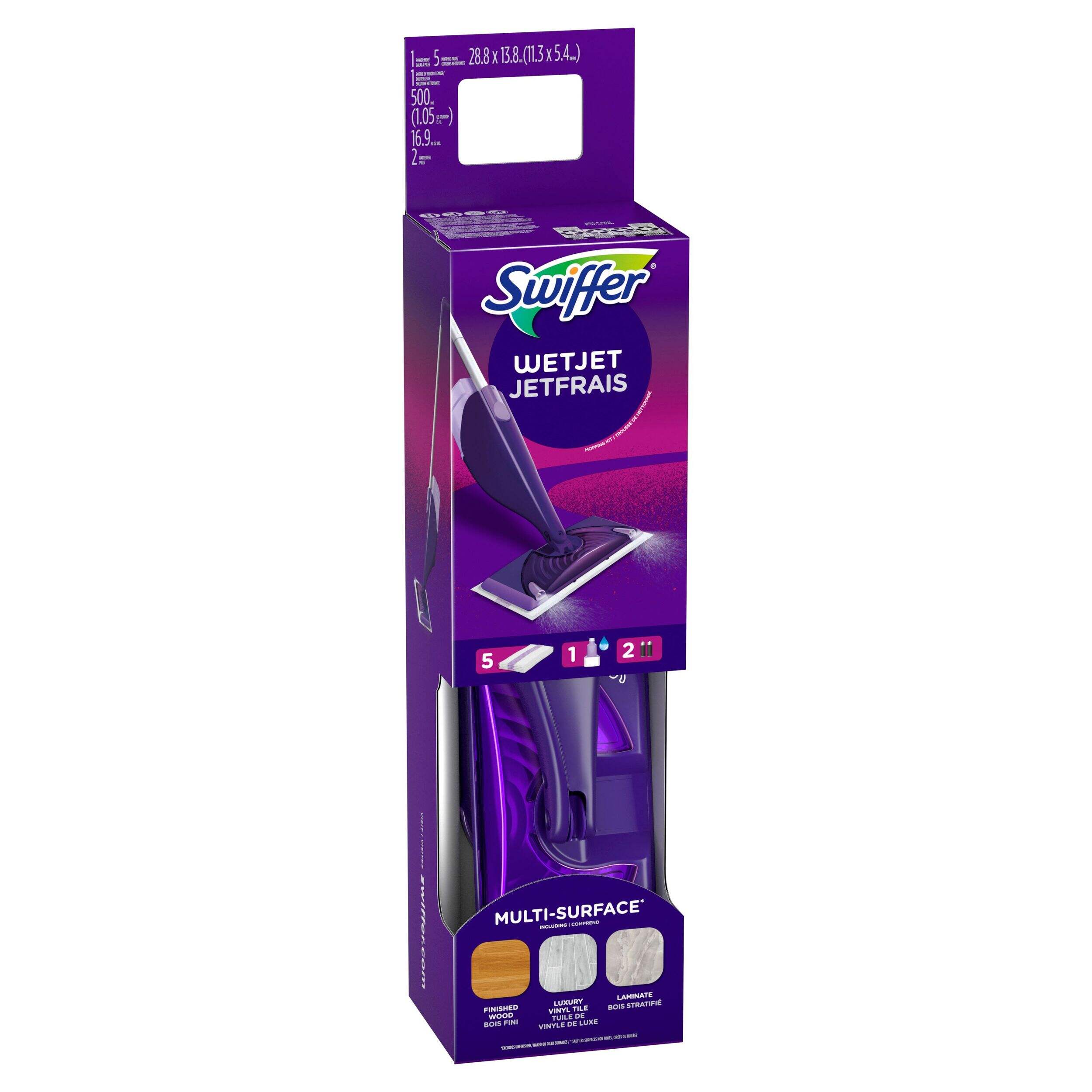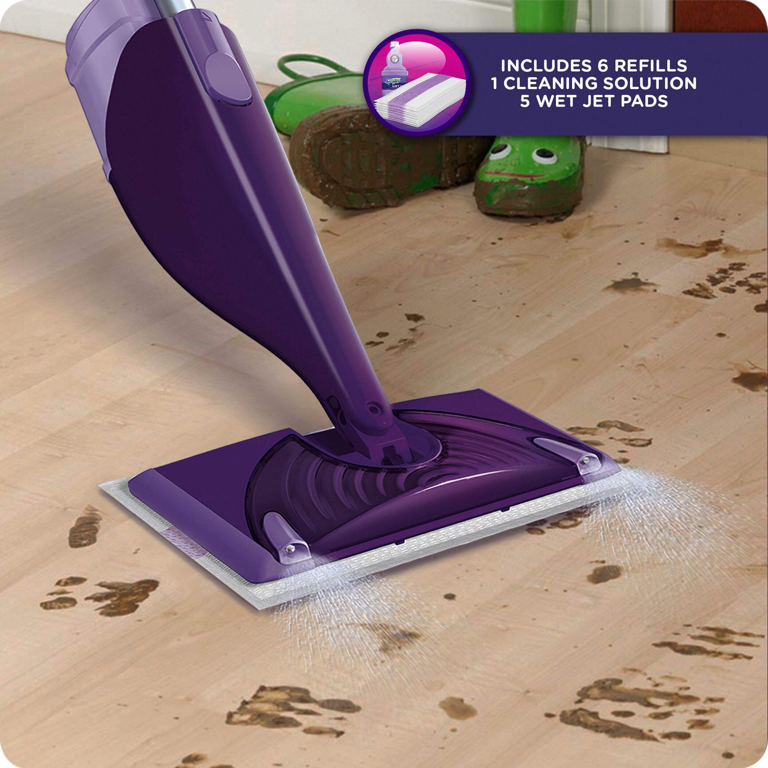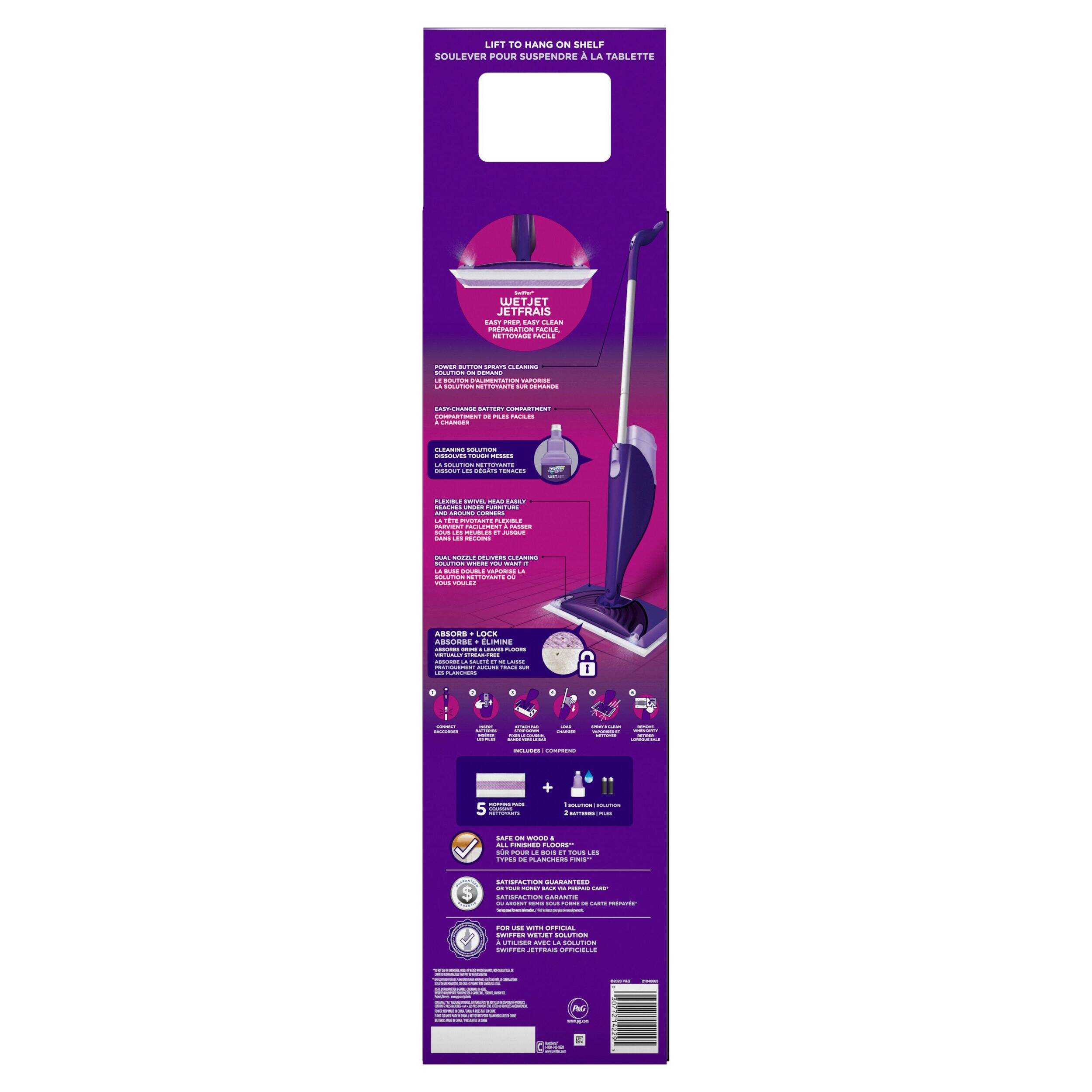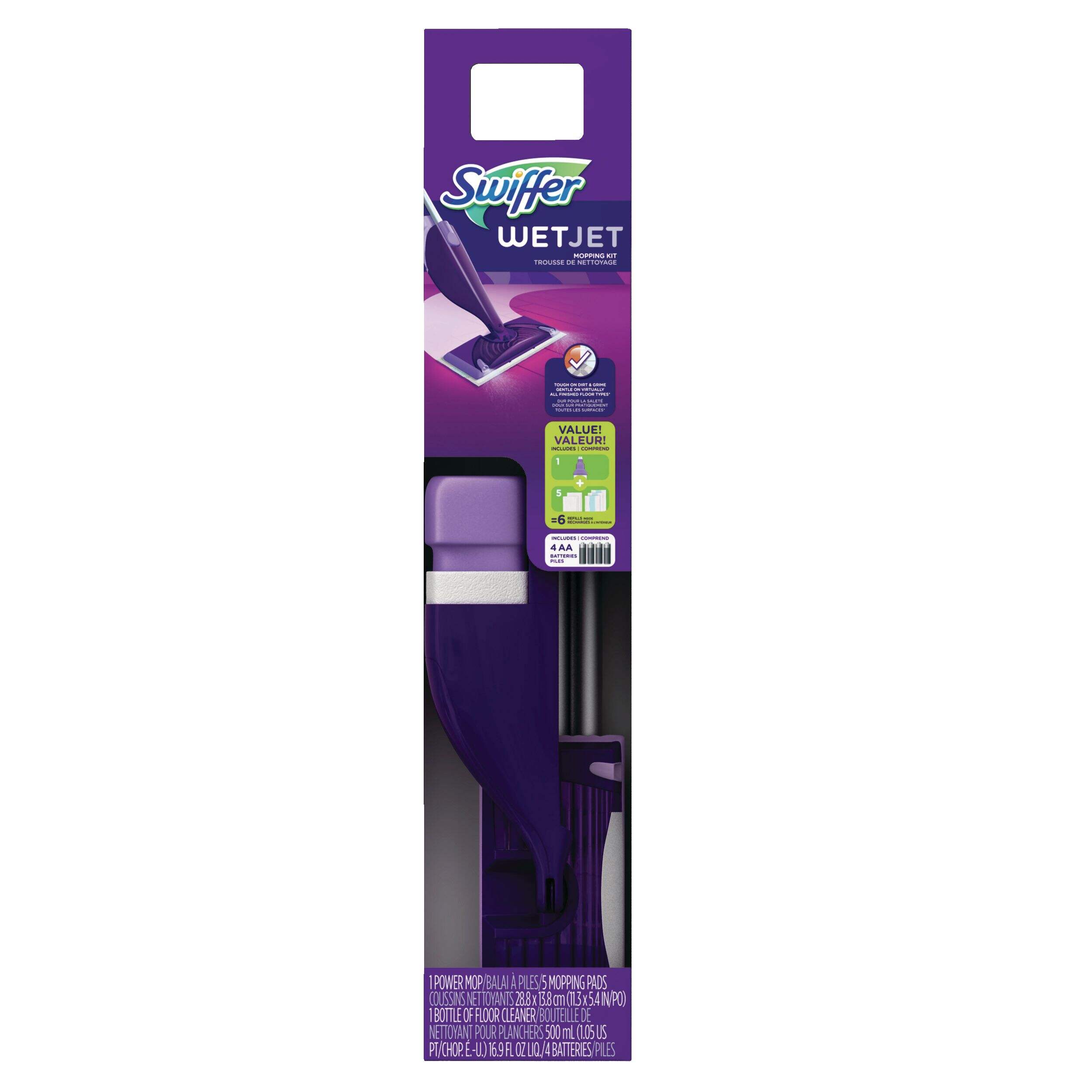Say goodbye to dirt and grime with the Swiffer WetJet Mop Starter Kit. This all-in-one spray mopping system is ready to use right out of the closet. Start with a fresh pad and spray the cleaning solution onto your floor through the uniquely designed, dual nozzled WetJet spray mop head. Then watch the dirt dissolve while the thick pad absorbs it deep inside so it doesn’t get pushed around. Do away with the hassle of your mop and bucket and enjoy the convenience of cleaning with Swiffer.