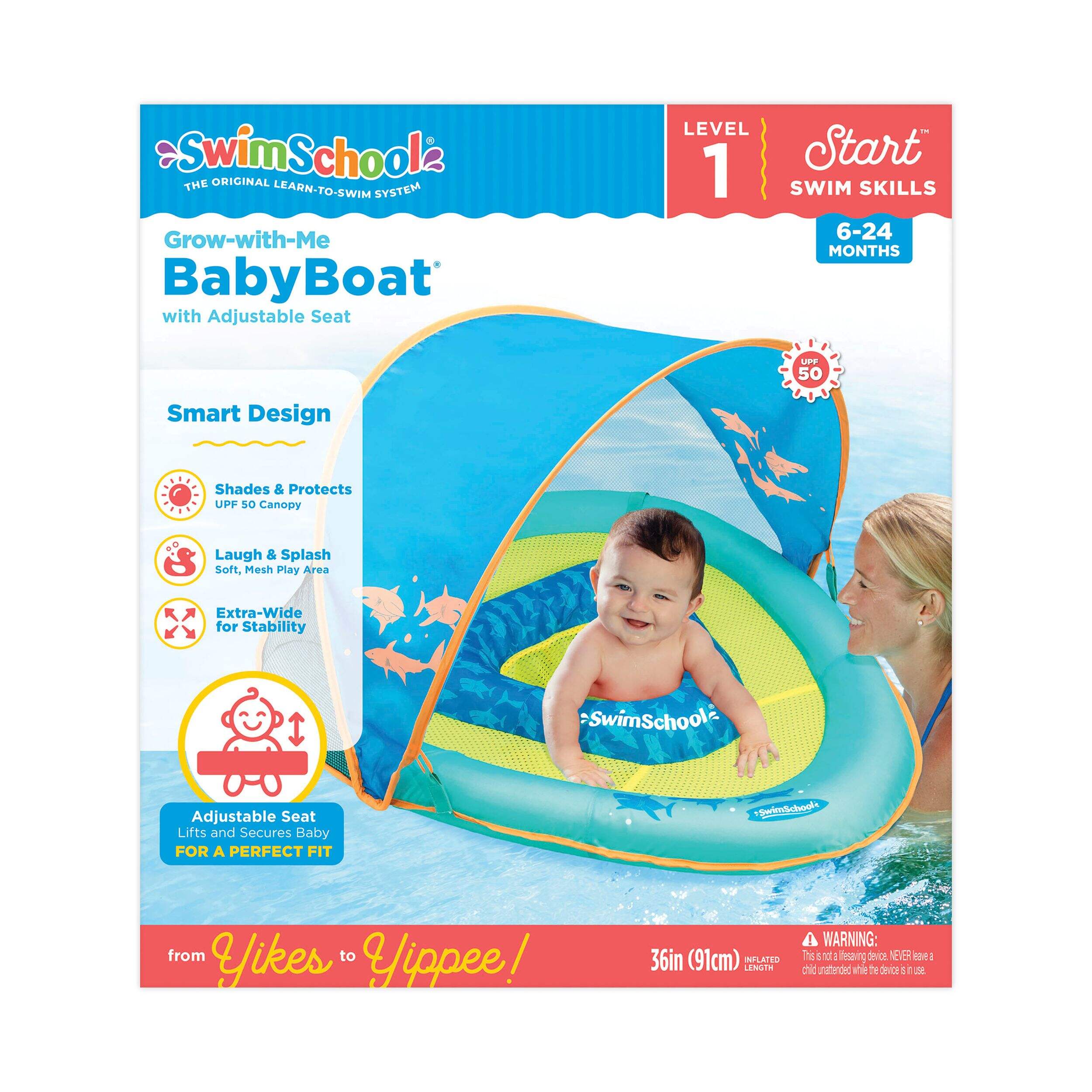 Introduce your little one to water safety and fun with the SwimSchool Grow-with-Me Inflatable Baby Swim Float. Designed for babies aged 6 to 24 months, this float features the Perfect Fit™ seat to gently cradle your child. It includes a removable sun canopy that provides UPF 50+ protection, ensuring your baby is shielded from harmful UV rays. Ideal for pool play or beach outings, it offers comfort and protection for your baby’s first water experiences.