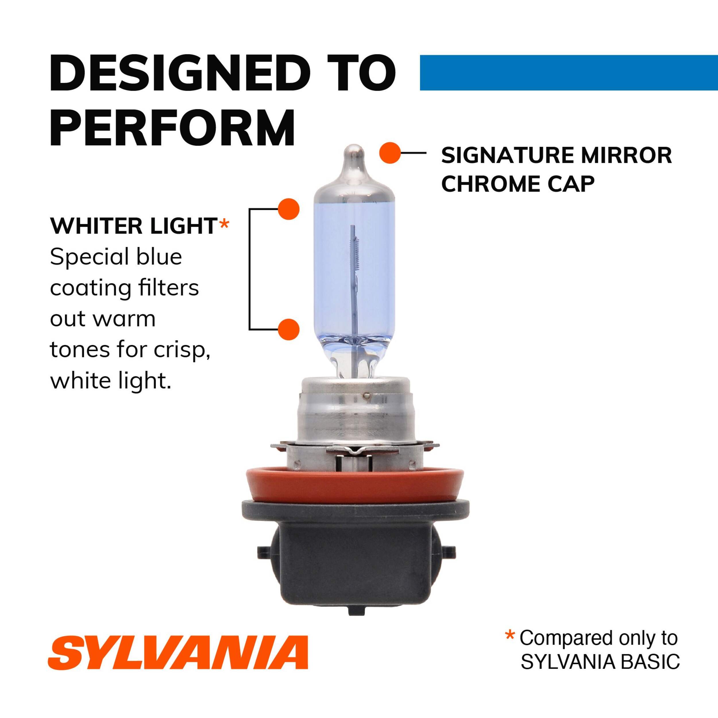 SYLVANIA H11 SilverStar zXe Halogen Headlight Bulbs deliver the crisp, white light and sleek style of HID headlights at a fraction of the cost. Powered by proprietary Xenon halogen gas technology, these bulbs are the perfect alternative for achieving a high-intensity discharge look and feel. The cobalt blue coating enhances light transmission and colour, while the mirror top alloy coating gives your headlights a striking, jewel-like appearance. Upgrade your vehicle’s style and visibility with this premium halogen lighting solution.