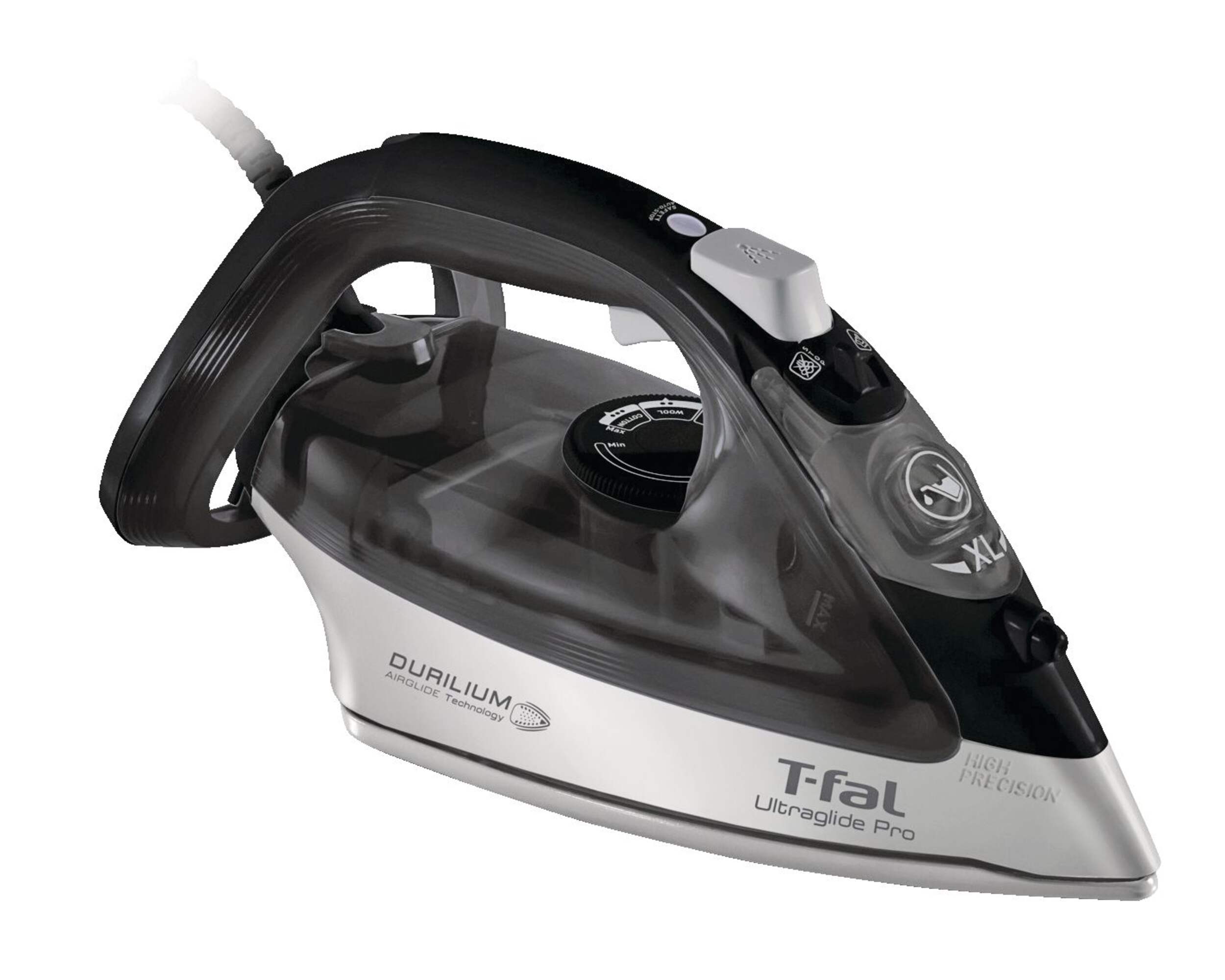 Ultraglide Pro is equipped with our best in glide Durilium Airglide Technology soleplate. The Durilium Airglide Technology invented by T-fal is to make your ironing sessions fast and easy. In addition, the automatic steam regulation, the convenient steam trigger and the specially designed precision tip will provide extra assistance when ironing.