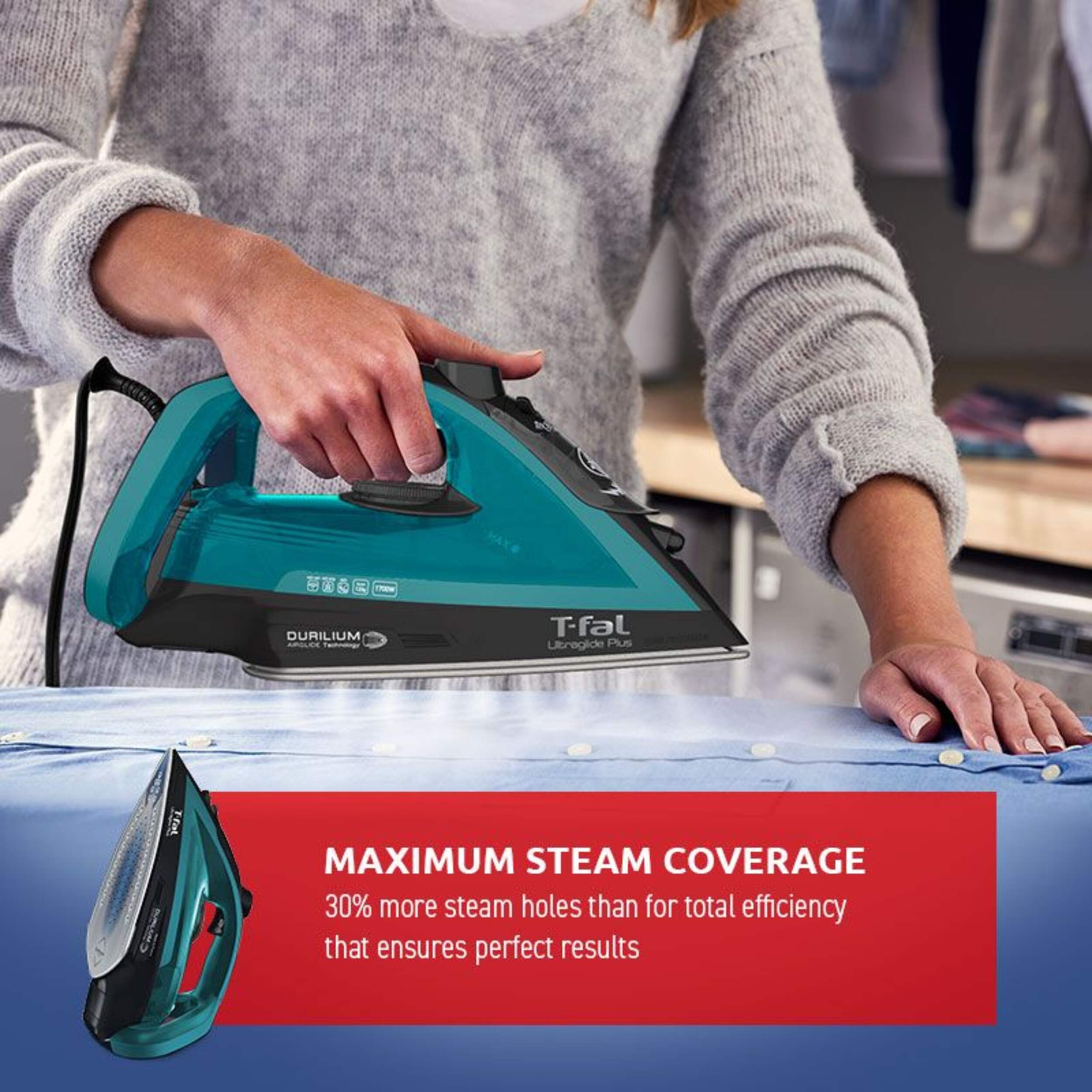 The T-fal UltraGlide Plus Steam Iron was designed for fast ironing with perfect results. This high-performance iron comes fully equipped with the patented Durilium Airglide soleplate for wide steam coverage. High-efficiency steam power tackles stubborn creases and wrinkles so you can get on with your day in crisp, wrinkle-free style. A powerful steam boost gets through even the thickest fabrics, while the safety auto-off feature gives you peace of mind by switching to standby mode when left unattended.