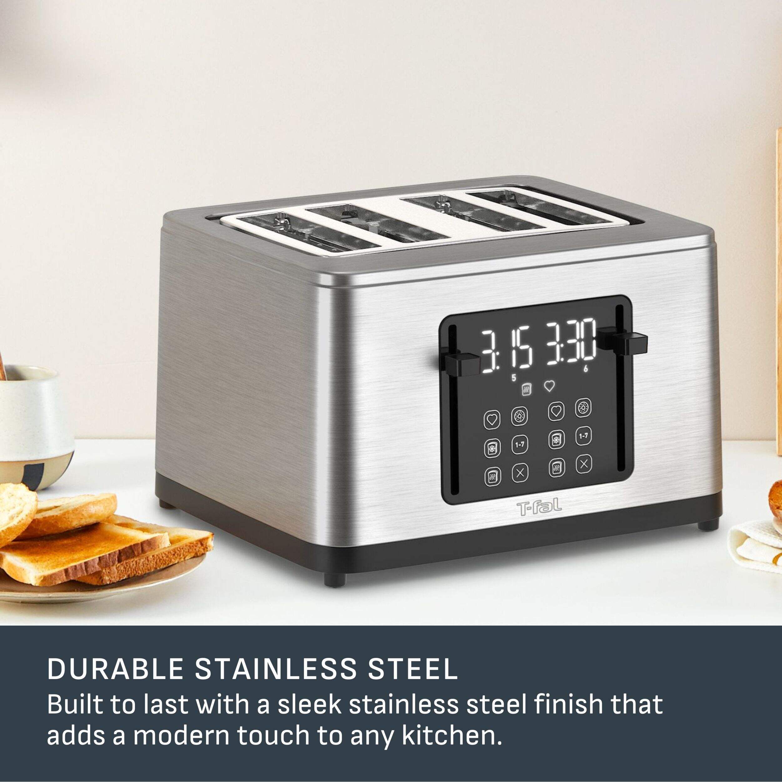 Upgrade your kitchen with the T-fal Stainless Steel 4-Slice Toaster. This sleek appliance features a modern design and advanced functionality, making it a perfect addition to any contemporary home. Enjoy perfectly toasted bread every time with customizable settings and an easy-to-use interface.