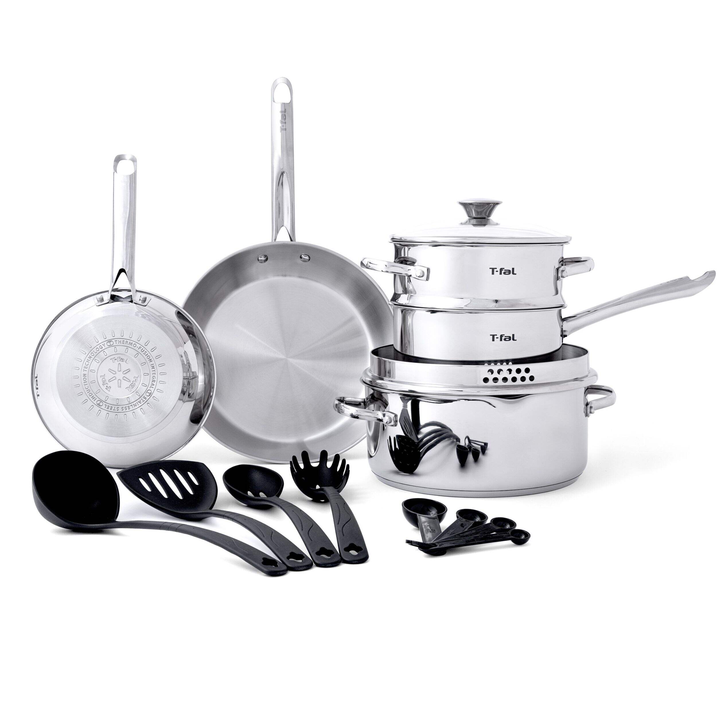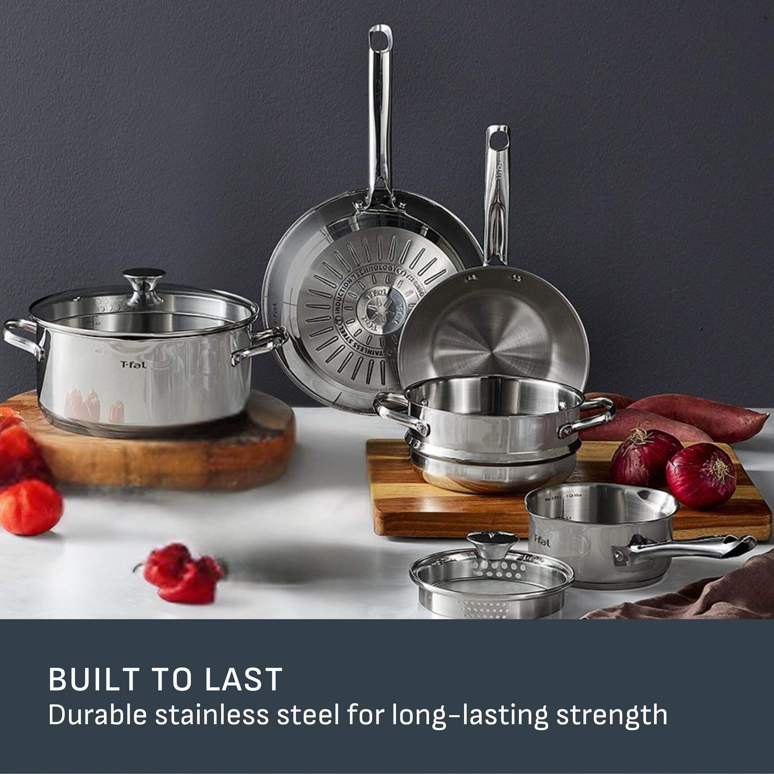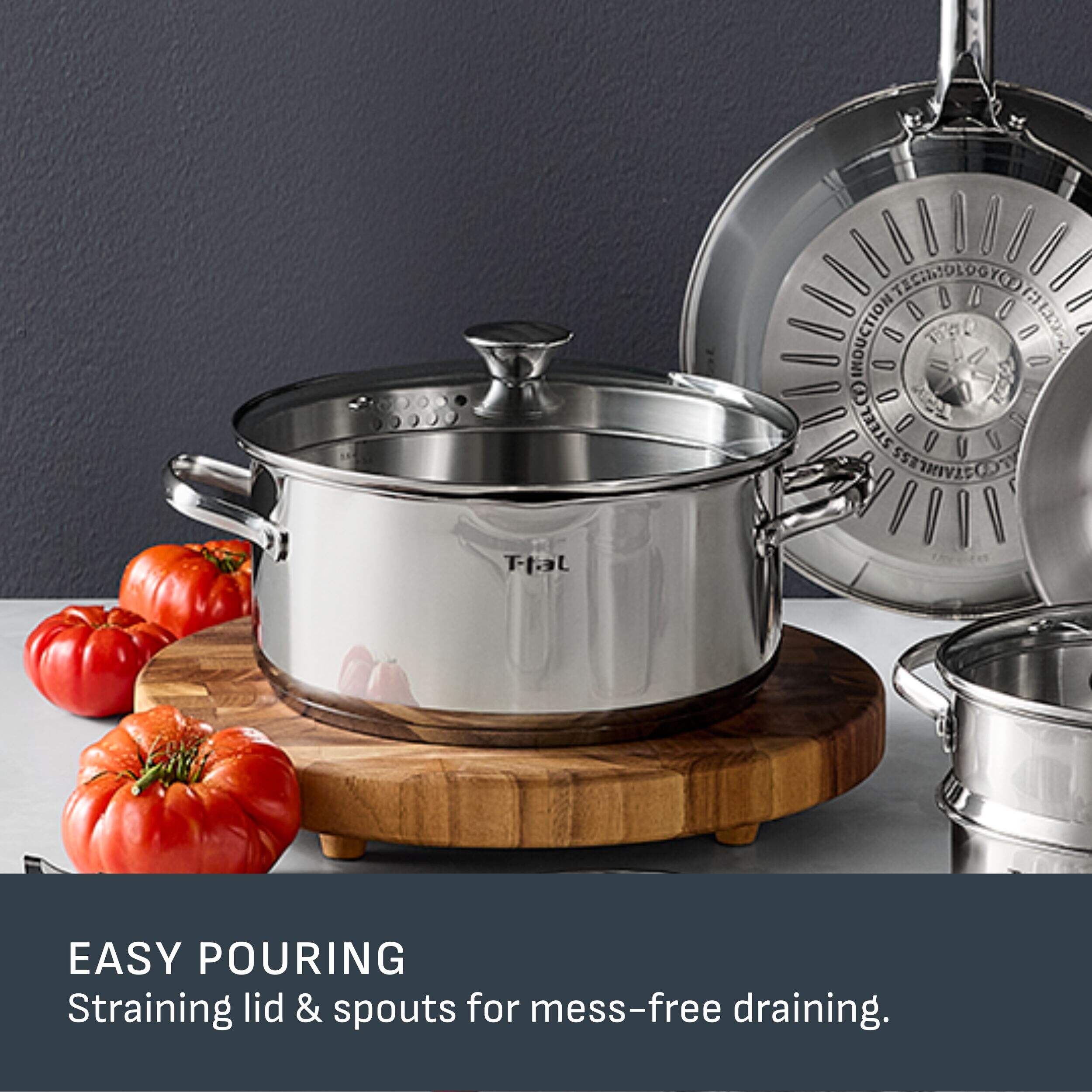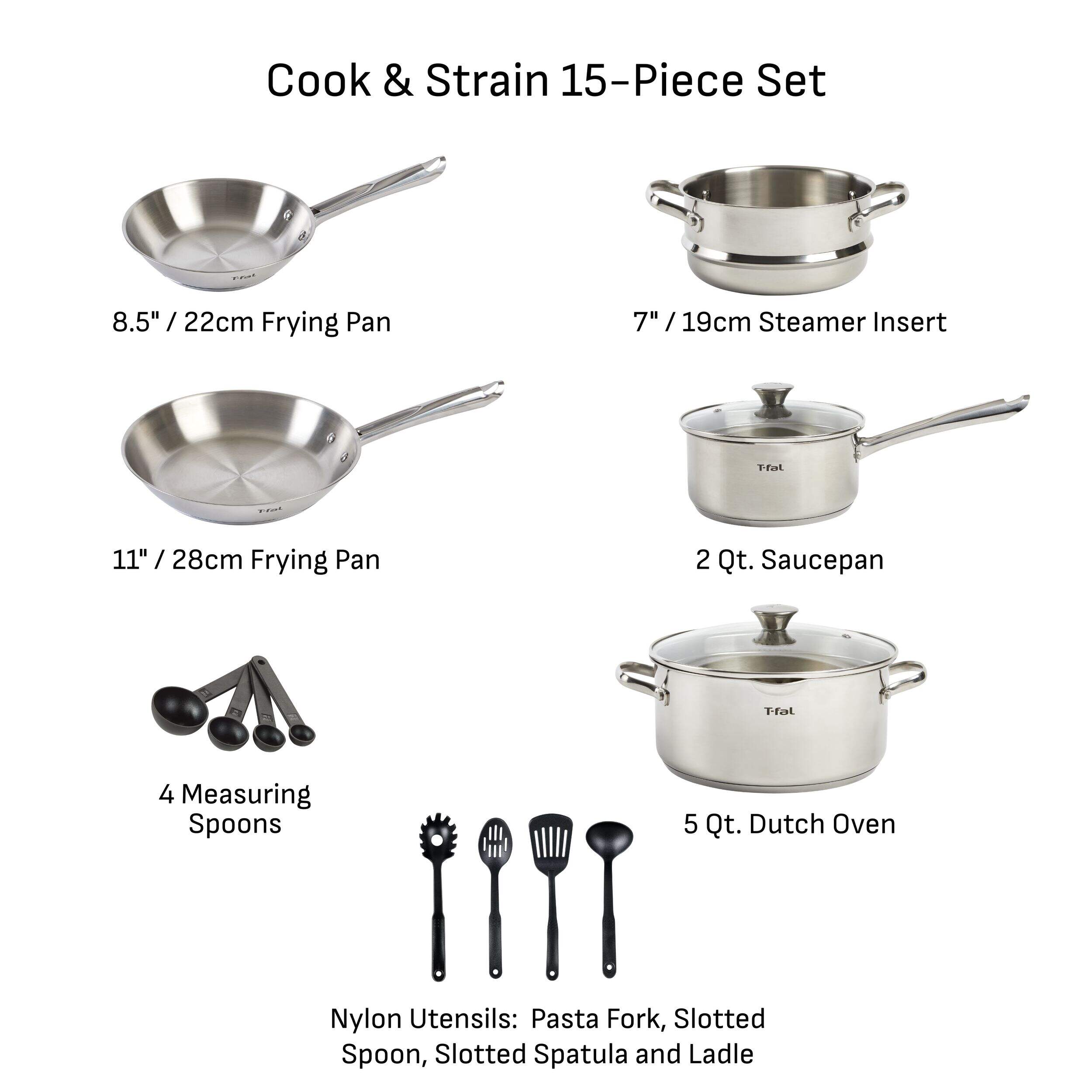 Extra convenience for everyday cooking with T-fal Cook & Strain Stainless Steel 15-Piece Set. Convenient features like straining lids, pouring spouts, measuring marks and riveted Stainless Steel handles make cooking a breeze. Includes 8” frypan, 10.5” frypan, 2.4qt covered saucepan, 5qt covered Dutch oven, 4 Nylon tools, 4 measuring spoons, and 2qt steamer insert. Stainless steel construction ensures long lasting performance and maintains the purity of flavour. Even heat induction base ensures no hot spots. Dishwasher and oven safe up to 500°F; compatible with all cook tops, including induction.
