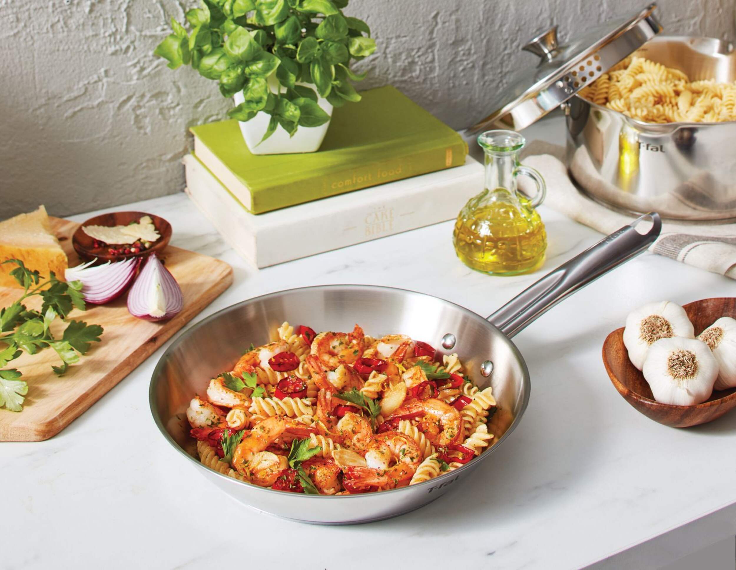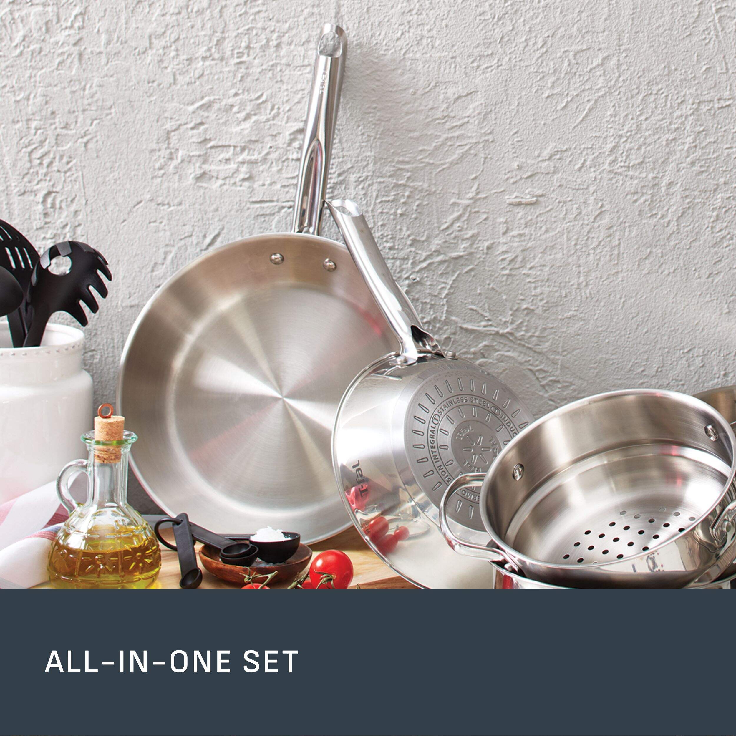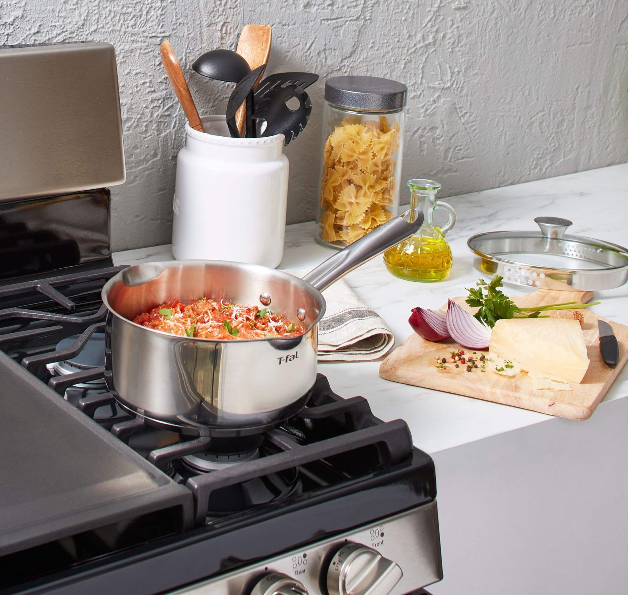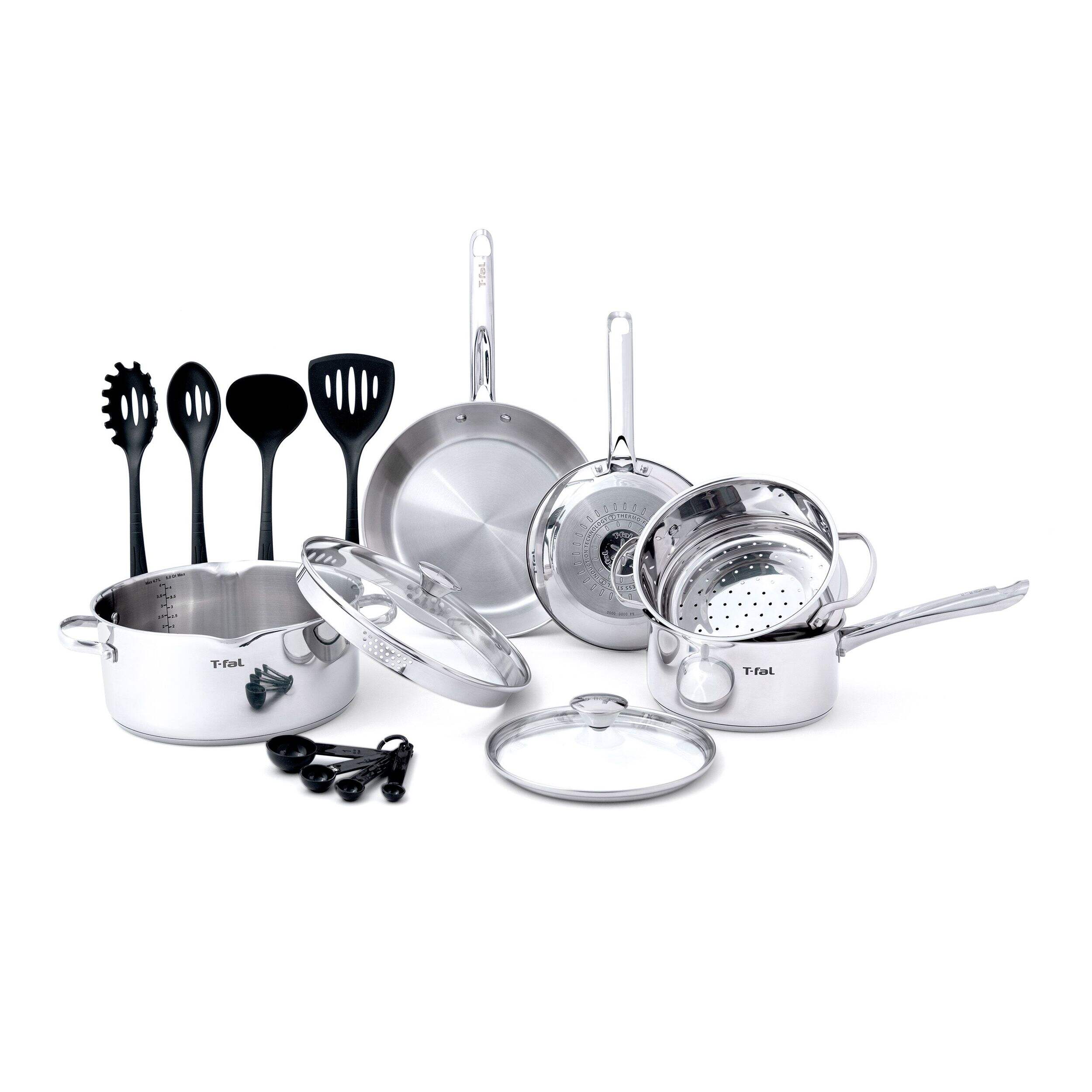 Extra convenience for everyday cooking with T-fal Cook & Strain Stainless Steel 15-Piece Set. Convenient features like straining lids, pouring spouts, measuring marks and riveted Stainless Steel handles make cooking a breeze. Includes 8” frypan, 10.5” frypan, 2.4qt covered saucepan, 5qt covered Dutch oven, 4 Nylon tools, 4 measuring spoons, and 2qt steamer insert. Stainless steel construction ensures long lasting performance and maintains the purity of flavour. Even heat induction base ensures no hot spots. Dishwasher and oven safe up to 500°F; compatible with all cook tops, including induction.