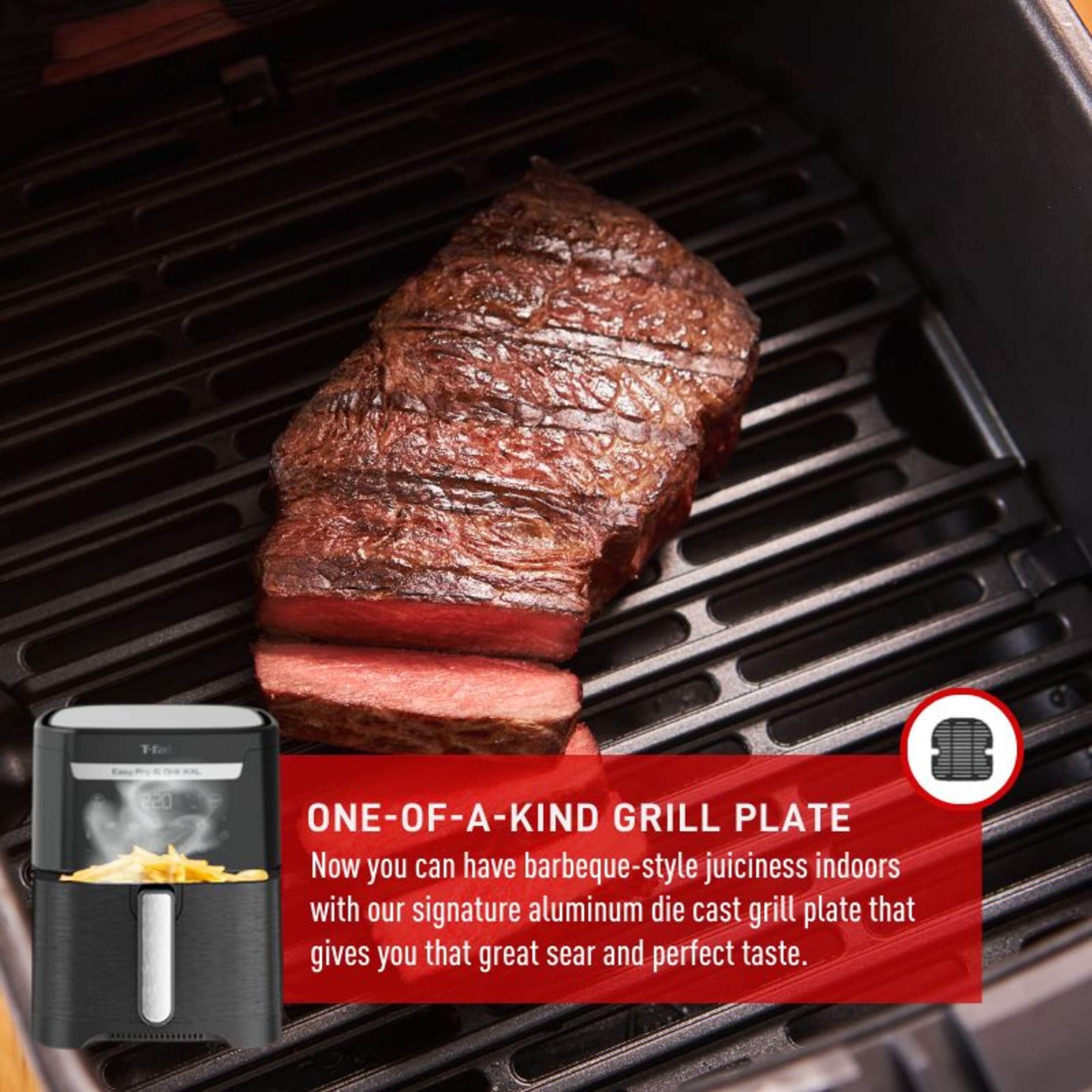 Enjoy that juicy grilling taste with the one-of-a-kind, die-cast aluminum Sizzling Grill Plate (98% less smoke than a classical grill)