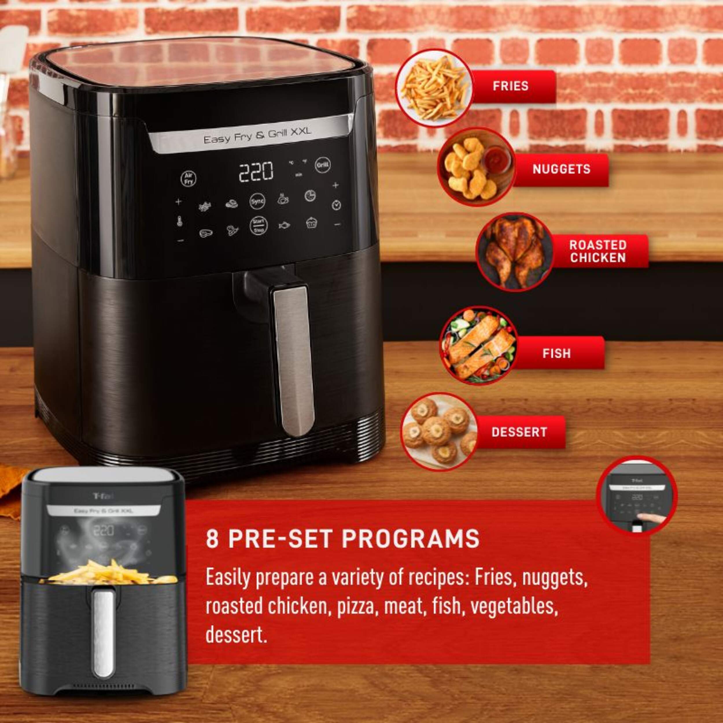 8 different pre-set programs: You can easily prepare a variety of recipes such as fries, nuggets, roasted chicken, pizza, meat, fish, vegetables, dessert