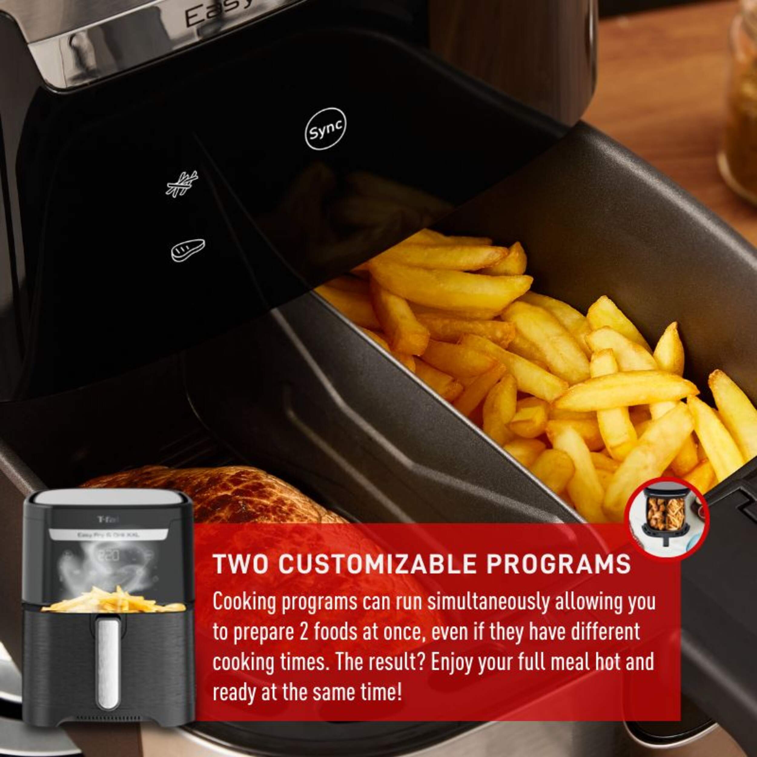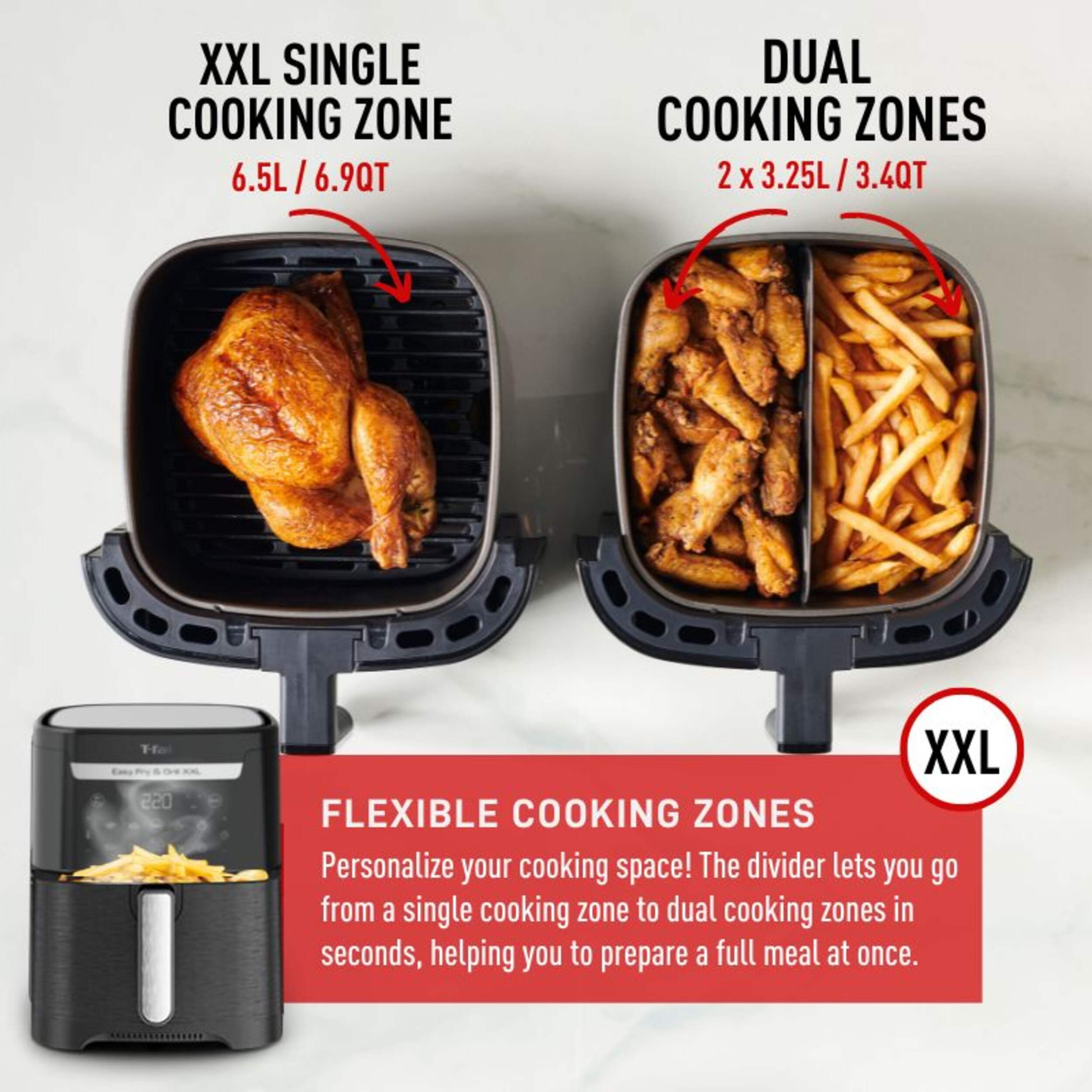 Easy Fry & Grill Flexcook XXL is T-fal's first air fryer with a flexible cooking zone. Easily switch from one XXL cooking zone to two cooking zones in seconds by adding in the divider, letting you prepare 2 meals at once, even if they have different cooking times.