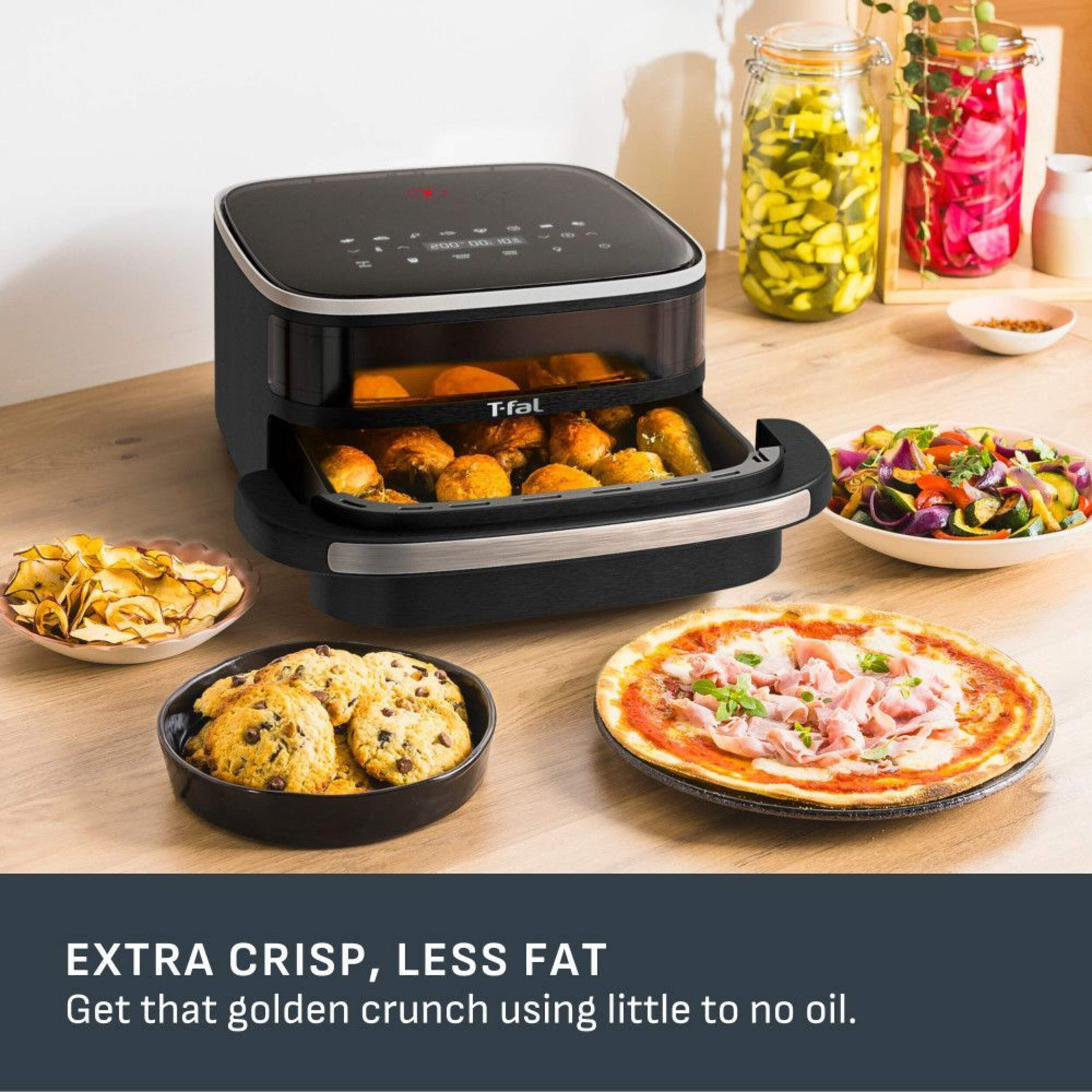 Discover the convenience and versatility of the T-fal Easy-Fry Compact Air Fryer. Perfect for small kitchens, this air fryer offers a sleek design and a spacious basket that can accommodate up to 25 chicken wings or 1KG of French fries. With its digital display and viewing window, you can easily monitor your cooking progress, while the dual heater ensures optimal results every time. Enjoy a variety of meals with 10 cooking presets, making it simple to prepare everything from pizza to cookies.