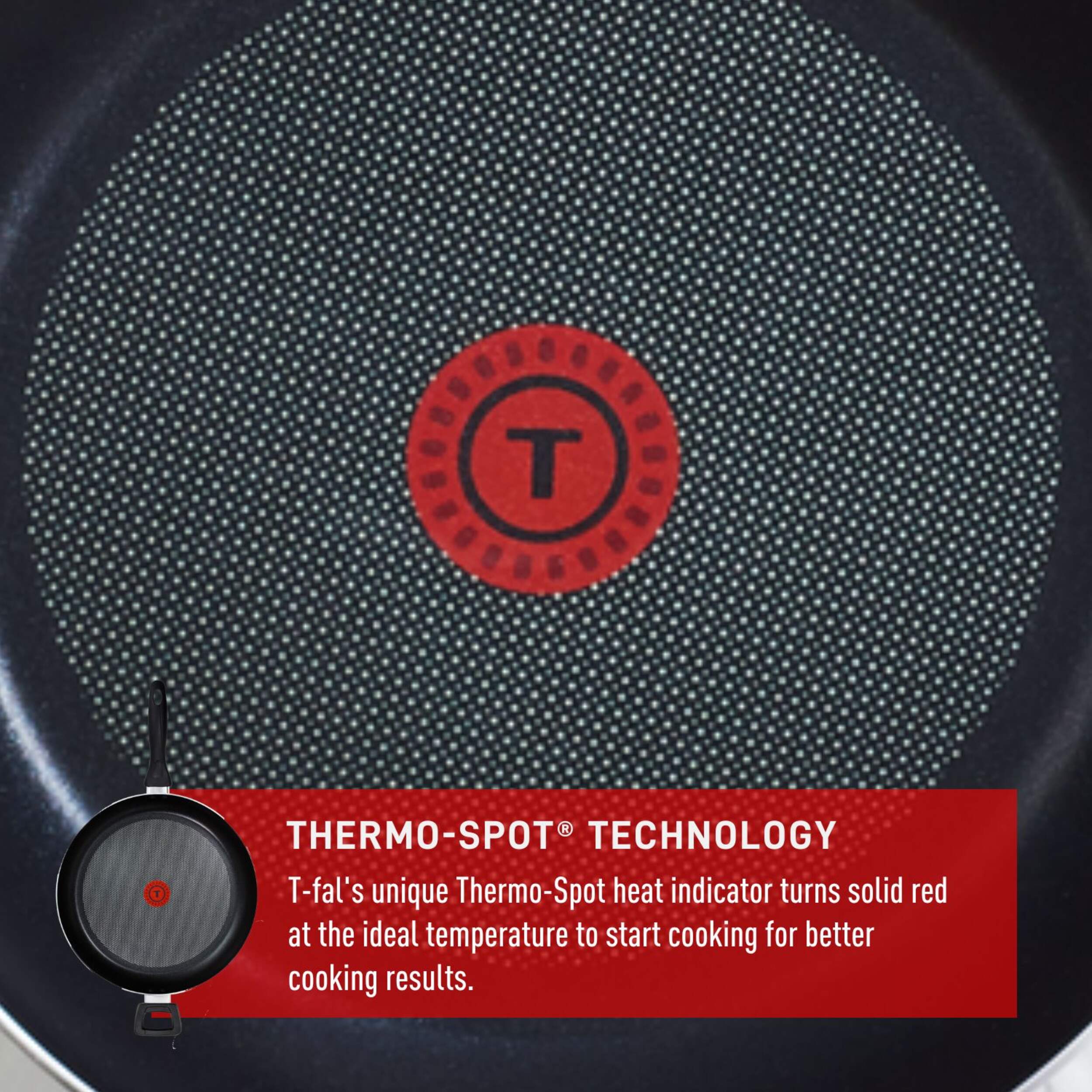 Unique Thermo-Spot heat indicator turns solid red at the ideal temperature to start cooking