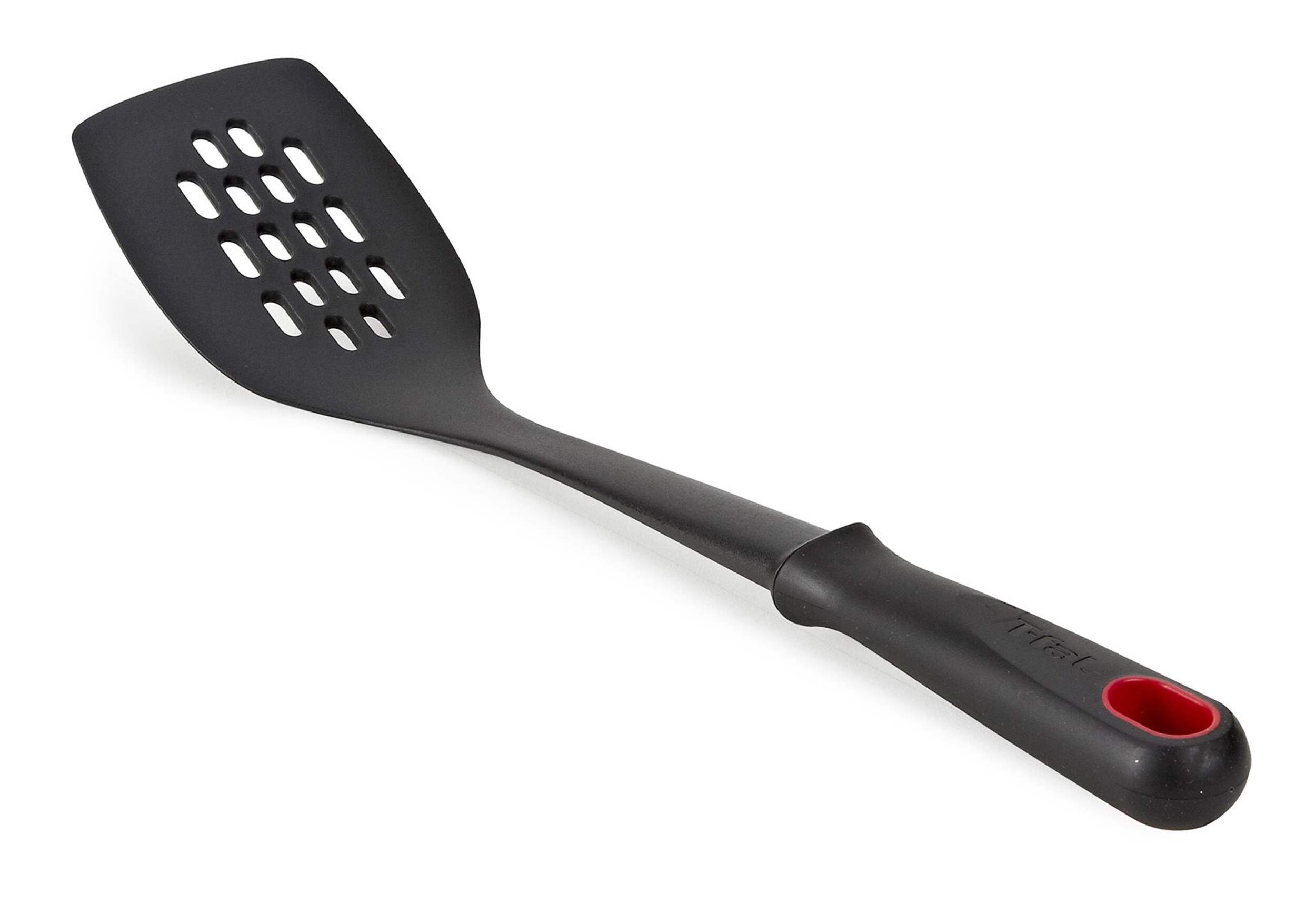Update your collection of cooking utensils with the T-fal Nylon Turner. A must-have for the modern home, it is ideal for flipping flapjacks, eggs and other food. Multiple holes in the face allow for safer flipping while providing convenient drainage for oil and grease. This kitchen turner also has a long, ergonomic handle that delivers a comfortable, heat-resistant grip.T-fal turner allows for safe flipping of hot food. Holes for draining oil and grease. Long, ergonomic handle with a hanging hook hole, is a must-have for modern homes