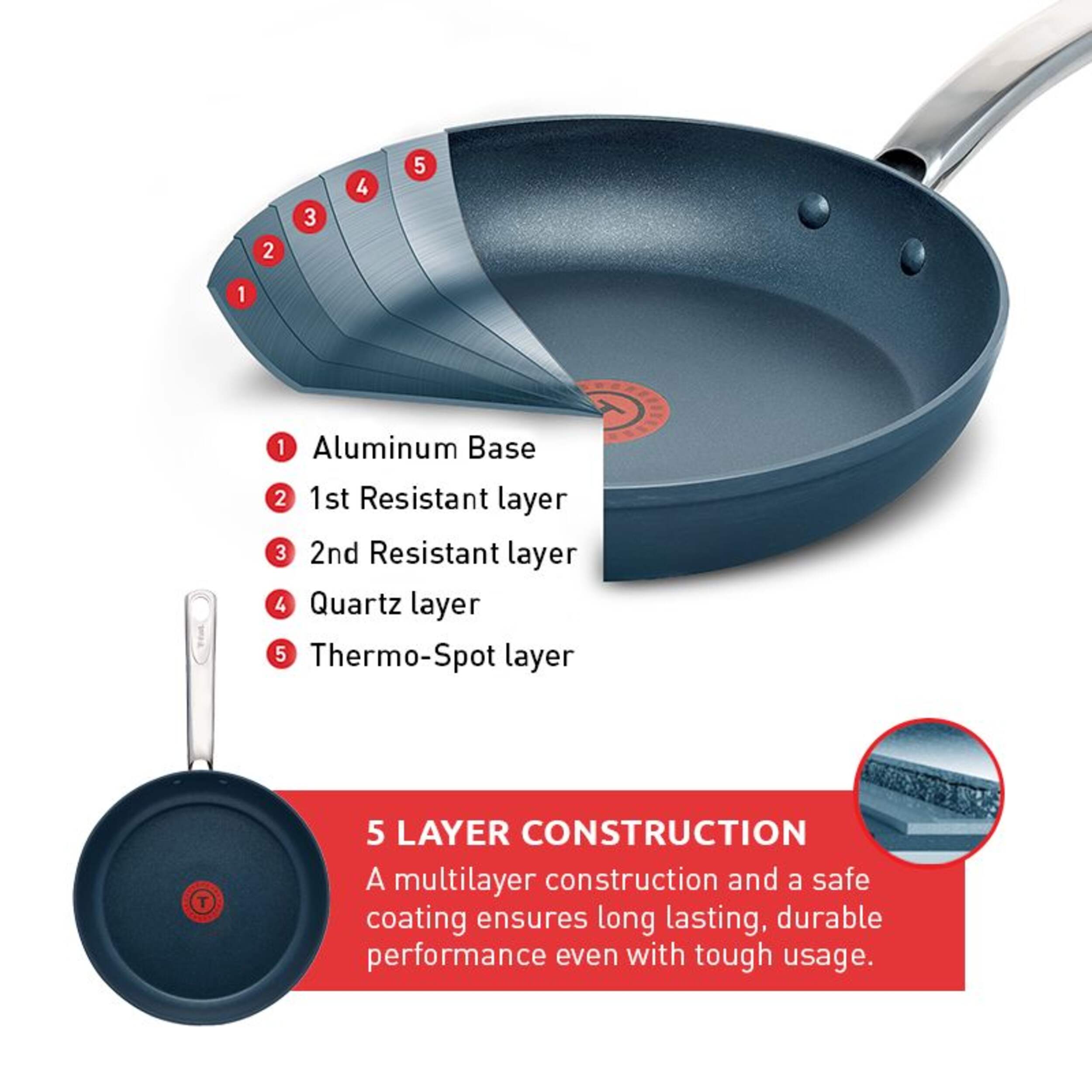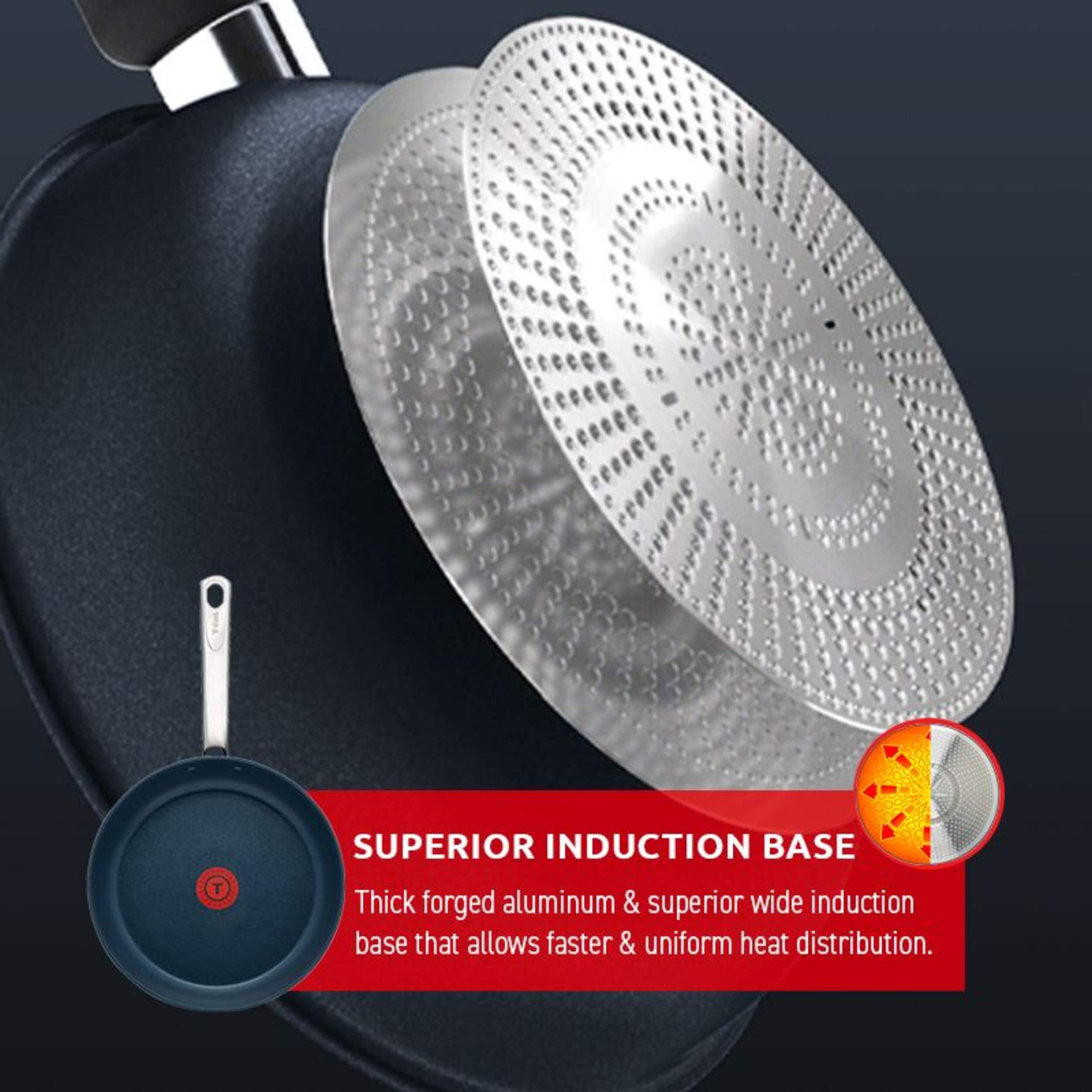 T-fal Platinum Multi-Layered Forged Non-Stick Frypan features a thick forged aluminum and superior wide induction base that allows faster and uniform heat distribution