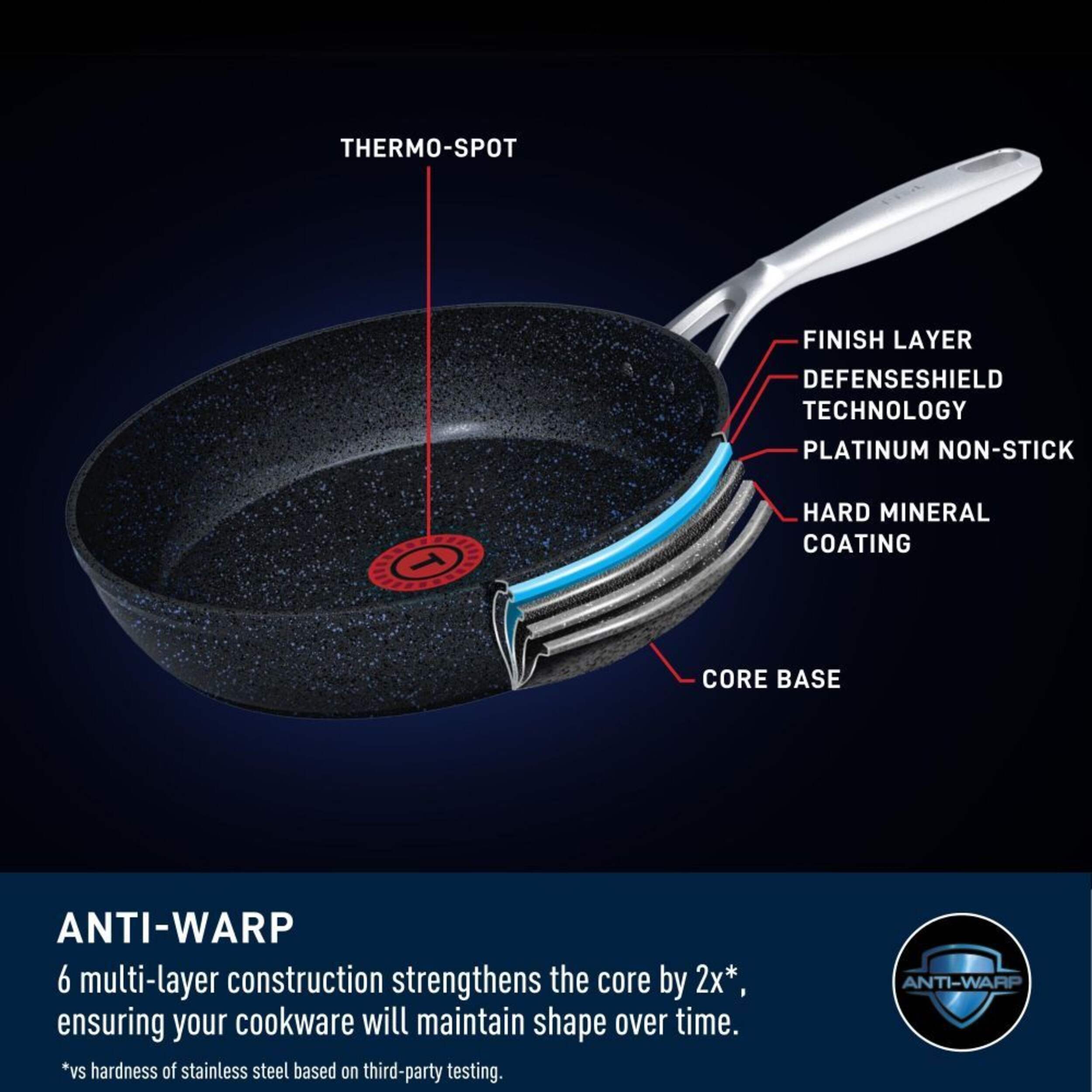 Introducing the T-fal StoneShield 10-pc Cookware Set, designed to revolutionize your kitchen with cutting-edge technology. This set features an advanced non-stick coating, offering exceptional durability with up to 20 years of intensive use. The cookware's multi-layer construction prevents warping, ensuring it retains its shape and performance over time. Its rugged, rock-textured surface makes it even more resilient, while being oven-safe and compatible with all cooktops, including induction.